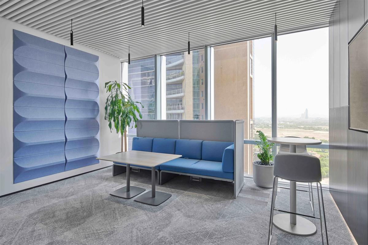 新的工作环境特别强调了包容性和社交空间,通过设置声学静音舱为个人工作和会议提供了安静的空间,显著提高了员工的舒适度和工作效率。员工用餐区配备了专业的厨房设施和模块化设计的咖啡机,不仅提供了迷人的用餐体验,还能让员工在享受美食的同时,俯瞰迪拜独特的市中心区。