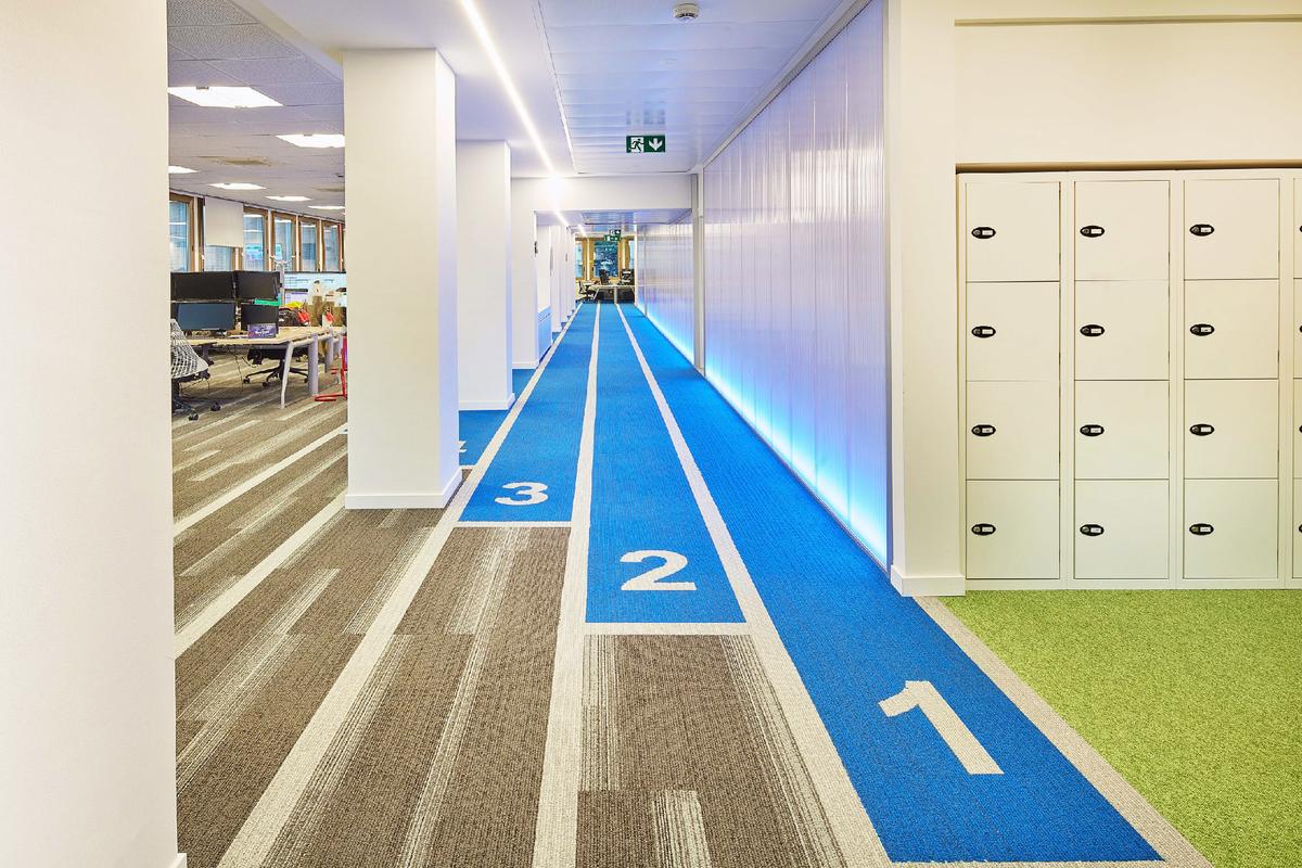 从地下一层到五层,每层楼都化身为不同的运动赛场——足球、篮球、水球、橄榄球、网球、田径……设计师用色彩、家具、动态图形、Interface地毯的创意拼接,把办公空间变成了一个巨型“体育主题乐园”。