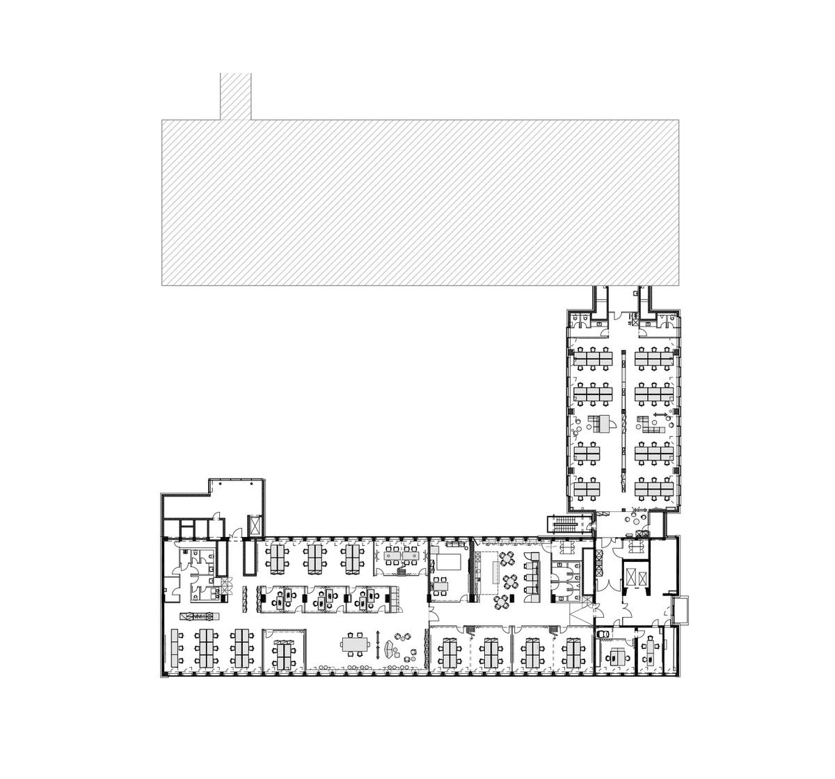在与埃森哲的紧密合作下,这一办公空间最终实现了超高比例的公共交流区域配置。由于新冠疫情影响,规划方案不得不持续进行调整。随着远程办公的普及,慕尼黑办公场所已逐渐转型为工作坊、项目会议和办公活动的核心枢纽。这种创新办公空间所承载的混合工作模式,正是埃森哲工作理念的最佳实践。