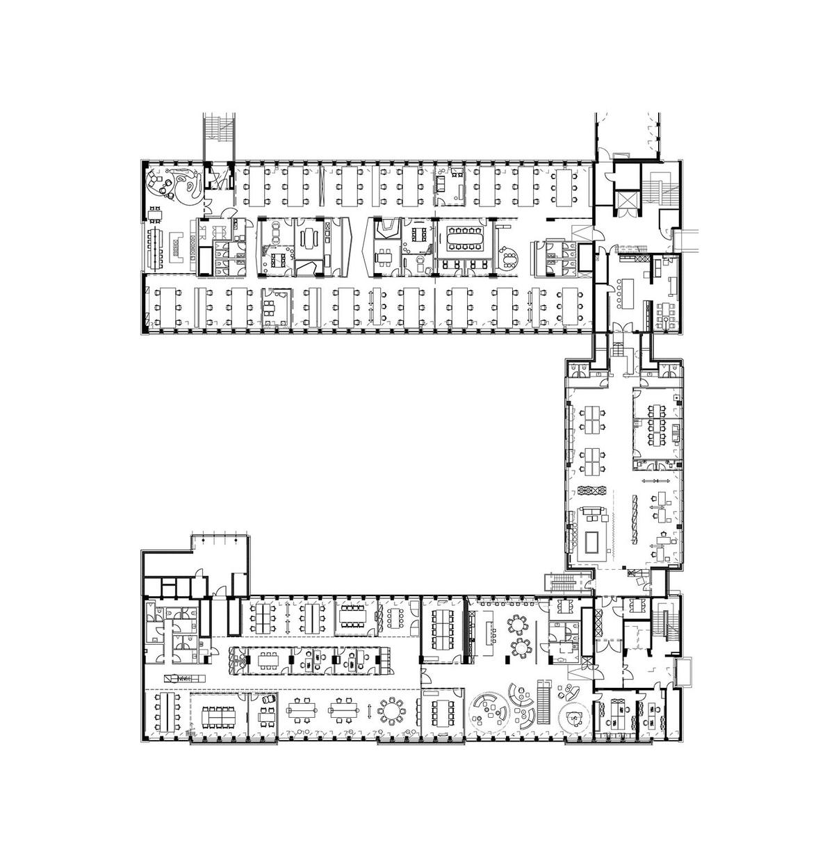 功能分区顺应现有建筑几何形态自然生成,公园与广场区域被战略性地布置在U型建筑群的连接转角处,既缩短了动线距离,又促进了员工间的沟通互动。