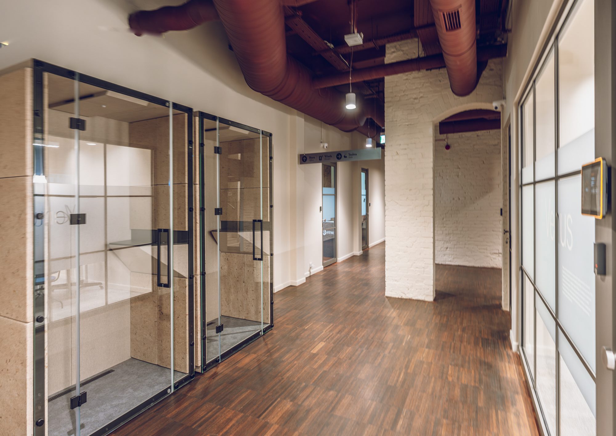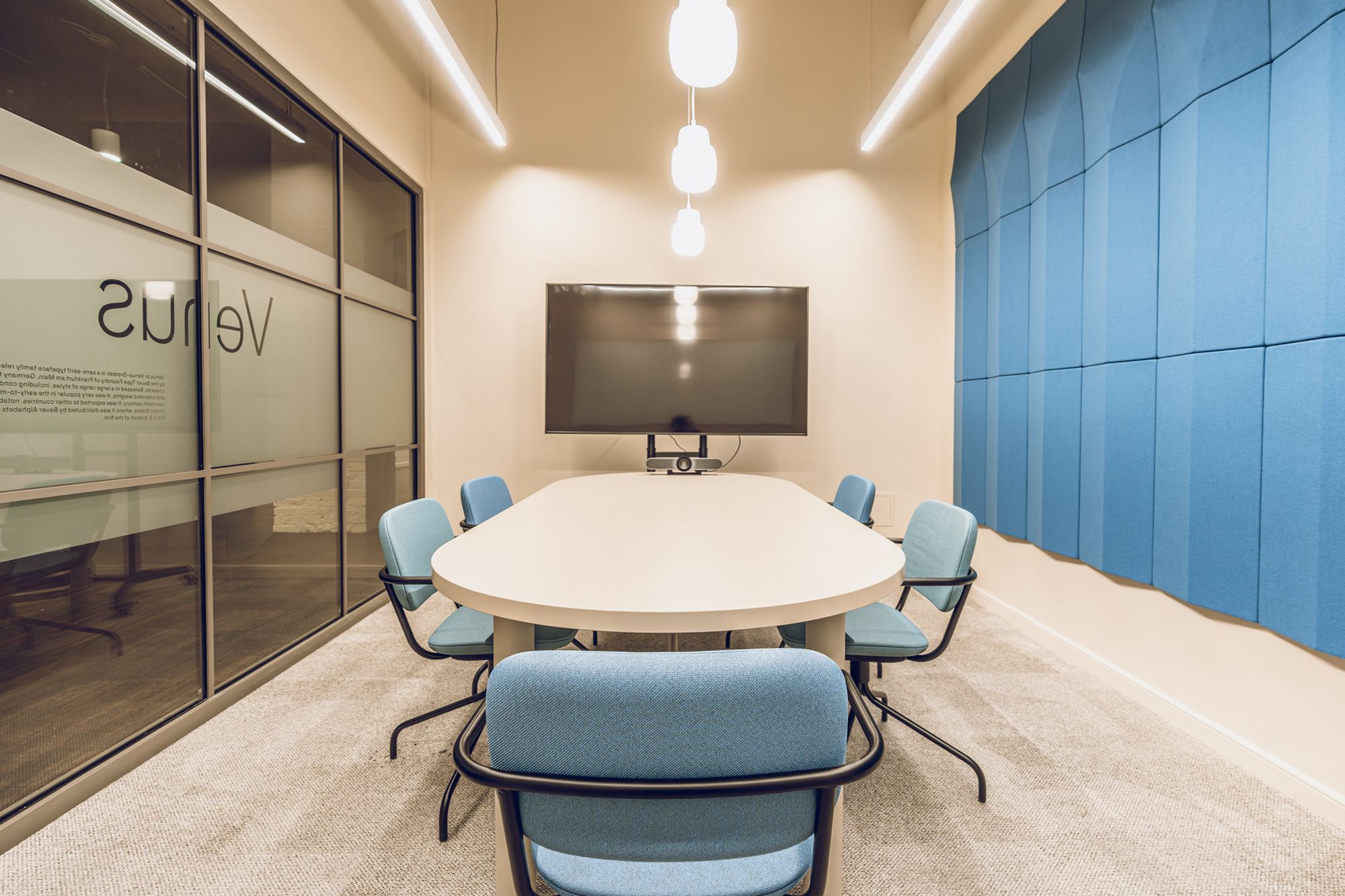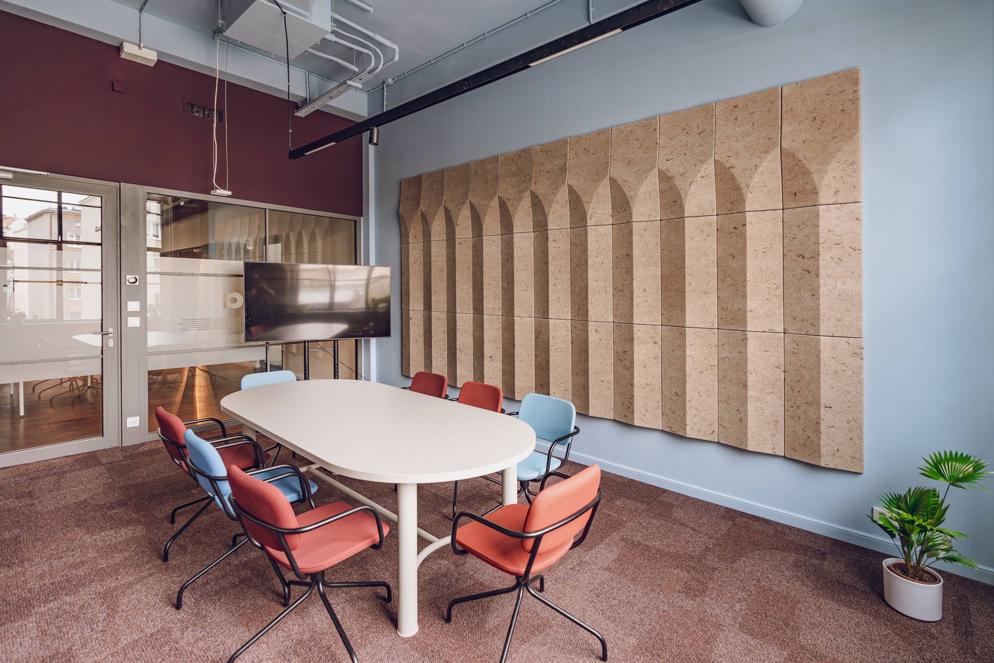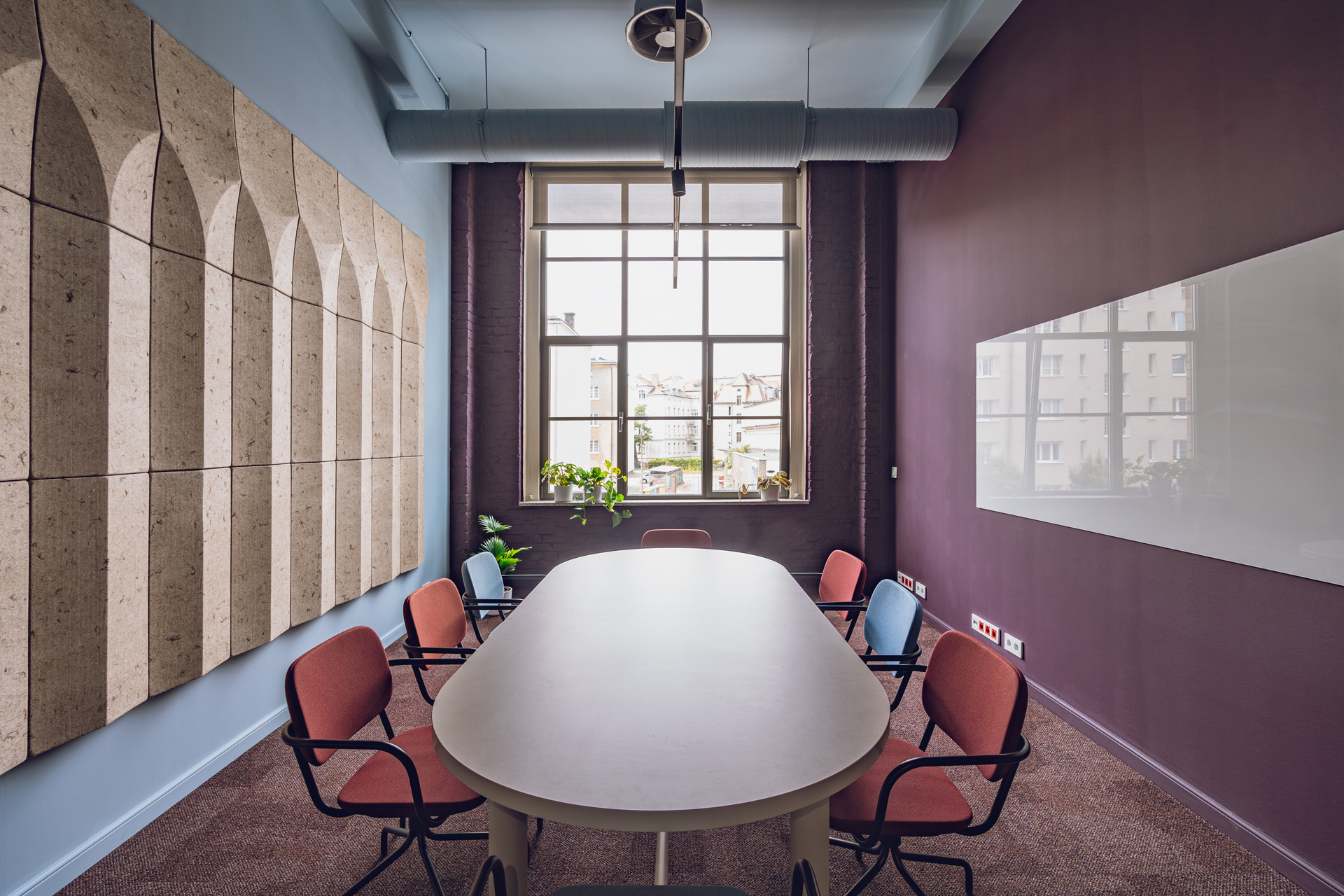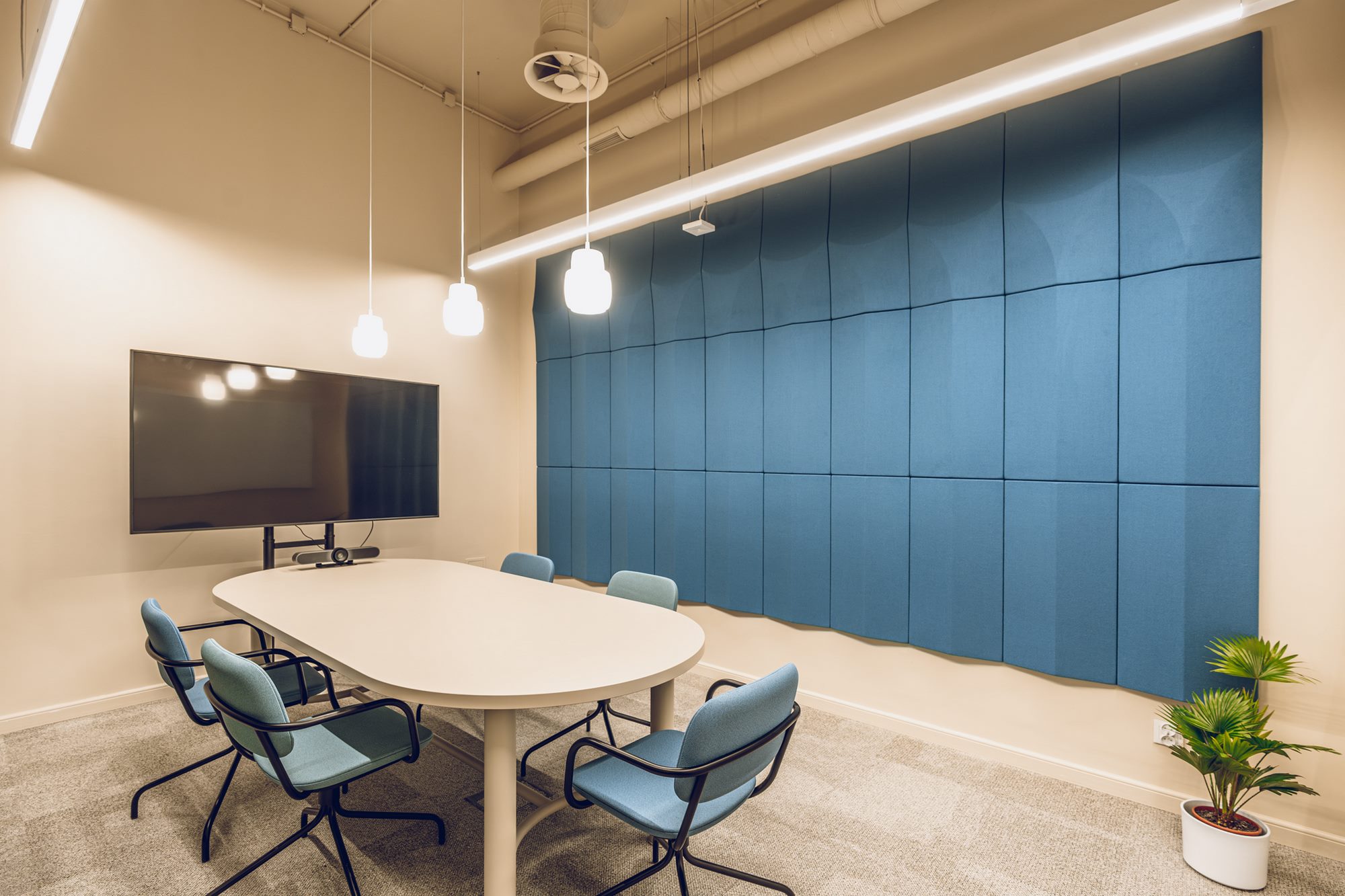 声学处理在会议室中至关重要——设计旨在营造舒适的工作环境,同时避免完全隔音带来的压抑感。基于专业声学分析,设计团队精选了材料设备,尤其是天花板与墙面的吸音面板。此外,走廊空间设置了语音降噪达A类等级的声学舱,其表面采用压缩麻纤维制成的生态板材,吸音系数高达α=0.90。