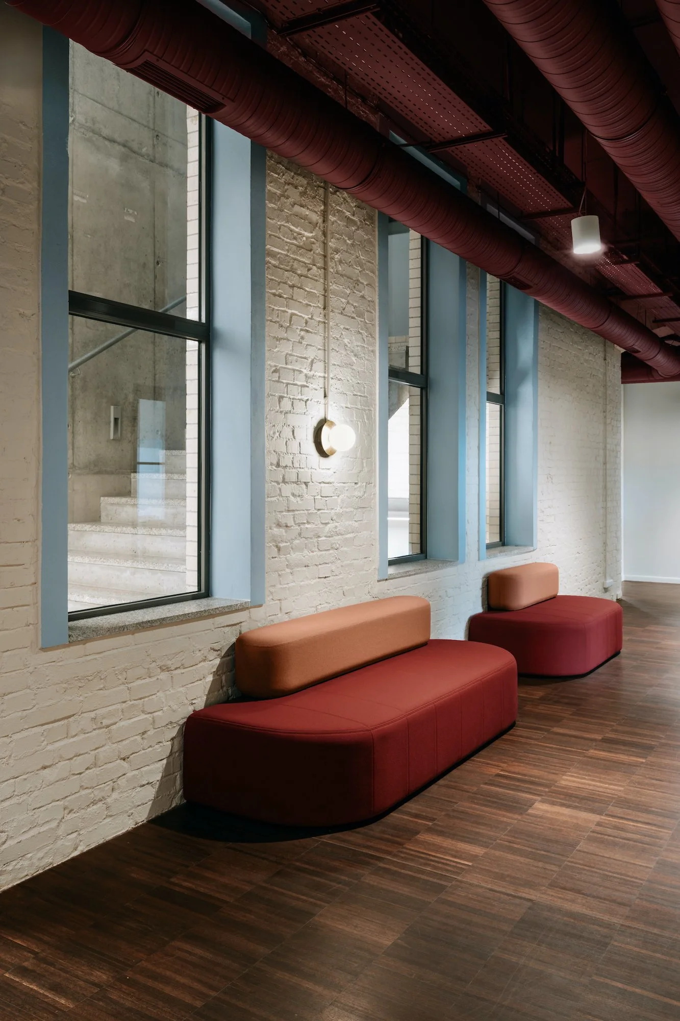 然而家具与家具之间亦有高下之别。设计团队极度重视选择符合其价值观的家具:所有会议室均配备Profim品牌的Normo座椅,其设计遵循循环经济原则——采用回收材料制造,且可轻松拆解进行二次回收。接待区与走廊采用的Revo poufs系列其设计也秉持相同理念。设施中数量最多的办公椅和办公桌均获得EPD(环境产品声明)认证,并确保每件家具的面料均采用98%的再生聚酯纤维。建筑内更大量使用二手家具,从扶手椅、橱柜到装饰照明灯具皆有涵盖。