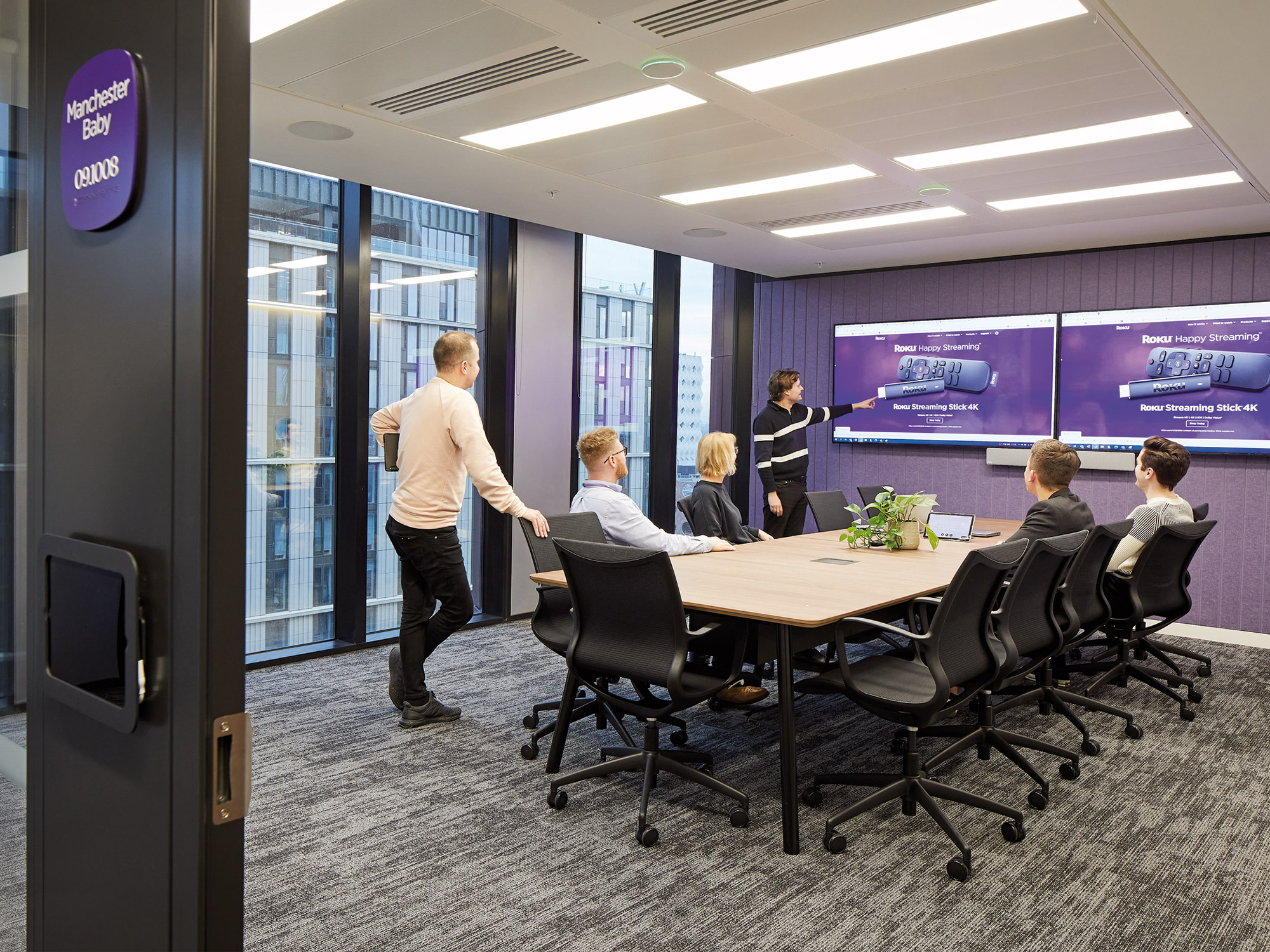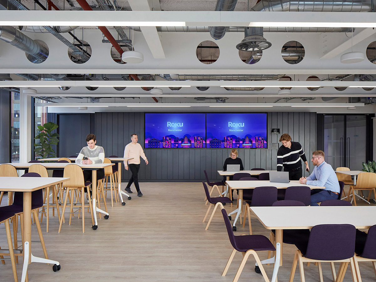 Roku曼彻斯特总部的落成标志着其在英国的关键性扩张,于Circle Square创新园区建立其重要枢纽。该办公空间横跨6.410平方米,配备尖端科技实验室、声学测试舱及客户接待区,服务于数字科技与工程领域。