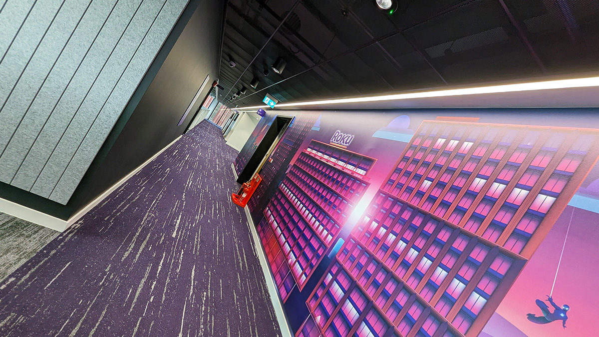 作为全球统一品牌标识的Roku,其专属紫色与曼城街区历史、娱乐主题交融,通过沉浸式图文呈现于空间各处,甚至融入地面及会议室命名体系。充裕的灵活活动空间既可举办全球全员大会,也能承办外部科技盛会。专属的面试房间同步展示Roku产品魅力,让求职者提前体验未来工作场景。