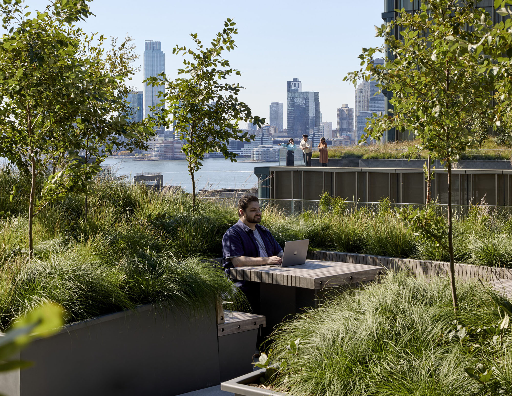 建筑上部以重重退阶形式层层递进,SOM与SCAPE景观设计公司携手打造出一系列错落有致的景观露台。于此高度,曼哈顿下城独具特色的水塔与库房屋顶景观在眼前恢宏展开。双塔之间环抱着一个协作楼层,此处拥有最为开阔的露台,以及一个位于中央、通透明亮的玻璃围合公共空间——被誉为“Great Room宏伟大厅”。这里作为垂直园区的核心,容纳了一系列会议室,以及一个可用于放映、活动与炉边谈话的多功能剧场。