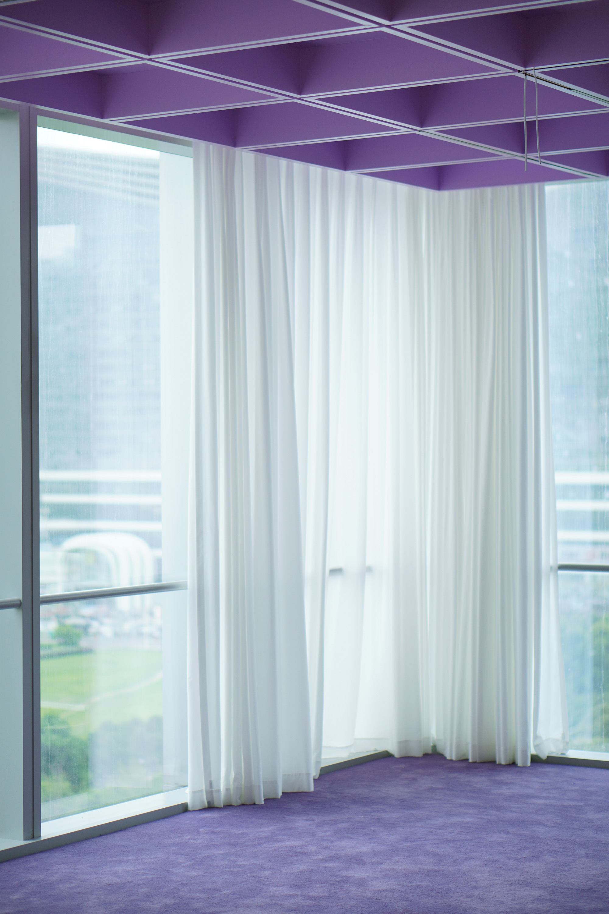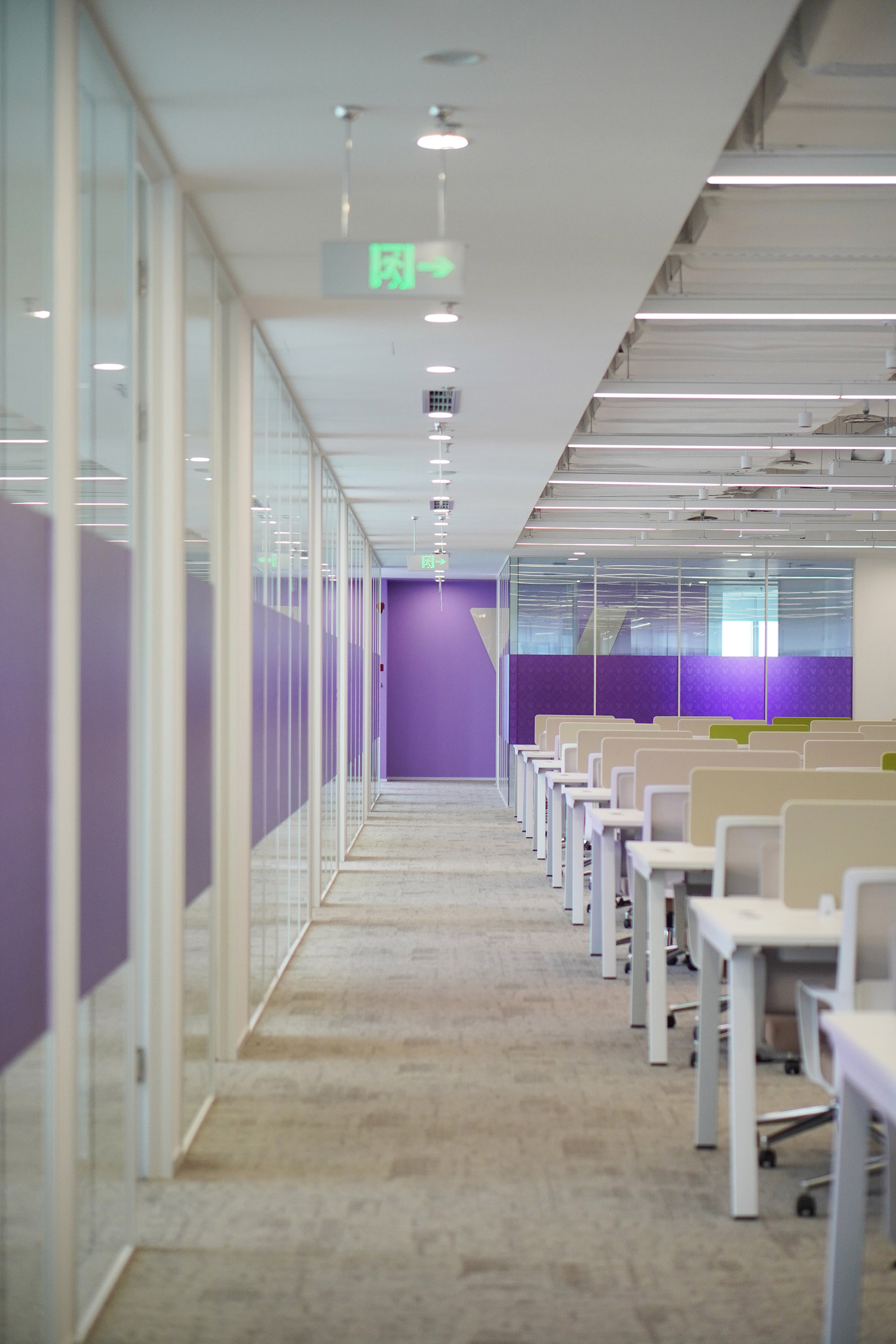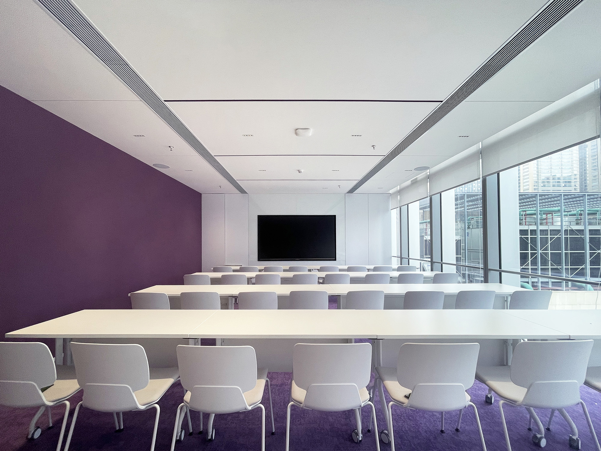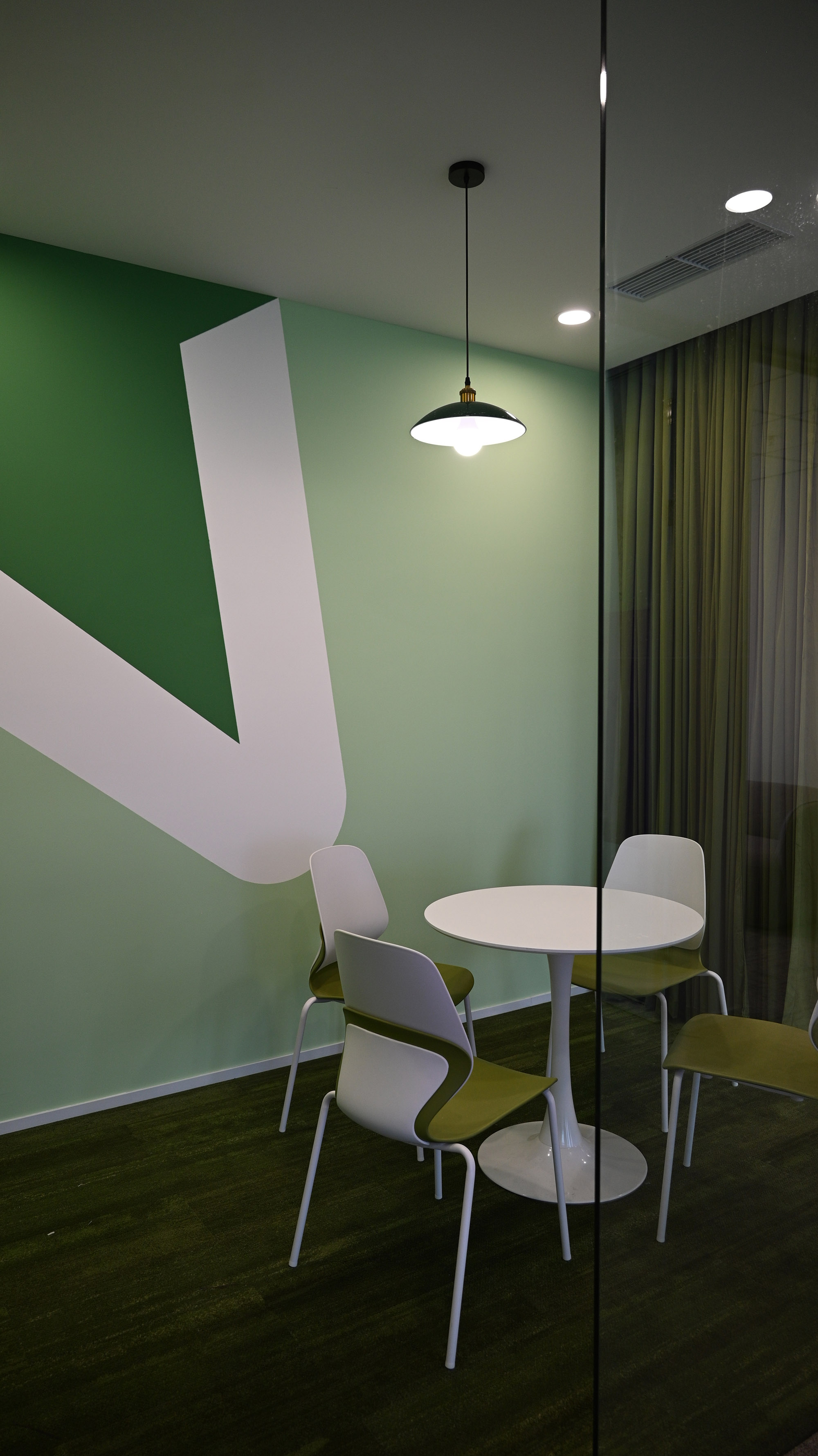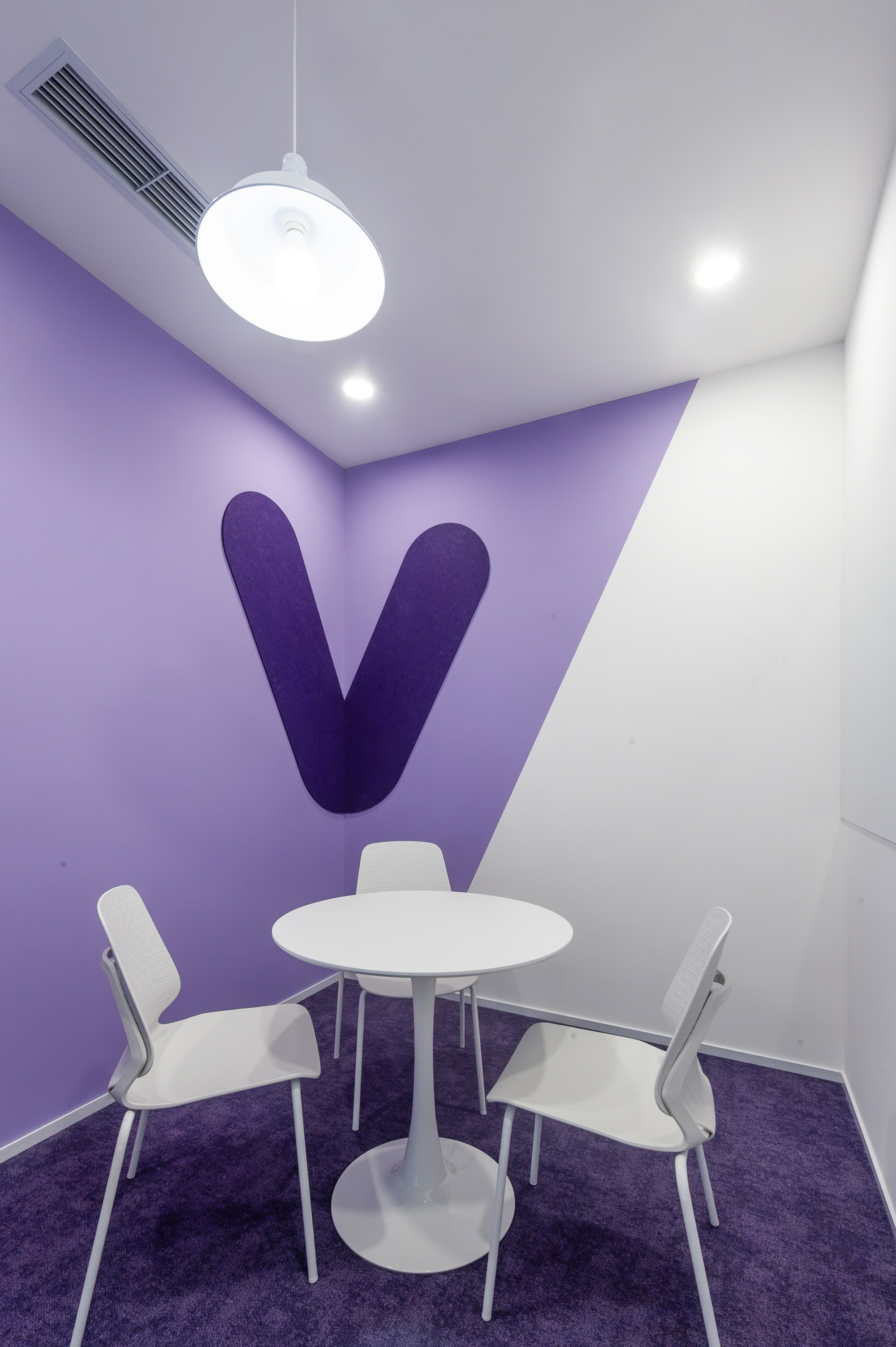 大培训室/中会议室/小洽谈室三阶布局,适配多元场景;吸音板拼贴出唯怡LOGO「V」「E」抽象造型,乳胶漆跳色墙面延续紫绿脉络;彩色落地帘与同色系地毯,构成动态艺术装置。