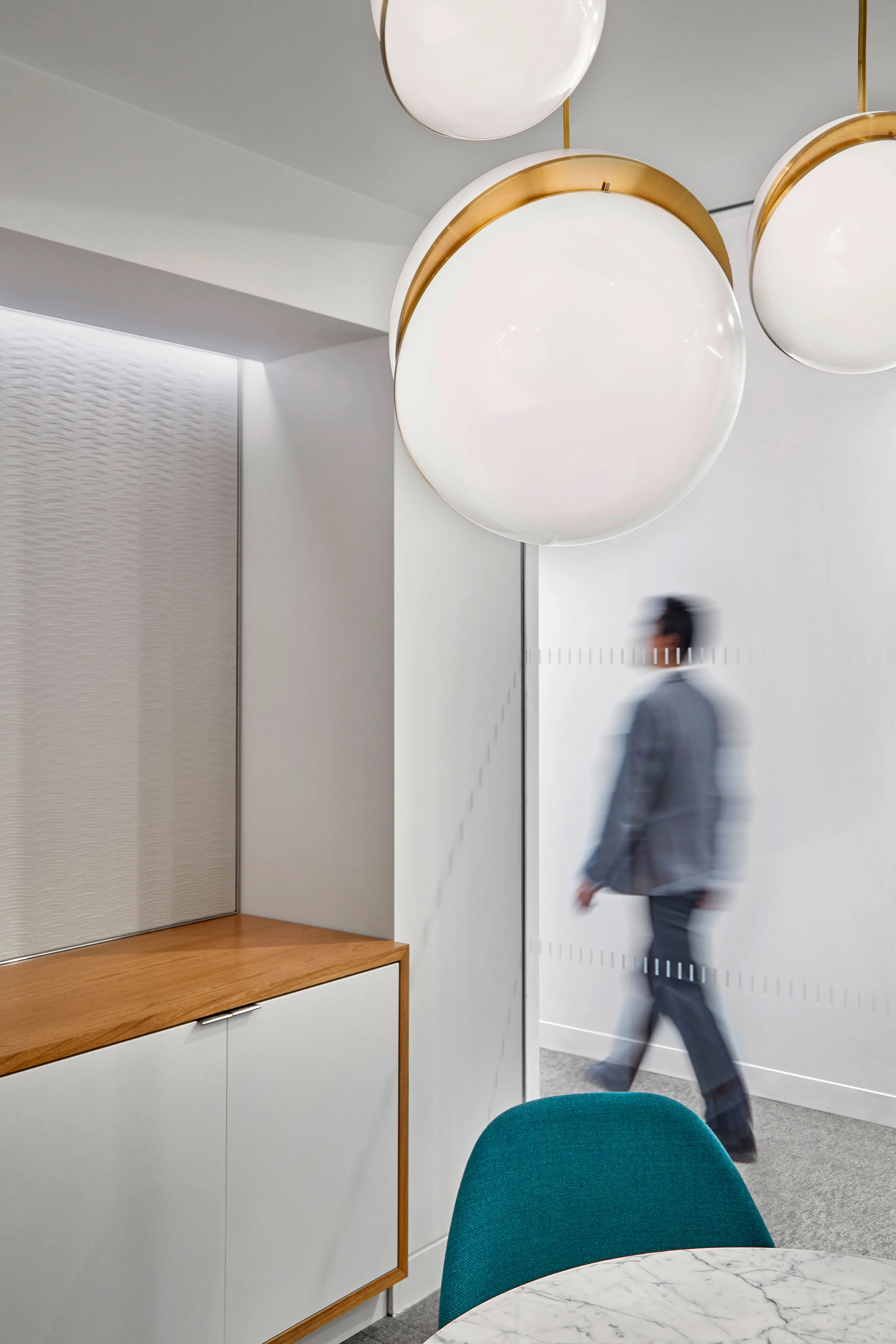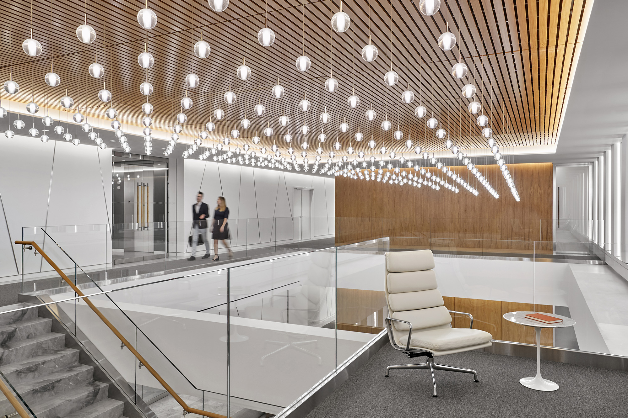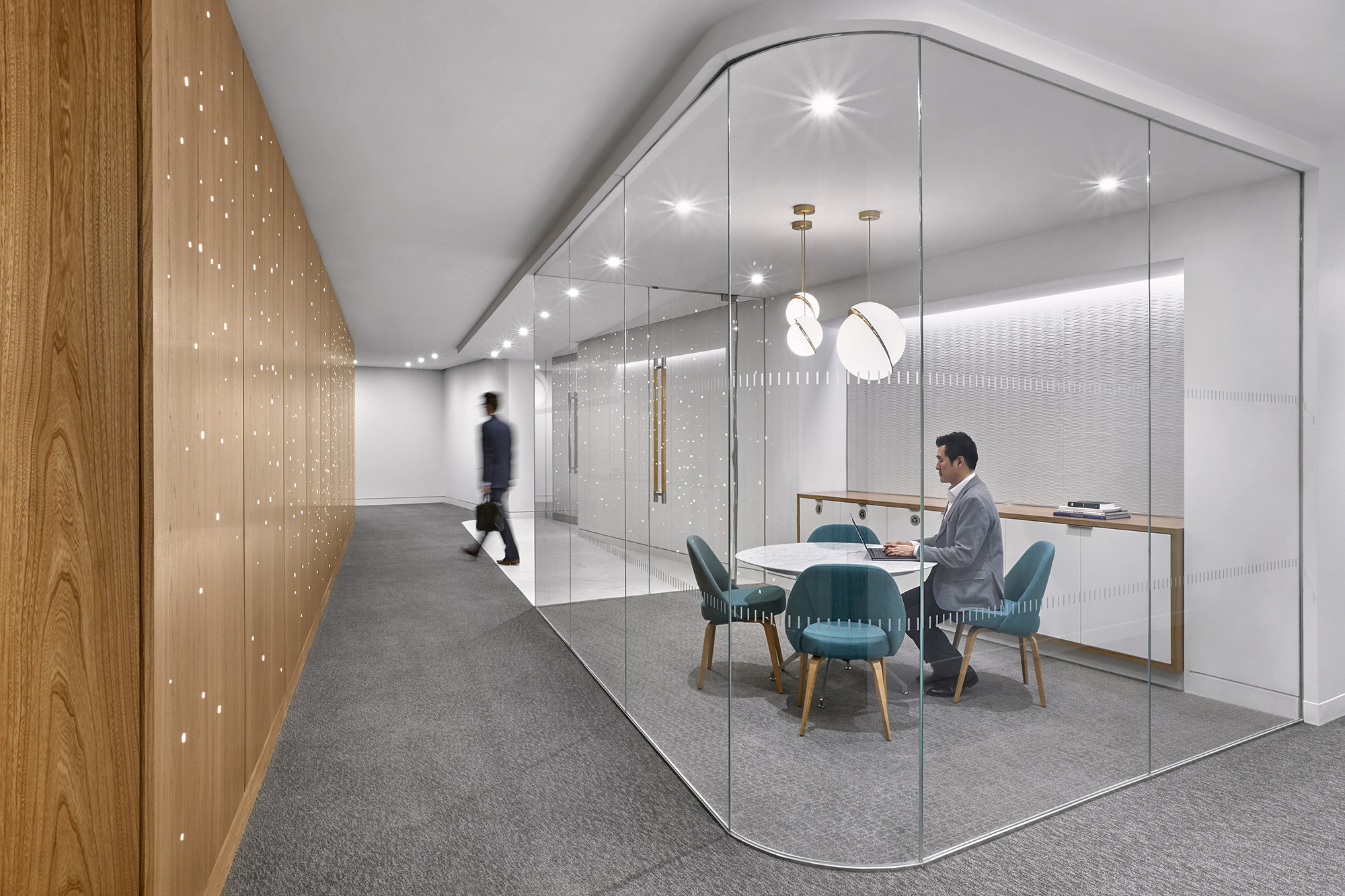 整体设计延续了该律所全球统一的办公室设计标准,同时成功营造出灵动办公氛围并实现运营成本优化。设计将楼层转角及主要交通枢纽区域打造为专业会议与团队协作空间,使员工能尽享充沛自然光与优越的景观视野。