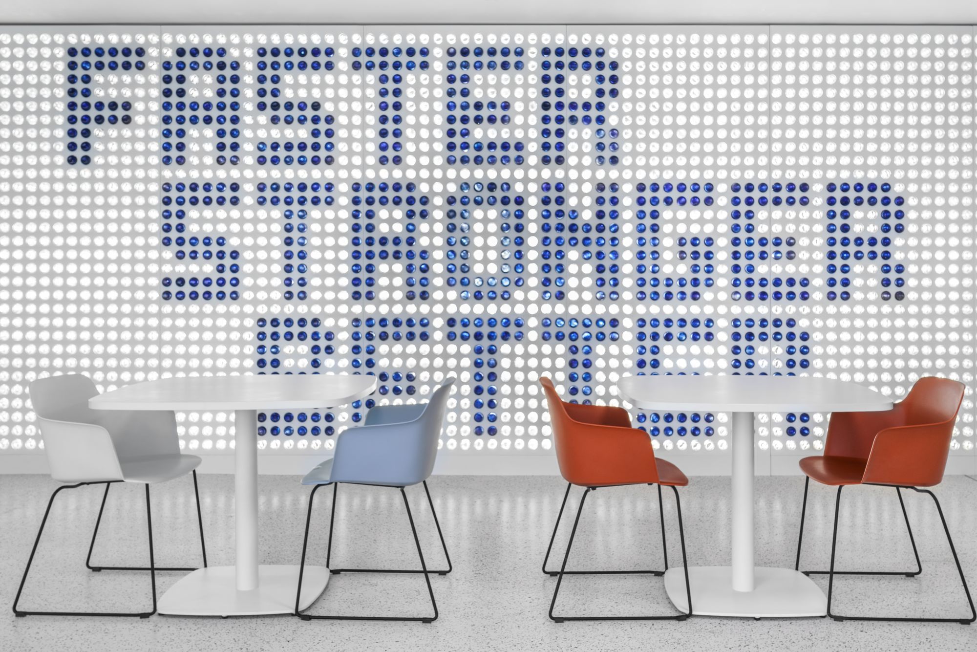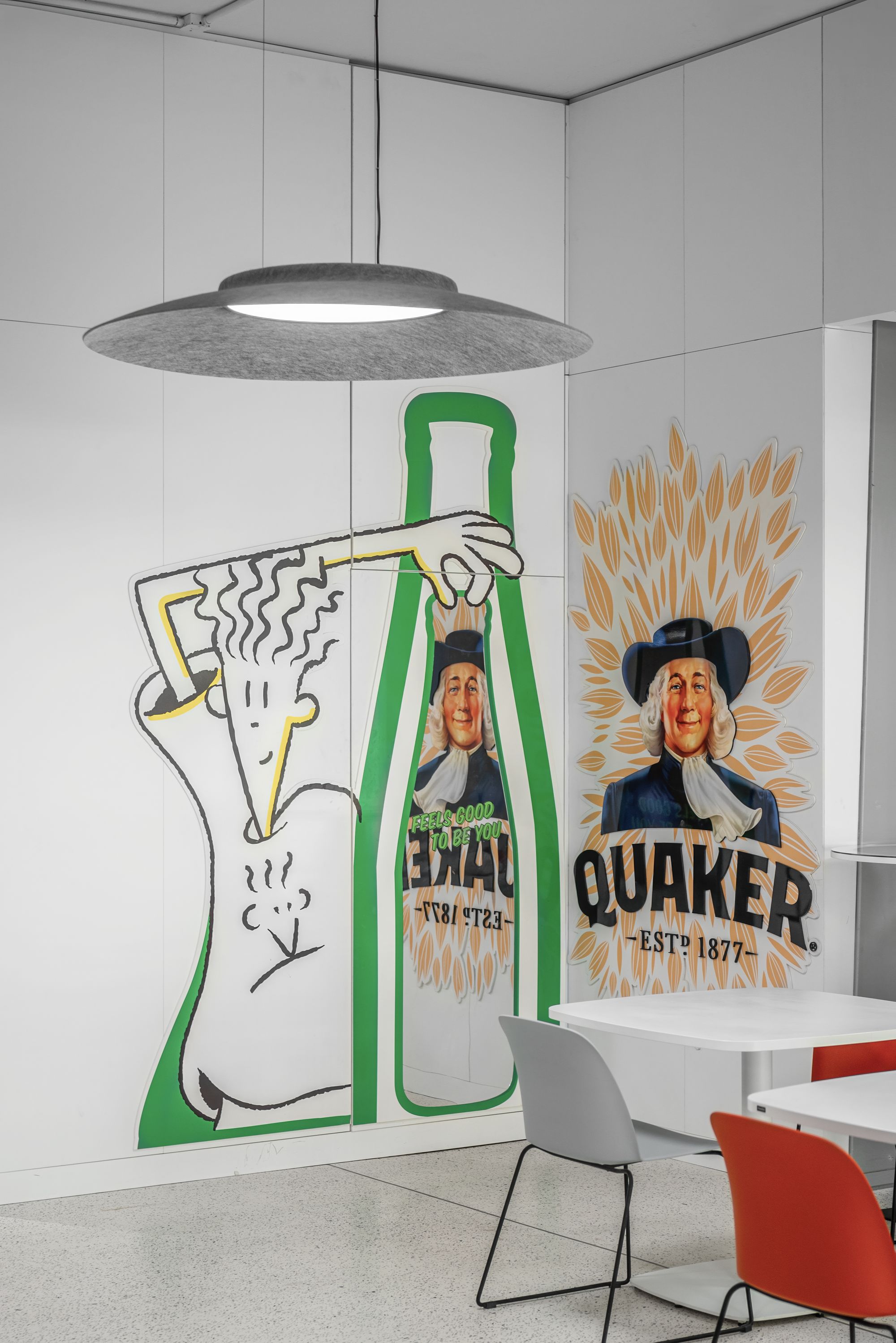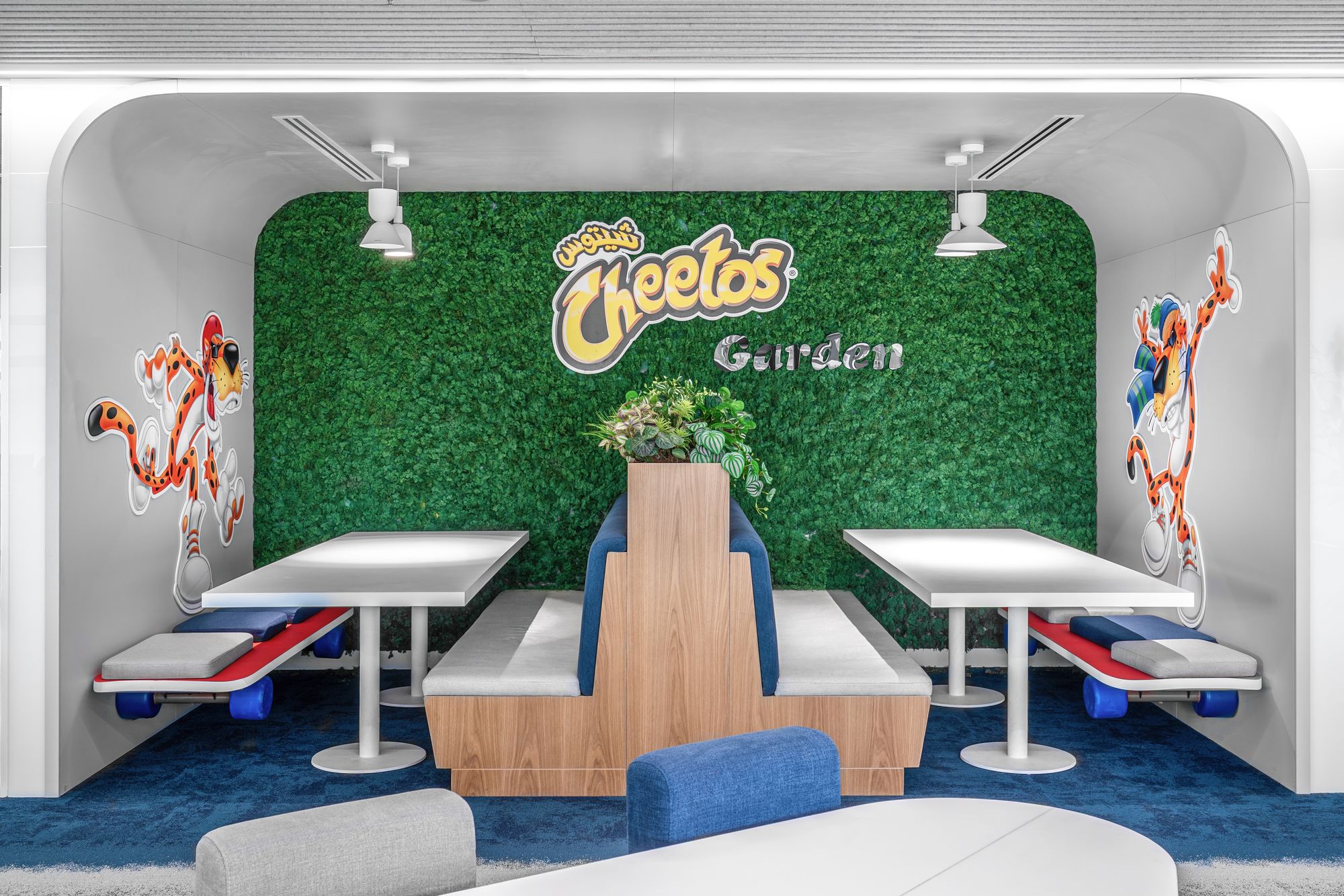 项目的核心是Pephub交流中心:这个中央聚集空间以连接全球团队的巨型数字墙为焦点,其声学设计更开创全新境界:弧形毡艺天花不仅提升舒适度,更成为Echelle建筑设计事务所的标志性元素。这种定制化设计延伸至开放式空间的立式隔音屏,从七喜(Fido Dido)到乐事(Lay’s)薯片的品牌标识与功能巧妙融合,实现品牌基因与实用功能的完美统一。
