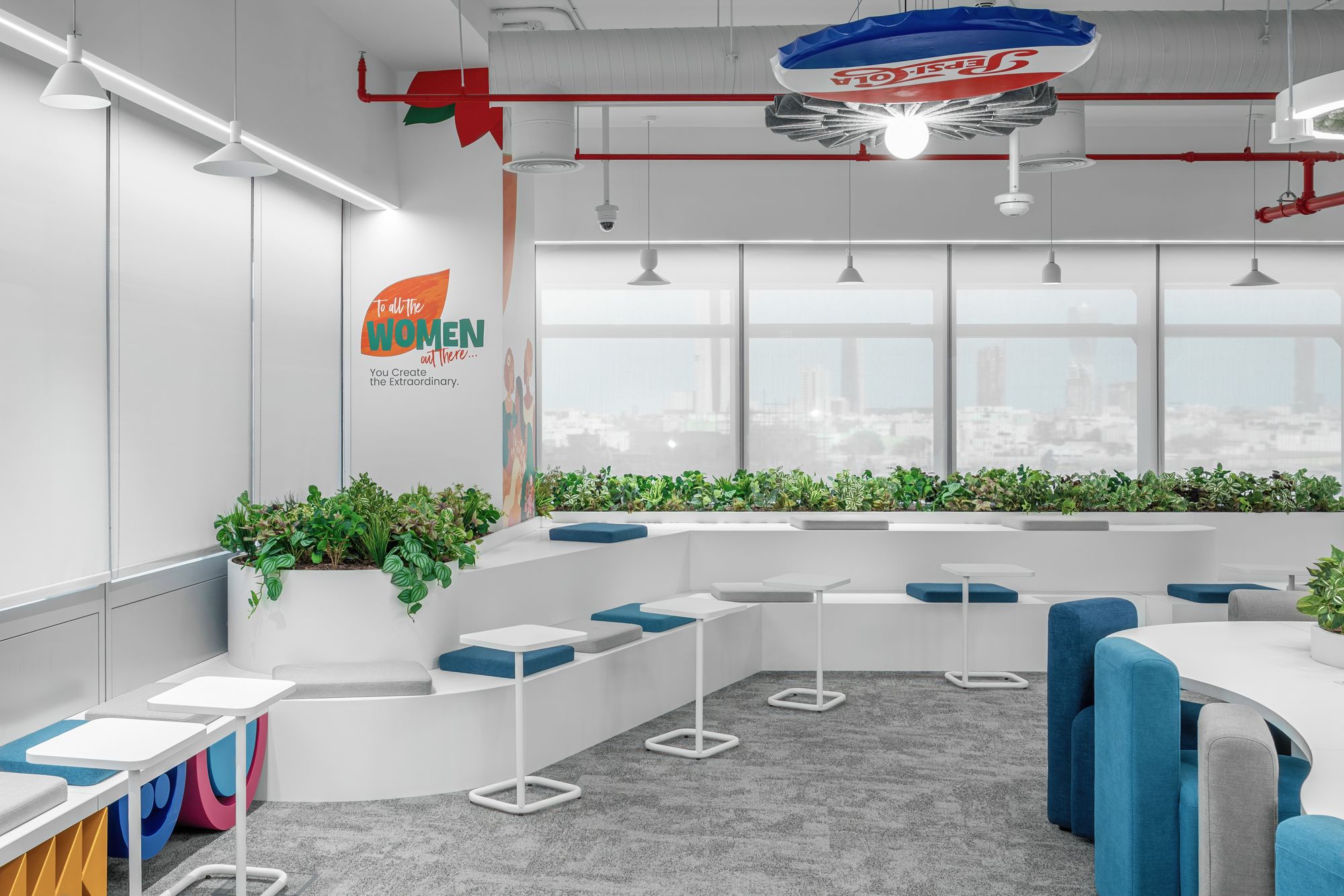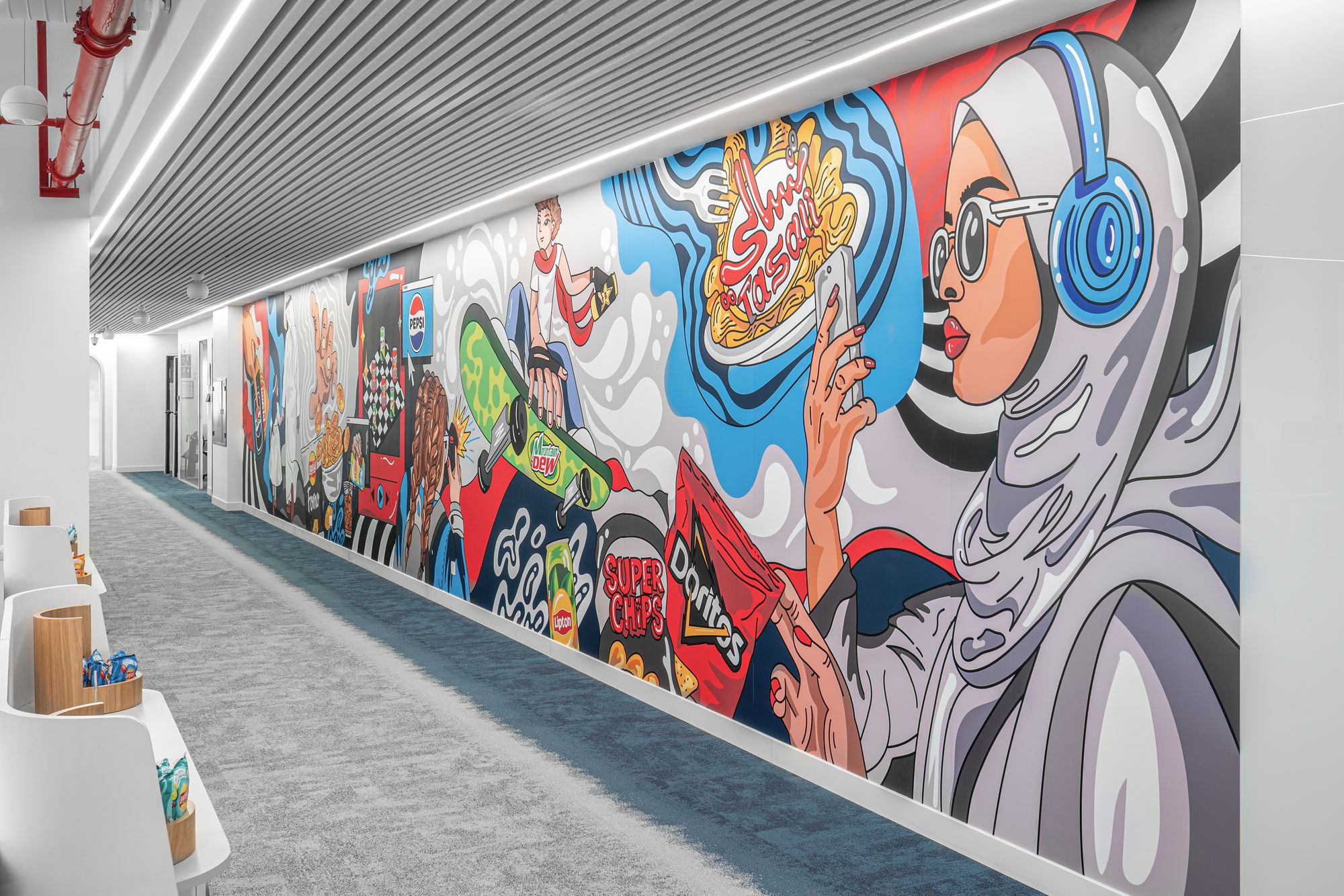品牌元素与涂鸦灵感的艺术设计为每个角落注入活力,既展现了百事可乐丰富的饮料与零食产品矩阵,也唤醒了沙特本土的文化自豪感与归属感。非正式座位区——以切斯特(Chester)滑板造型和百事可乐PepsiCo Way icons图标为灵感——取代传统办公座椅,营造出兼具趣味性与功能性的空间。