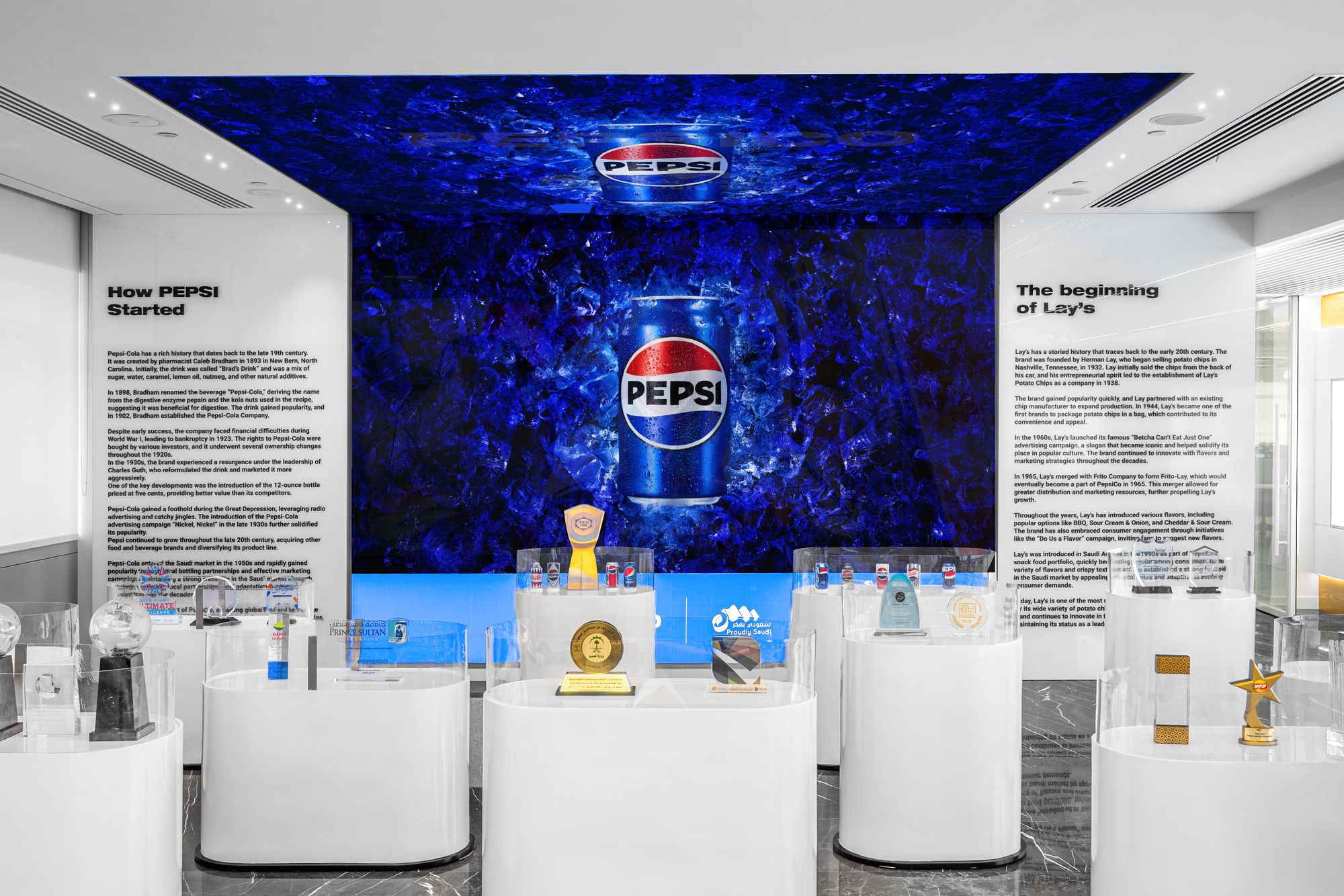 从接待区展示PEP博物馆的引人注目的L形沉浸式屏幕,到开放工作区动态播放传递“百事可乐之道”欢乐与责任理念的数字标牌——这座总部处处彰显非凡。它已成为国王金融区(KAFD)内一座充满活力的新地标。