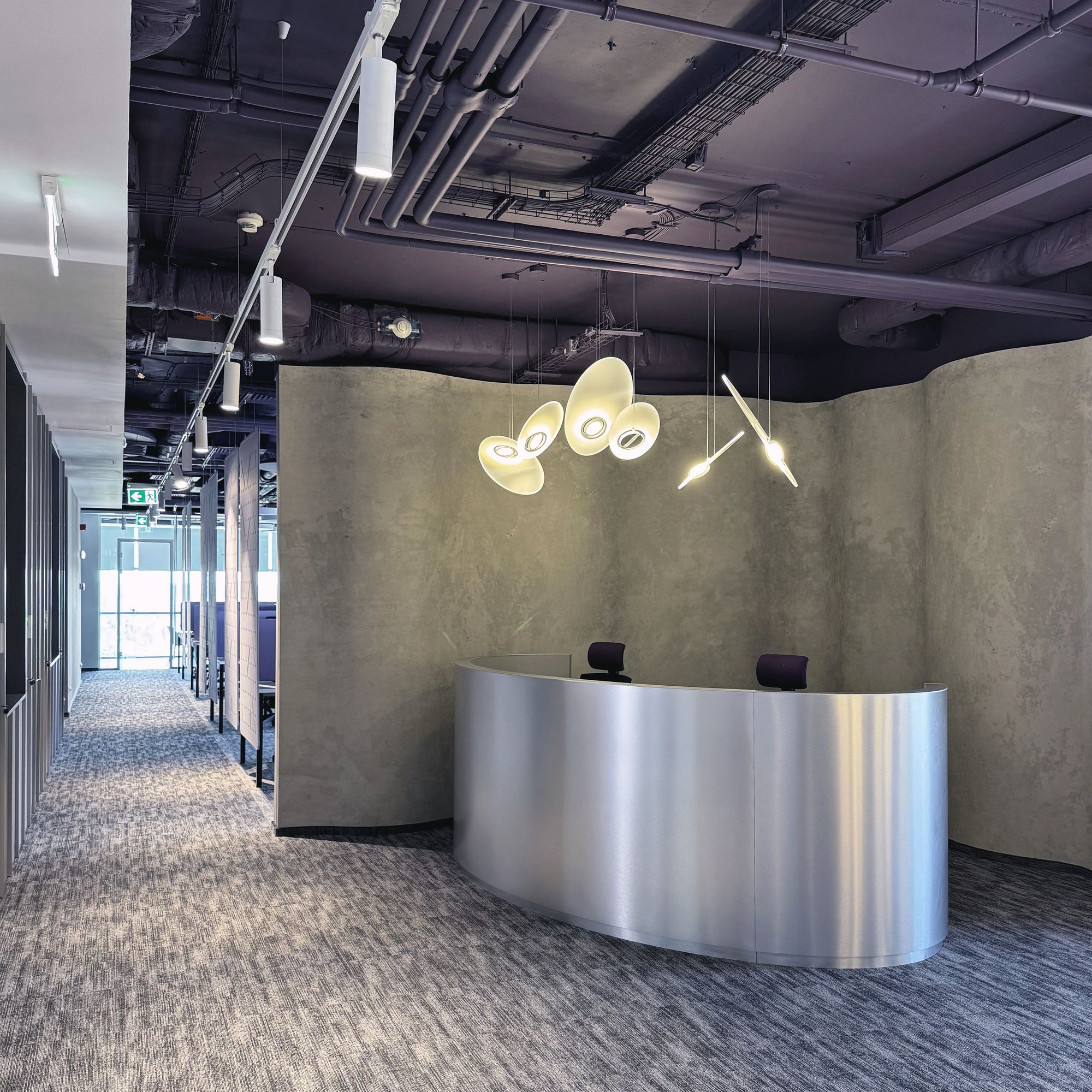 入口区域成为整个楼层的视觉焦点。弧形墙面与流线型前台构筑出灵动氛围,金属饰面、镜面反射与圆形元素的重复运用,暗合着空间的功能属性。背景墙金属板上的环形灯光装置,既为等候区增添韵律感,又赋予空间纵深层次。