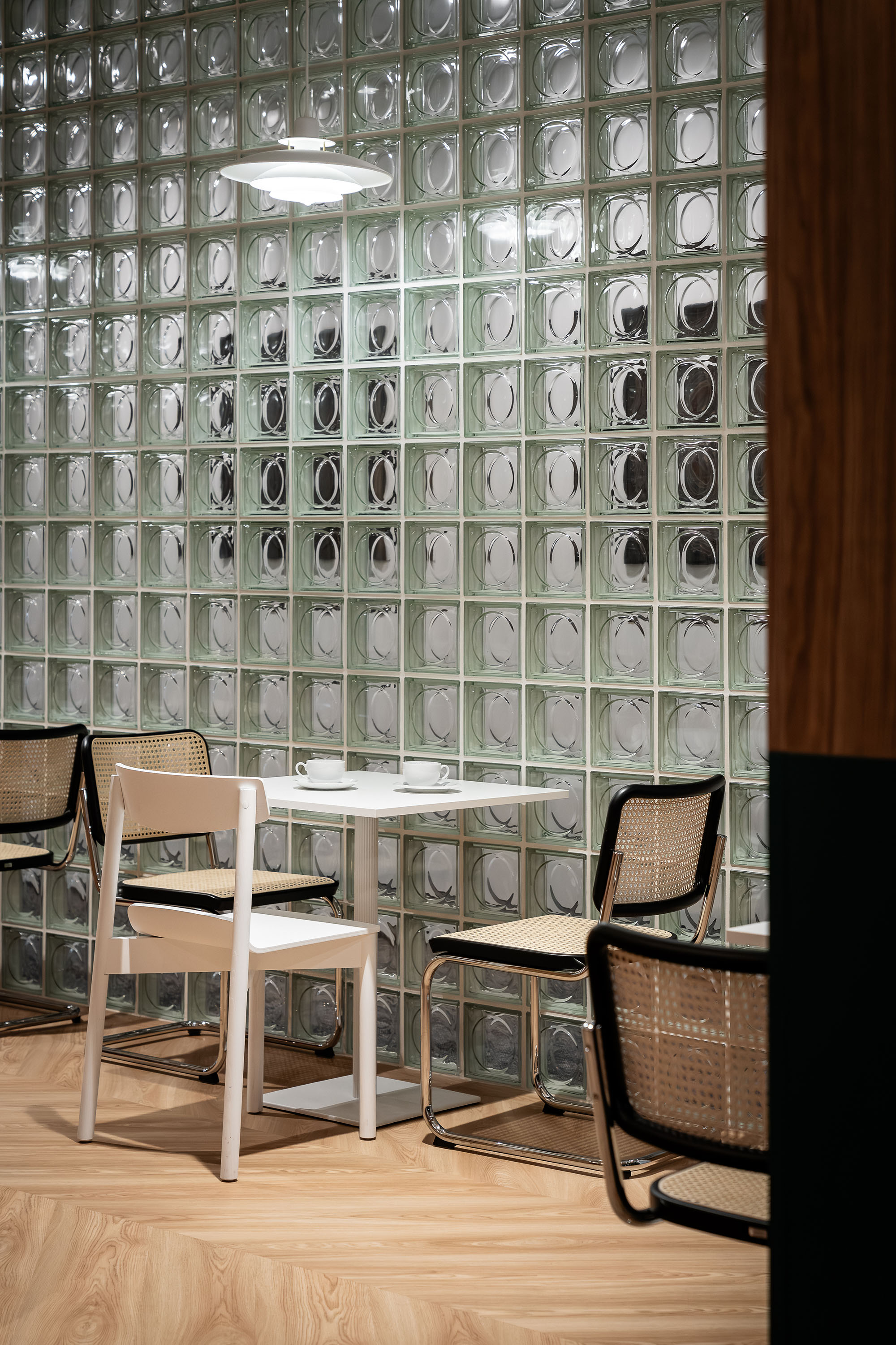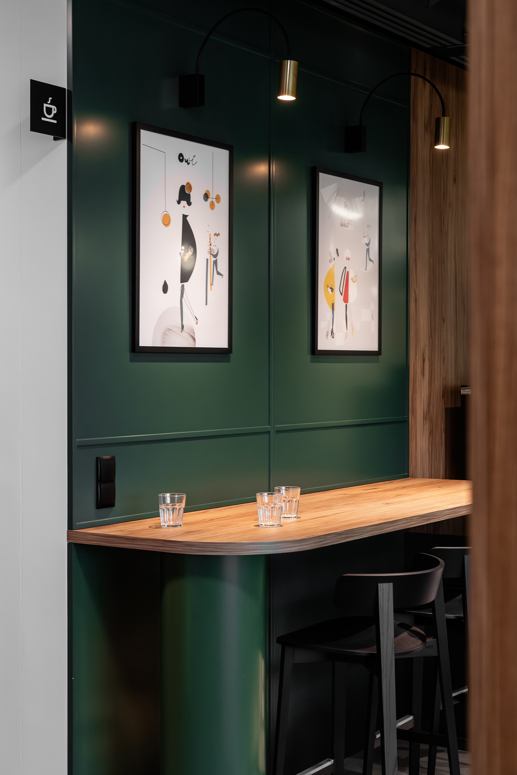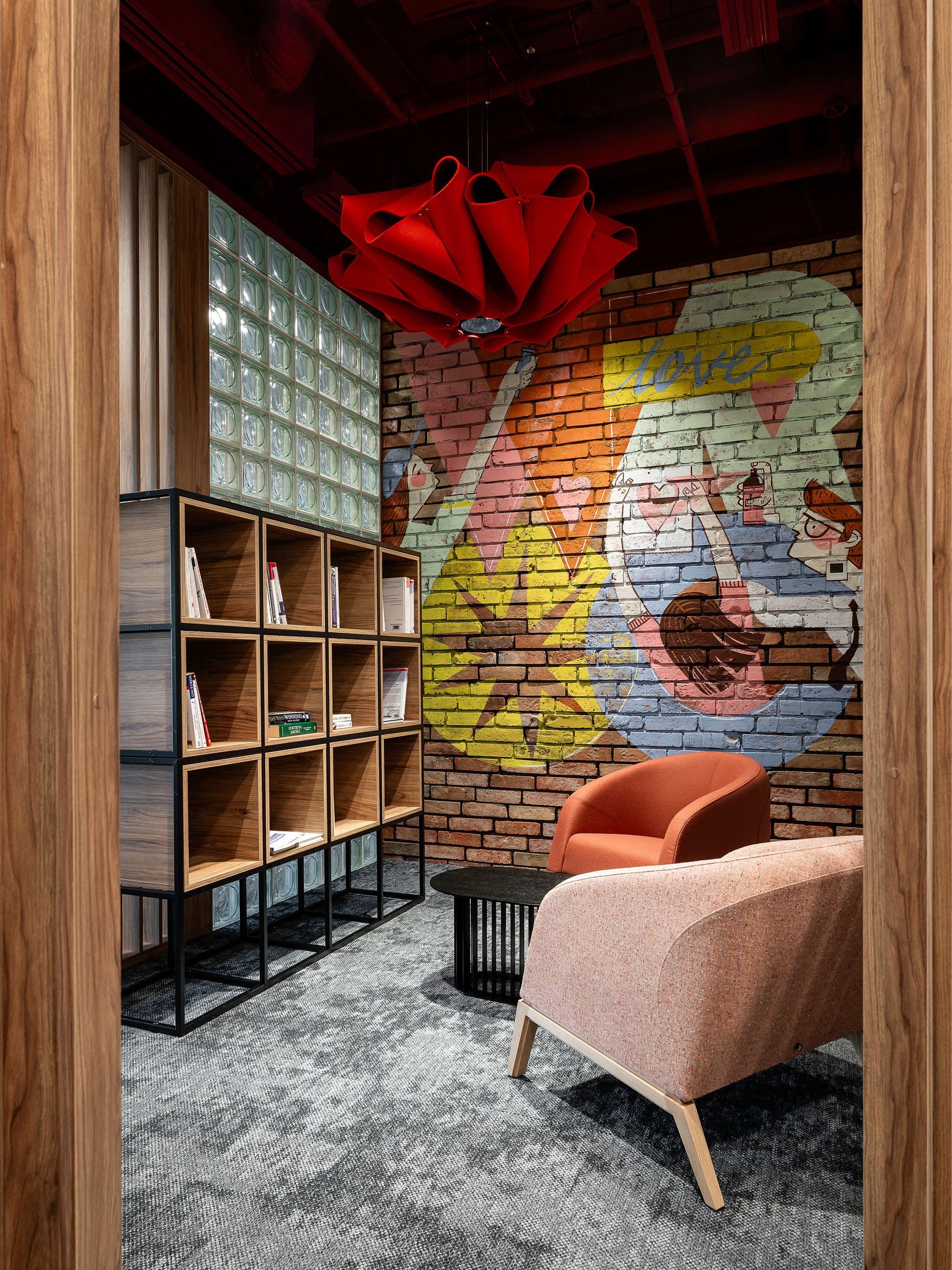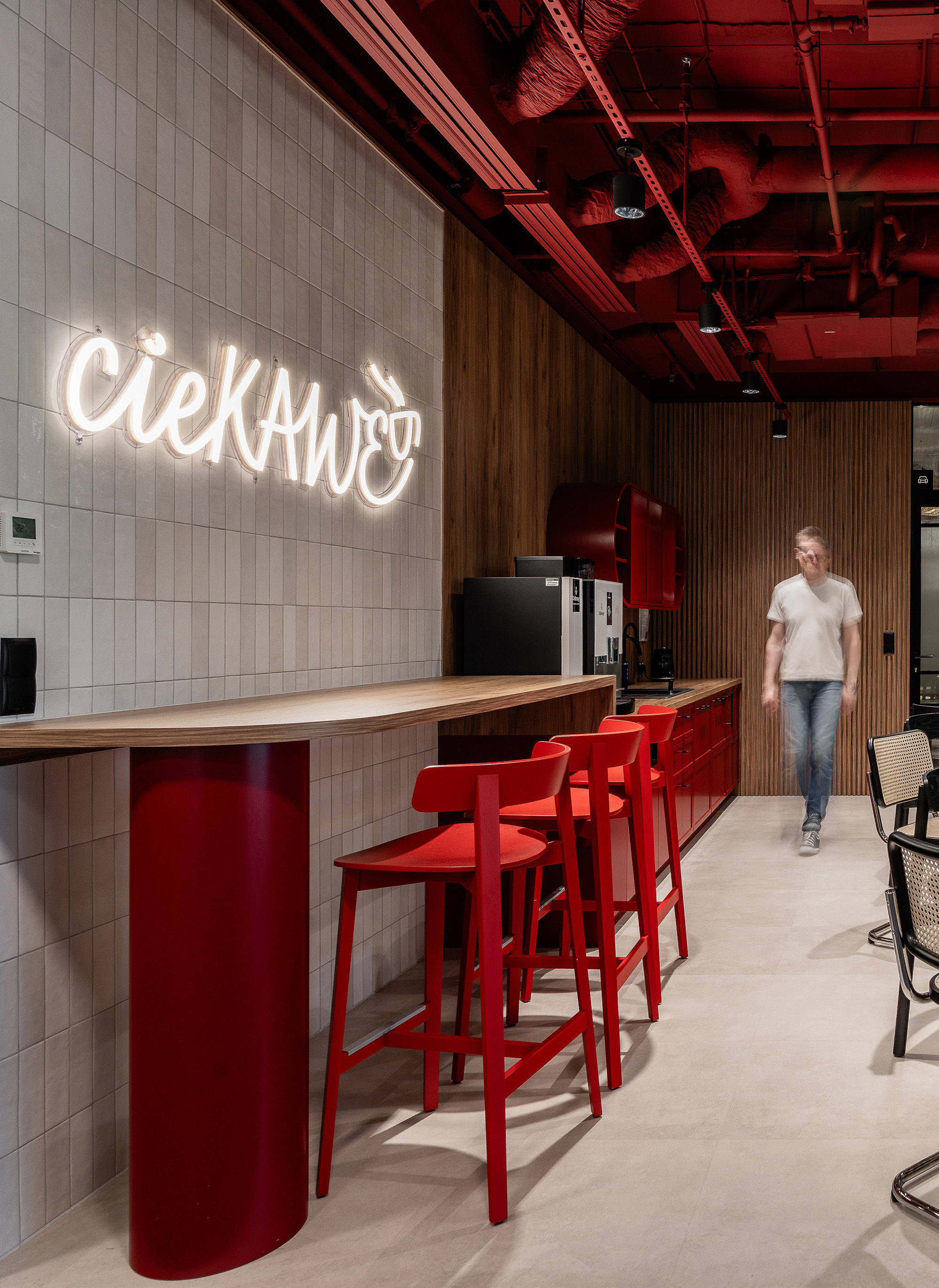 艺术是本案不可或缺的有机组成部分。画作、平面设计、壁画与马赛克并非单纯装饰,而是构成空间建筑感的重要元素。咖啡区点缀着由Kolektyf设计的霓虹艺术装置,公共区域则装饰着波兹南ARDEA工作室创作的弗罗茨瓦夫全景马赛克壁画。当代艺术同样占据重要地位,KRUK集团通过加入“艺术合作伙伴”计划,与克鲁帕艺术基金会合作臻选艺术作品,最终形成与室内空间完美融合的策展式陈列。这些艺术创作既与建筑材质交相辉映,凸显出办公空间的独特气质,又凝聚着团队能量,为创意工作与团队协作构筑激发灵感的艺术背景。