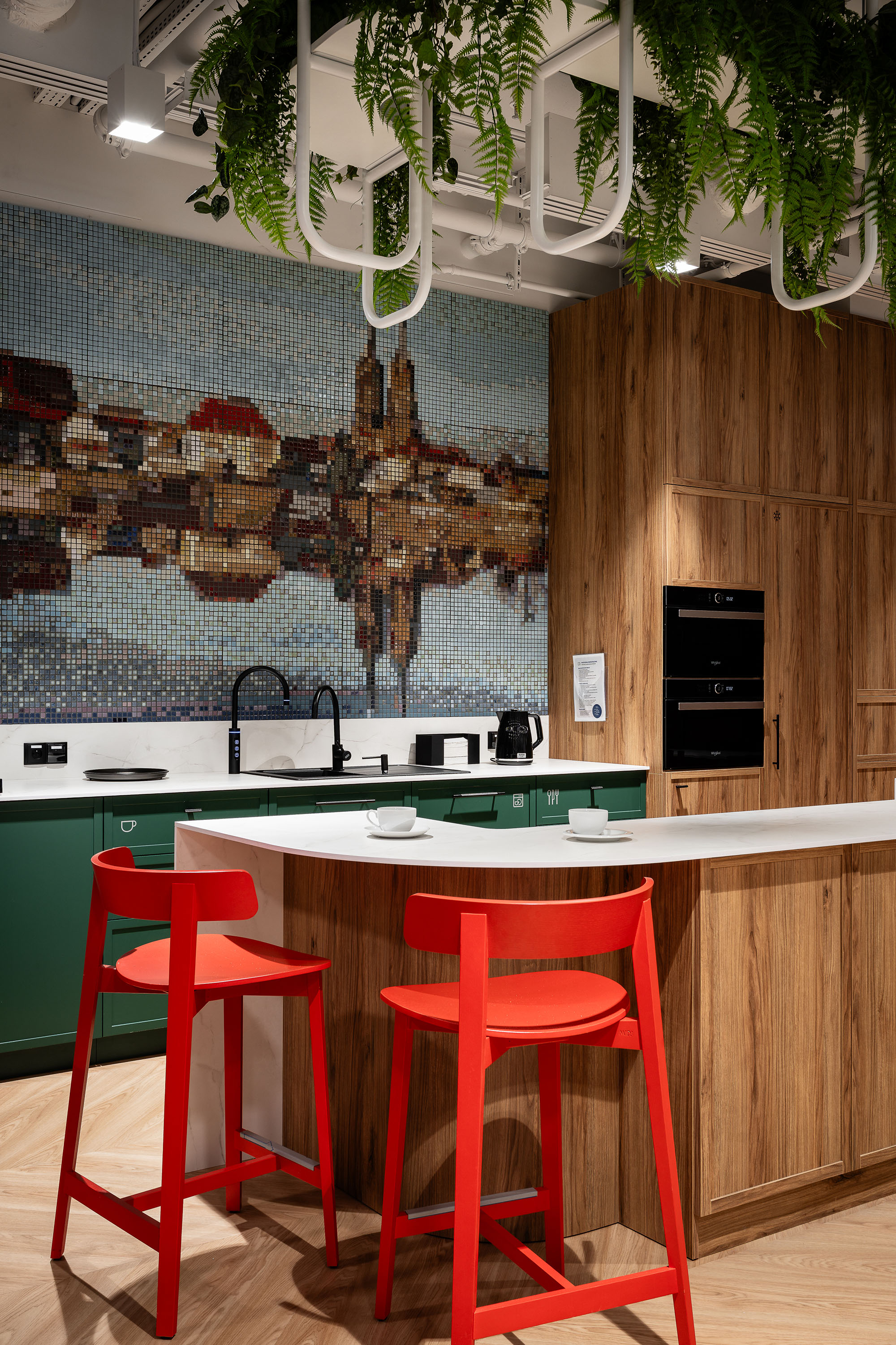 公共区域以鲜明色彩与特色装饰夺人眼球,开放式办公区却刻意采用沉静的色调。米白、灰阶与原木色构成中性背景,为专注工作提供视觉支撑。隔断结构不仅赋予美学价值,更有效改善声学环境——这对大型办公空间至关重要。空间同时保有高度灵活性:会议室配备可移动家具以实现快速重组,风格各异的小型洽谈间从藤编元素的波西米亚风到绿灰基调的极简主义从容切换。