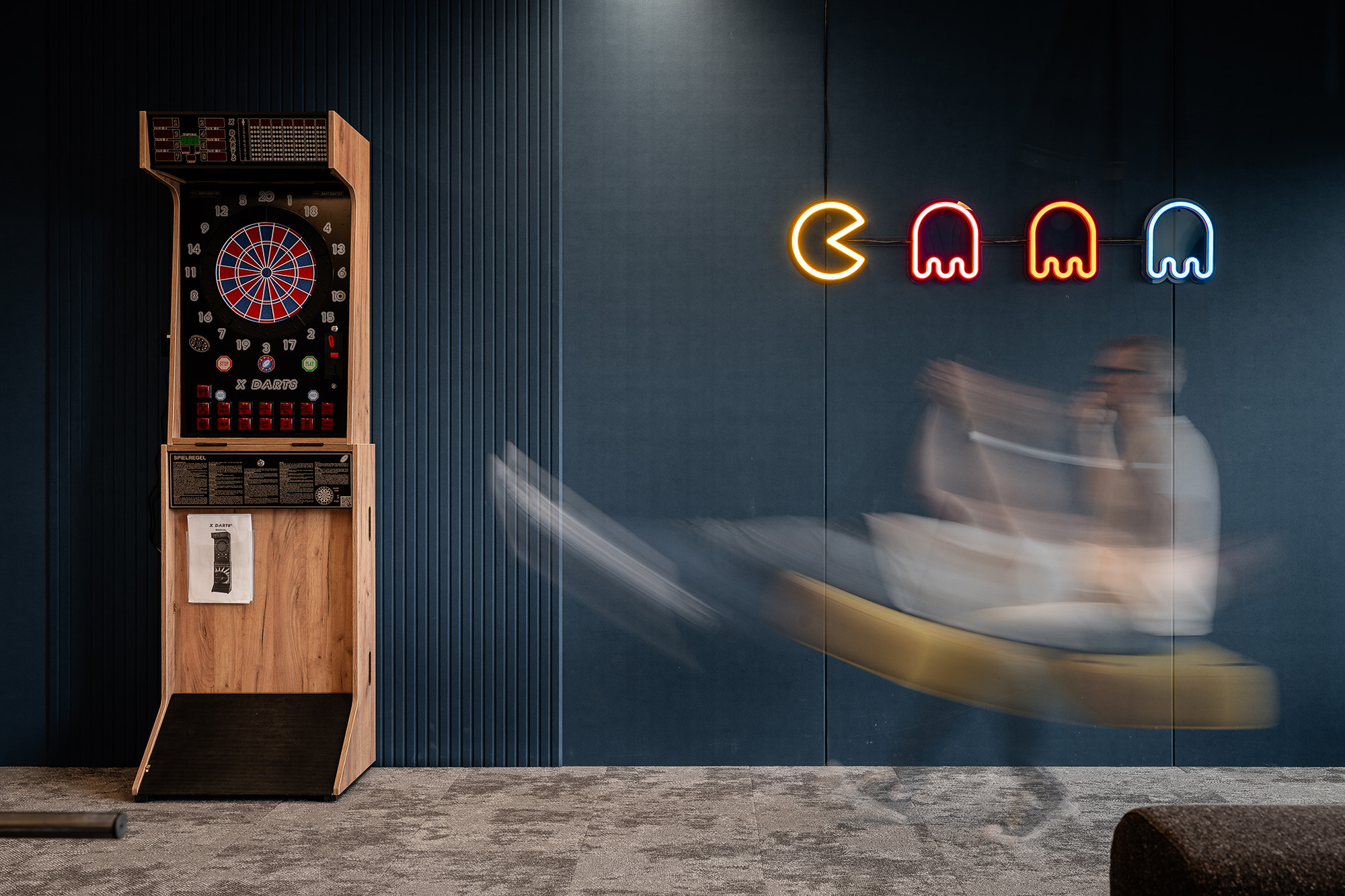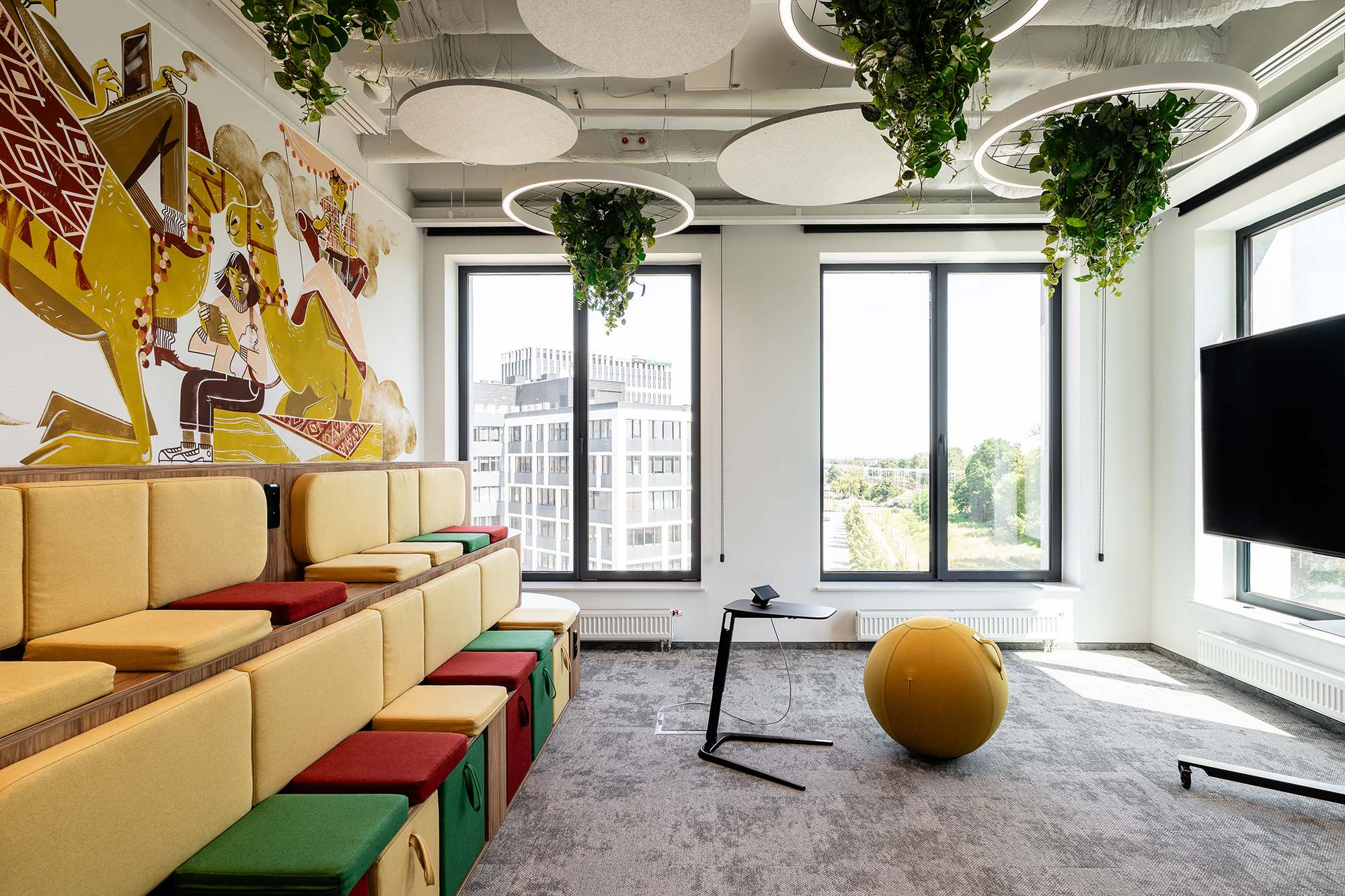 办公空间还囊括诸多特色功能区域:配备健身梯与瑜伽垫的康体区、设有游戏主机的娱乐室、声学电话亭、以及放置豆袋沙发、阶梯座阶和互动装置的休闲空间。多元化的设计确保每位员工都能找到契合自身需求的工作场景。