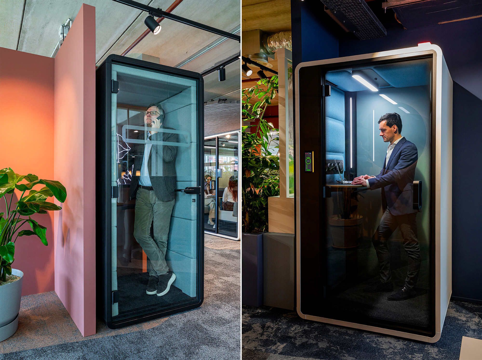 展厅核心区域错落布置着多间Mikomax品牌的Hush系列声学舱:这些隔音会议舱既可满足通话、洽谈需求,亦适合专注工作。