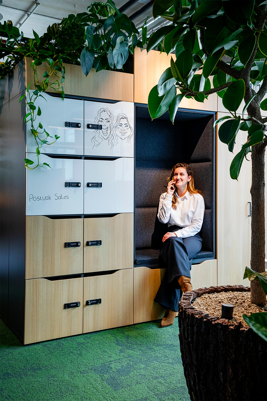 设计团队在建筑沿街立面打造了两处秉承亲生物设计理念的内部创意空间,首当其冲的便是这间绿植休憩舱。