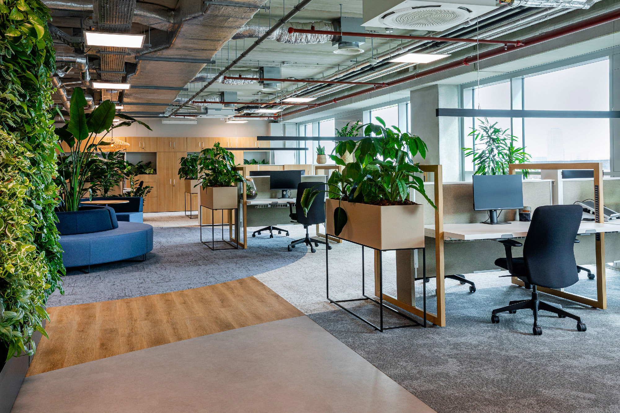 员工办公区坐落于“森林区”。墨绿地毯、繁茂绿植、原木材质与精美森林主题印花共同营造舒适办公氛围,让人瞬间领会设计灵感之源。