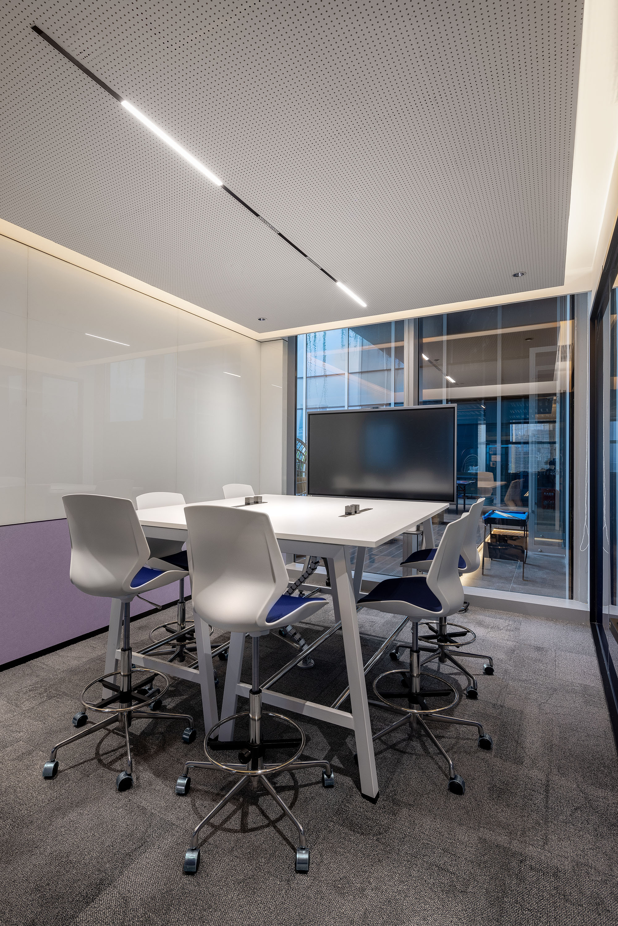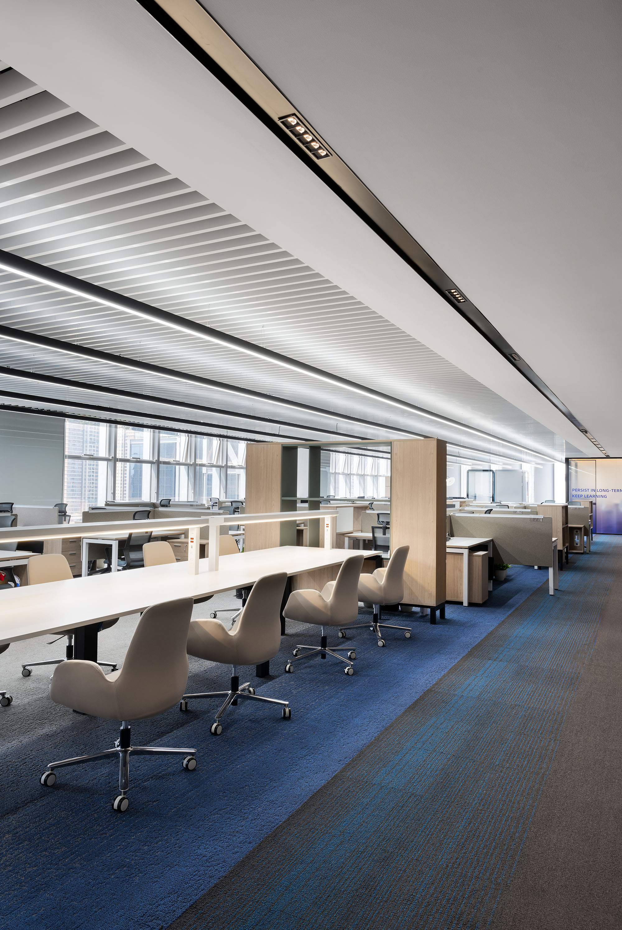 地面铺设深蓝与灰阶交织的地毯,不仅提升声学舒适度,更以色彩引导动线,营造沉稳而不失活力的空间基调。浅色木饰面隔断错落分布,既划分功能区域,又保持视觉通透,实现私密性与开放性的平衡。每组工位均配备人体工学座椅与可调节高度的桌面,回应个体差异,守护长期工作的健康姿态。