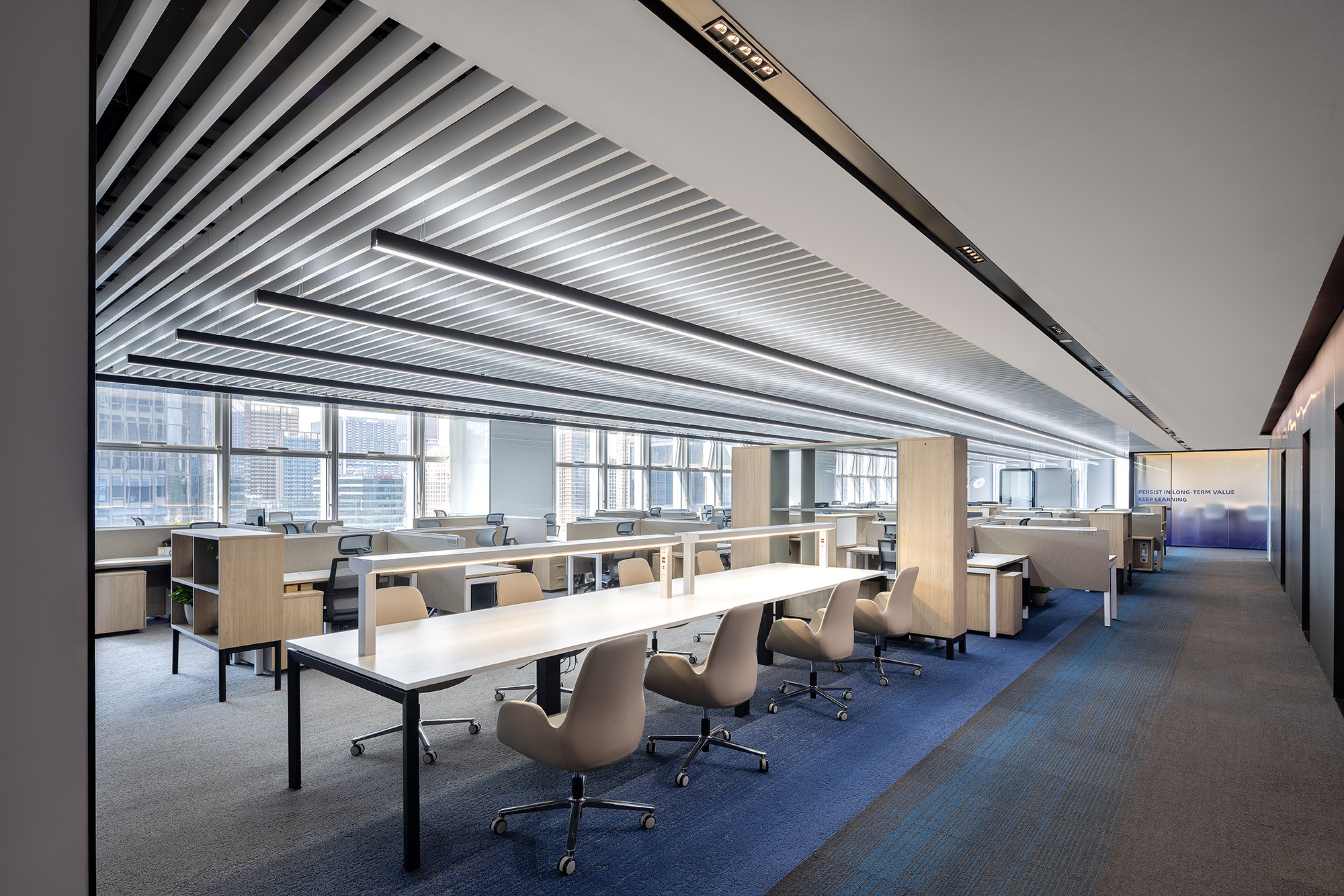 在明亮通透的视野中,办公空间以简洁有力的线条勾勒出高效运转的节奏。长条形工位沿窗而列,自然光如流水般倾泻而入,与智能照明系统共同编织出柔和而均匀的光环境,为专注工作提供最理想的视觉支持。