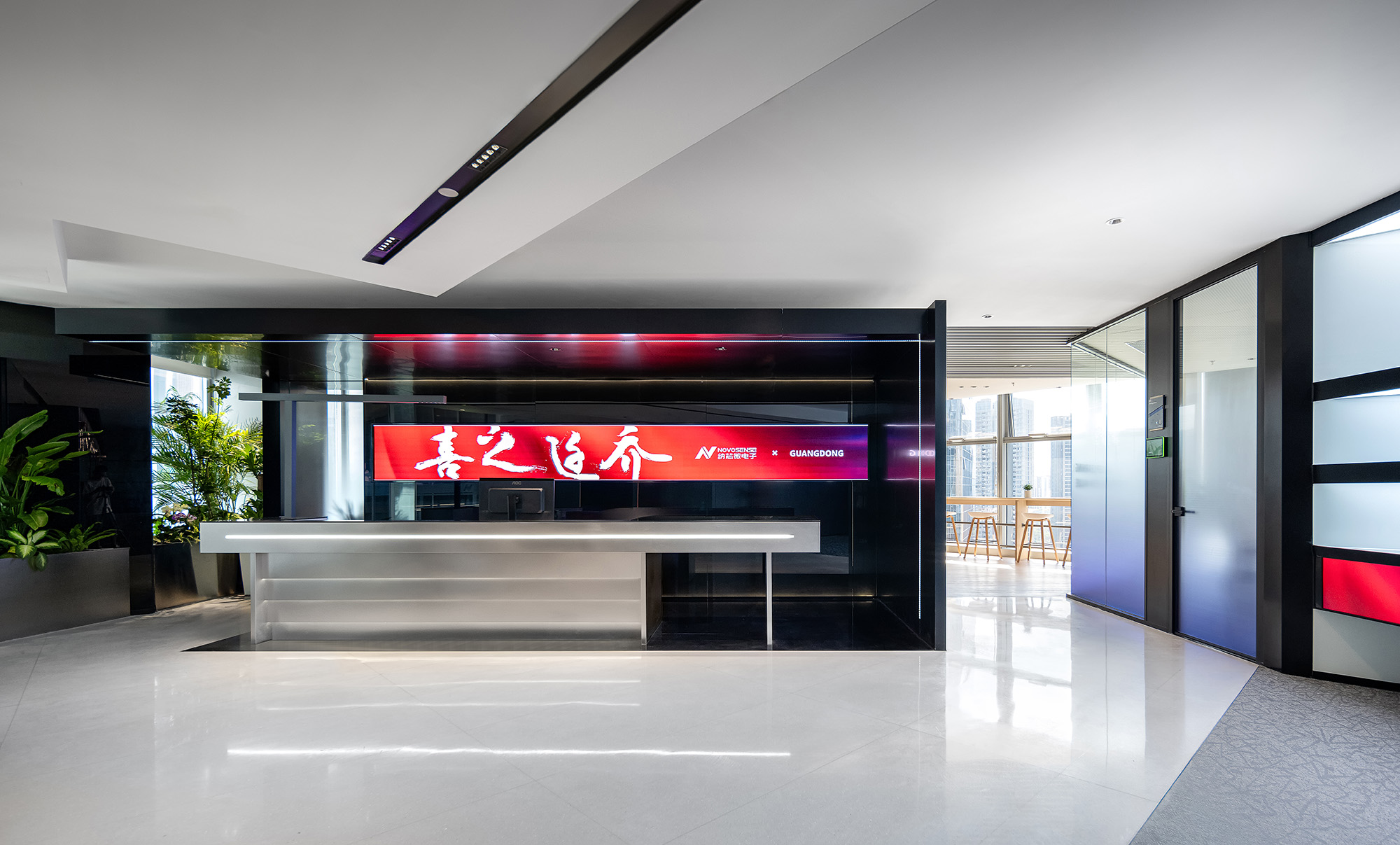 通透的玻璃幕墙与深色金属框架勾勒出利落的几何轮廓,映衬着中央悬浮式白色接待台,如一道静谧的光带横贯空间。地面采用高光泽地砖,反射天光与灯光,使整个区域在视觉上延展、轻盈,营造出未来感十足的迎宾氛围。