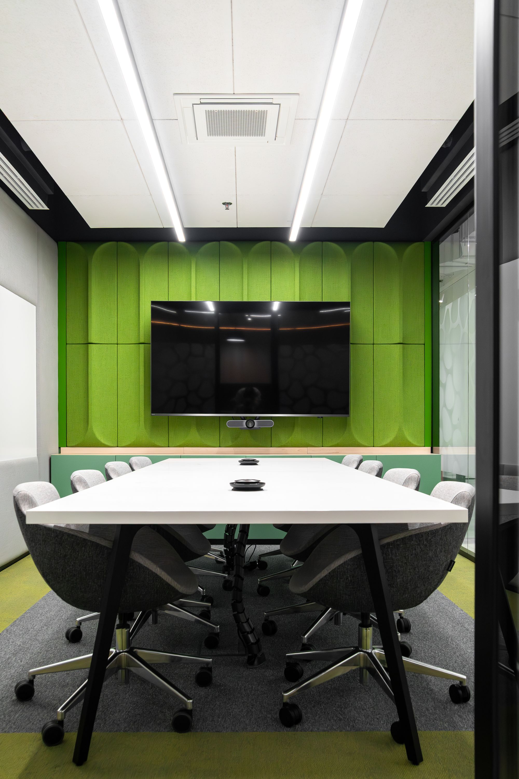 前台区域简洁而实用——利落的线条、温润的木面材质与精心调控的照明,共同营造出专业而不失亲切的初印象。会议室配备现代音频系统与吸音吊顶,确保声音清晰度与空间舒适度。