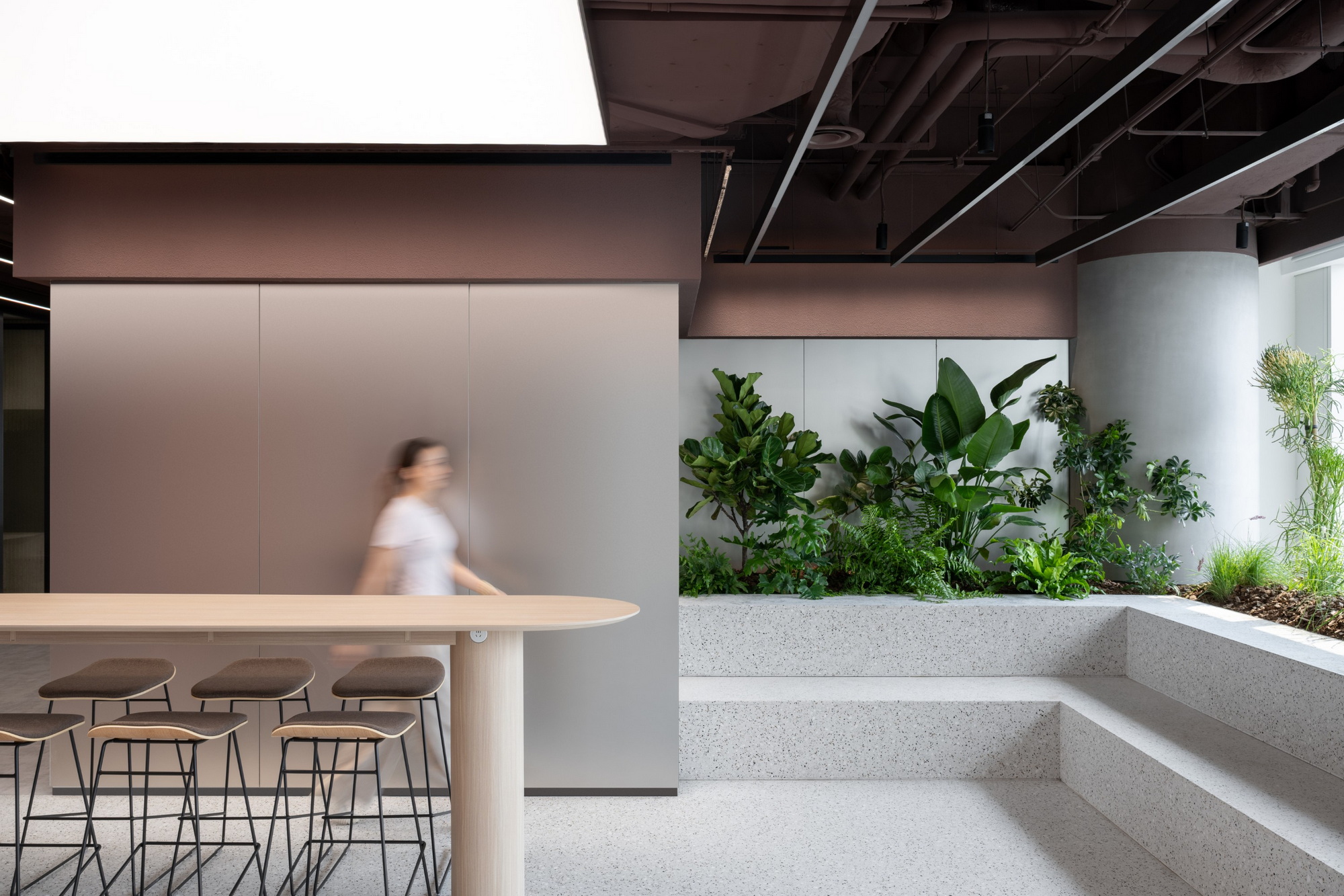 专注于员工服务的Team Hub从一楼大堂可直接前往,它是一个以员工为中心的服务场所,其中的一切都围绕员工所关切的问题展开。除了传统的人力资源部、IT部和财务部之外,还另设有一个可以提供快捷服务的服务台。这个区域的“心脏”是一个公司自营的咖啡馆,装修采用亮橙色水磨石,活力十足,像一个开在办公室里的街角咖啡店。当然,空间中也不乏阳狮的品牌元素,包括带有企业自豪感的装饰摆件,传递出鲜明的文化身份。