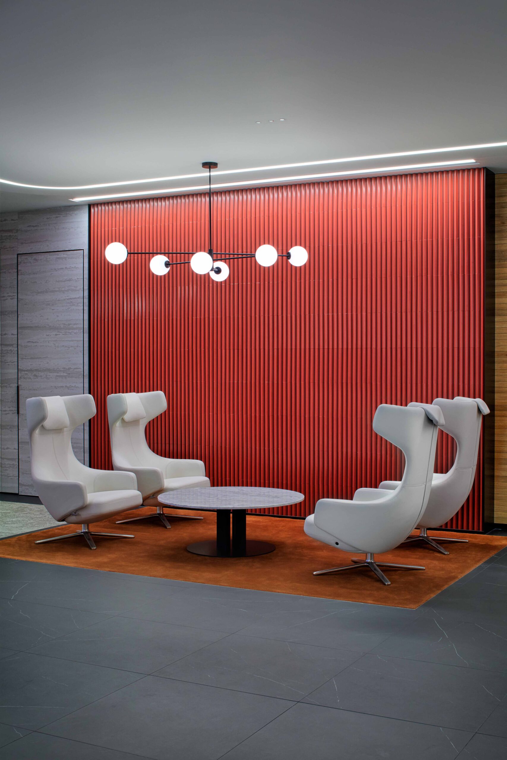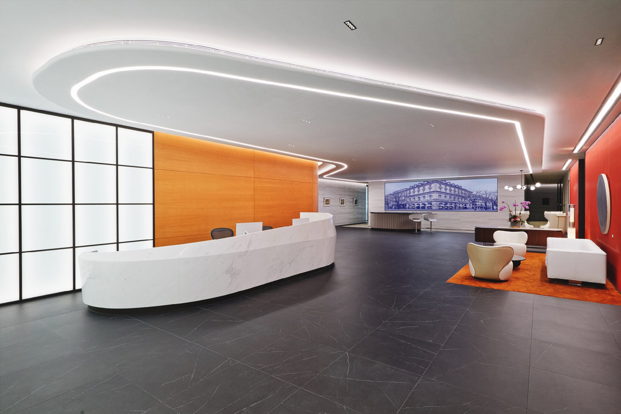 全新设计的接待区选用精工橡木饰面、独具纹理的3D釉面陶土特色墙、天然石材地面搭配区域性的柔软地毯,并配以奢华皮质座椅。此处的设计以革新性细节巧妙重塑银行全球品牌形象,在锐意创新与恪守品牌深厚传统之间达成完美平衡。