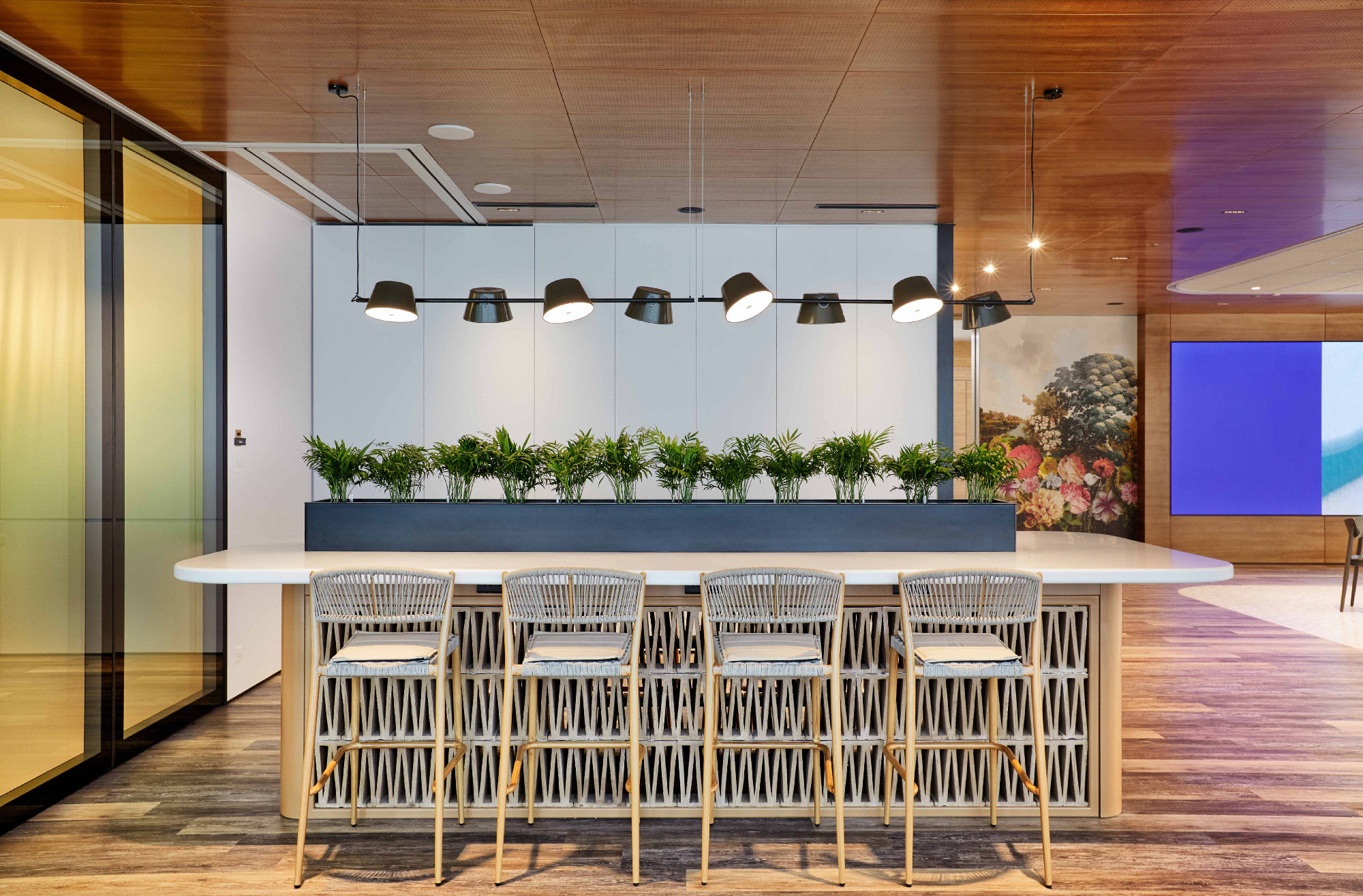 每个楼层均设有专属主题色,并配备一个拥有独特名称的协作区以及易于识别的“邻里”地标,以方便室内导航。充足的会议空间和配置各异的备用工作点,鼓励了灵活且基于活动的工作行为。通过将工位集群成角度布置,打破了空间隔阂,并在整个开放式楼层中拓展了视野。一个占地539平方米的工作休闲区作为整个团队日间的社交中心,夜晚,这里则变身为充满活力的休闲活动场地。