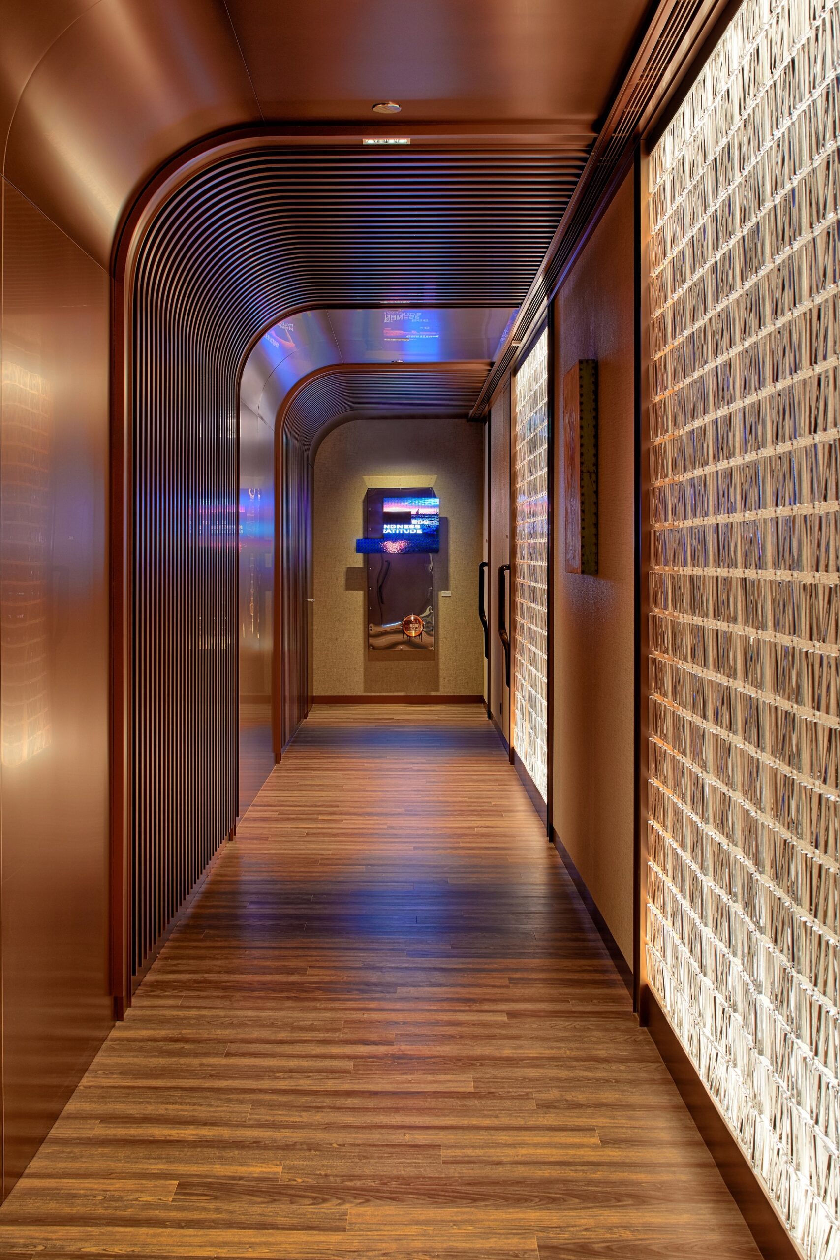 为营造非正式社交氛围,设计团队在接待区隐蔽门后打造了基于私人俱乐部概念的灵动空间。这个充满活力与趣味的区域既可化作日间协作客厅,亦能转为配备可编程灯光音响系统的晚宴场所。更令人惊喜的是,另一道暗门后竟隐藏着配备全套餐饮厨房的私宴厅与红酒廊,以及坐拥维多利亚港壮丽景致的208平方米的户外露台。