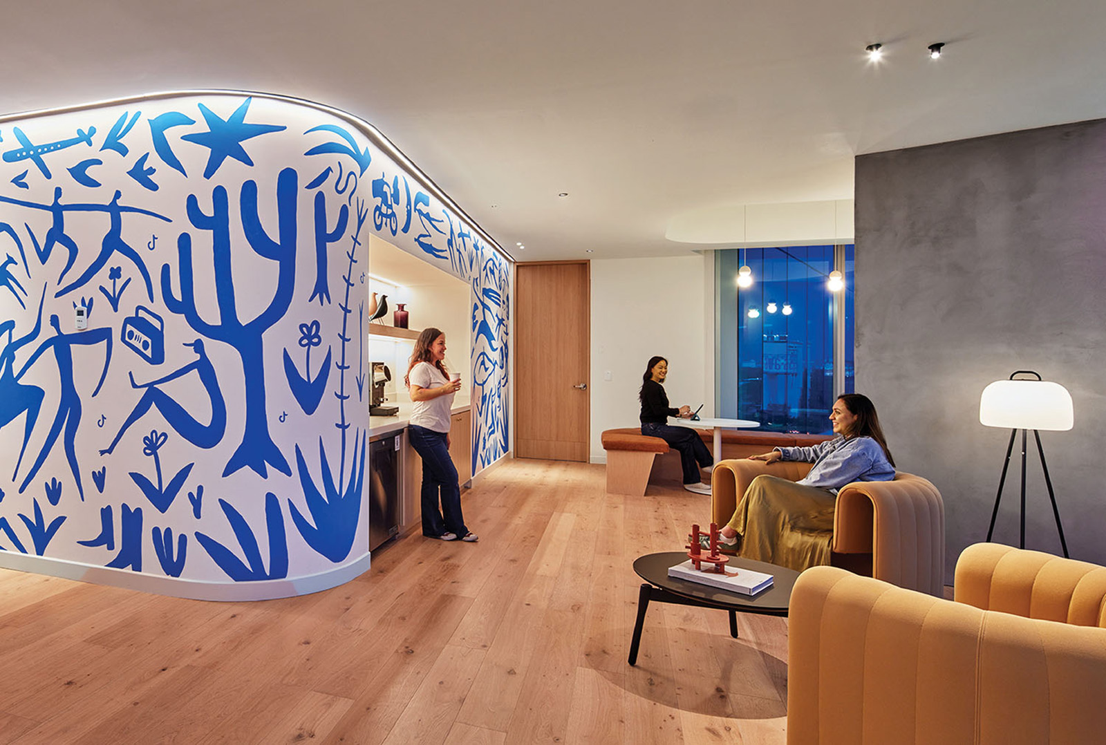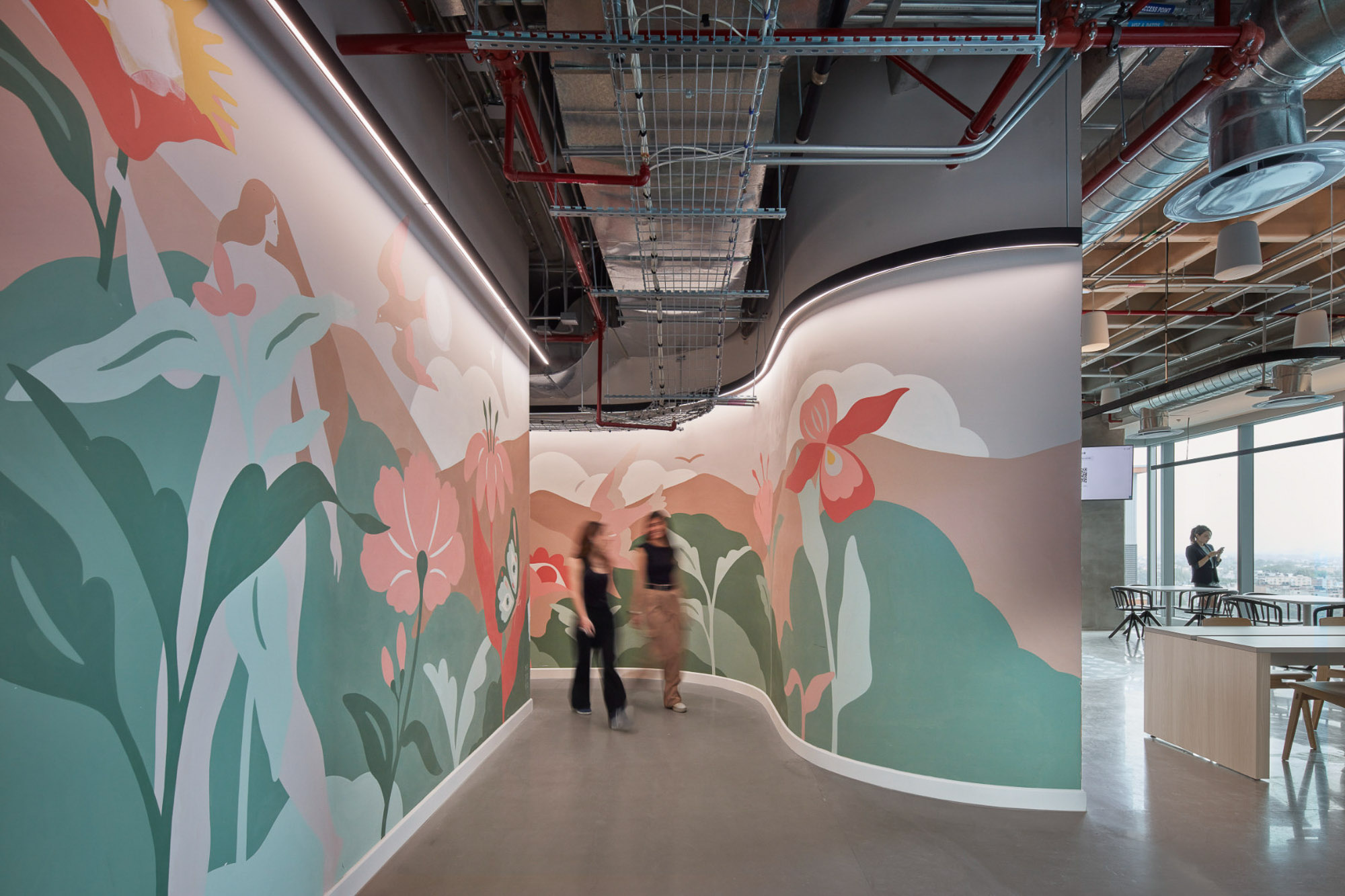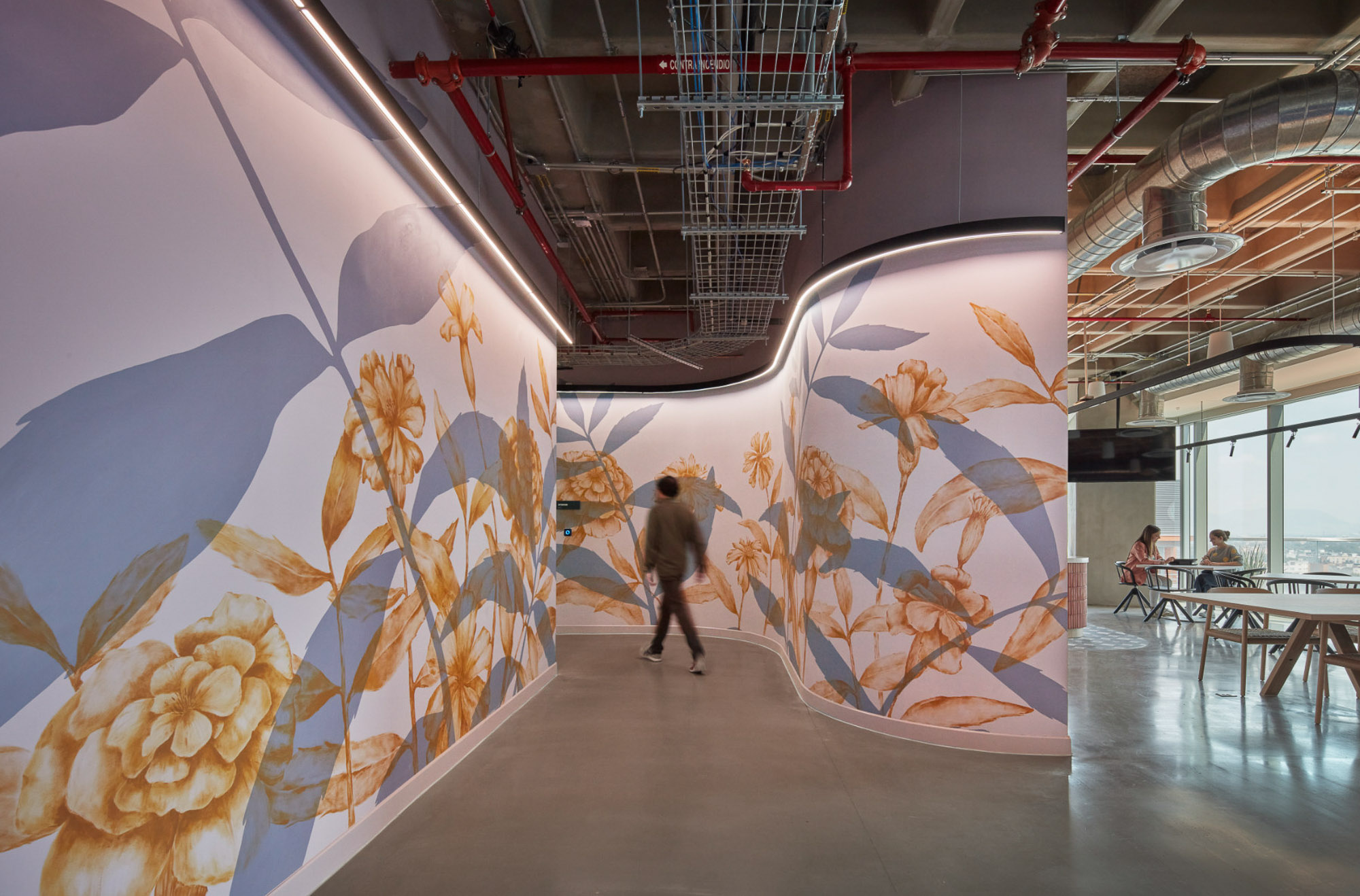 Gensler的设计灵感源自项目近旁的艺术画廊。采用一条贯穿中央的环形动线重构办公空间,仿照画廊观展路径营造沉浸体验。墨西哥城本地艺术家创作了壁画、纺织艺术品与画作,彰显当代艺术界的本真风貌。本地产的火山石与瓷砖等可持续材料的运用贯彻环保理念,裸露天花设计既减少耗材又增添工业质感。受TikTok移动交互启发,空间布局融入流线形态、曲面墙体及灵活工作区,持续激发协作与创新活力。