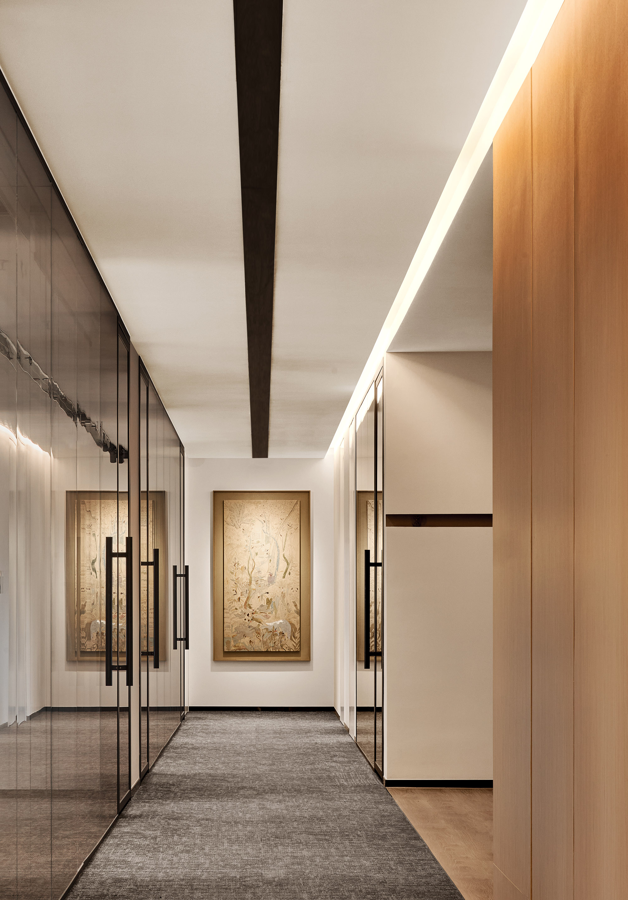 空间以自然色调为基底,摒弃传统奢华的浮华堆砌,深度践行包豪斯极简美学,融合工业革命技术成果,甄选金属、皮革等现代材质,借由不同质感的碰撞交融,凝练出低调而富有张力的奢华气韵。柔和照明层层铺陈,与材质肌理相映成趣,构建出充满生命力的创意场域;吊顶黑色线条的利落延展,更赋予空间灵动的秩序感。