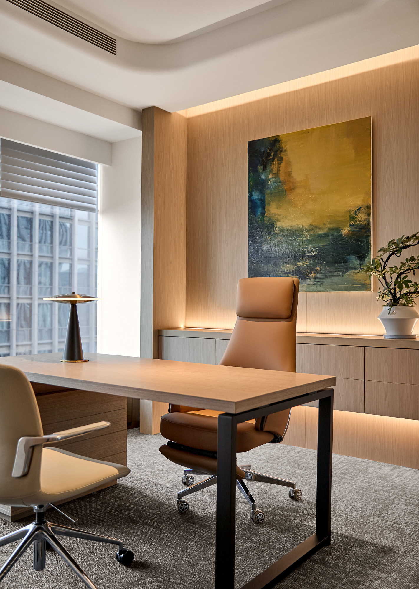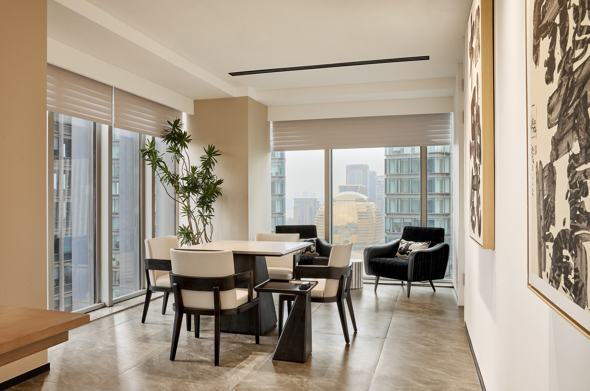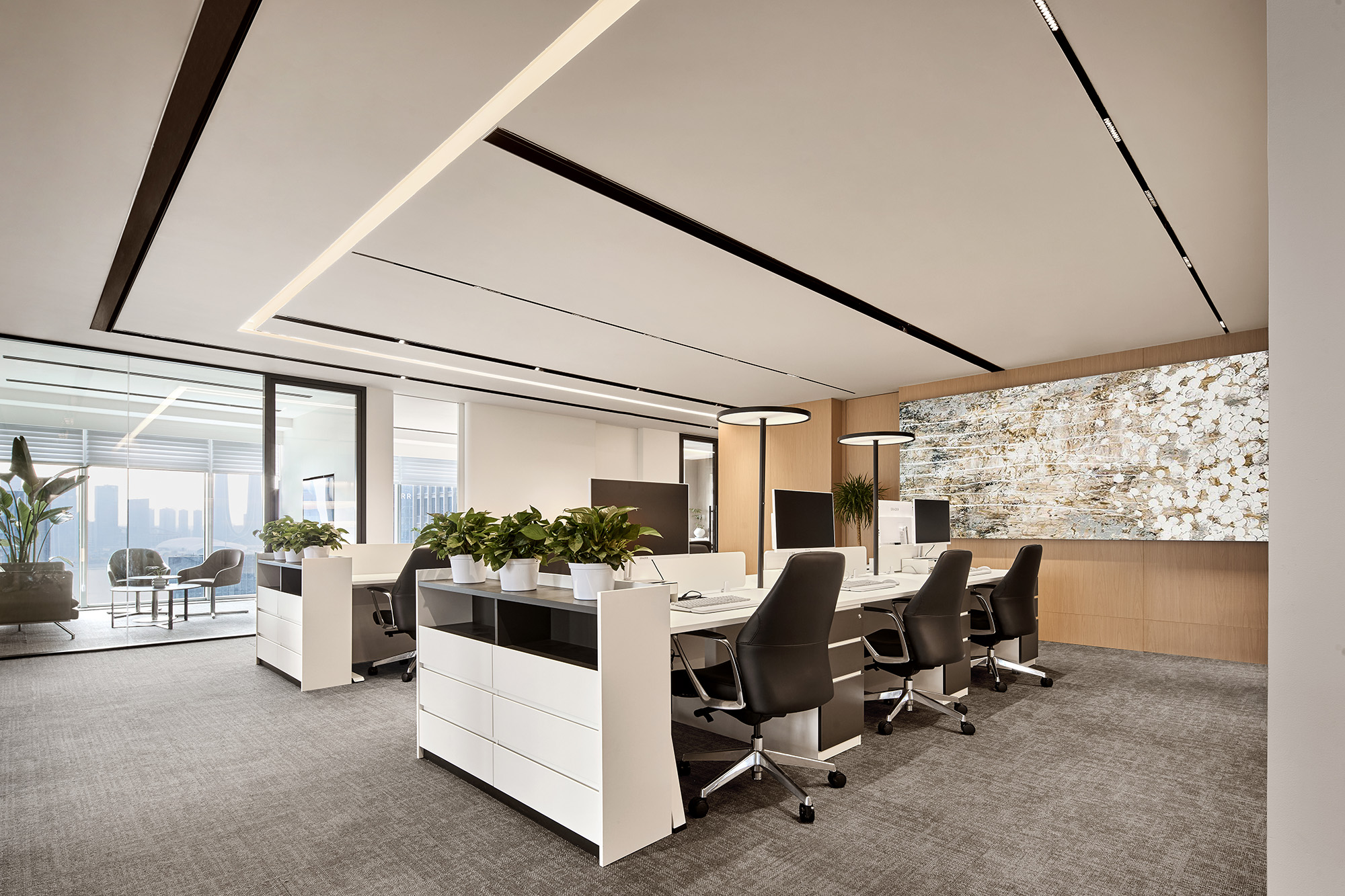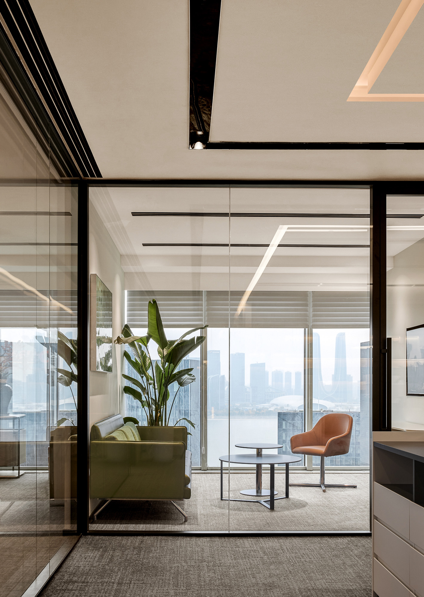 总裁室甄选实木家具,承载金融领域的深厚积淀;陈设瓷器藏品与编织地毯,勾勒隽永东方气韵。坚守“功能至上”设计内核,凭栏尽览杭州天际线,让都市繁华与室内古韵自然交融。于古今对话之间,尽显金融投资的沉稳远见与前瞻格局。