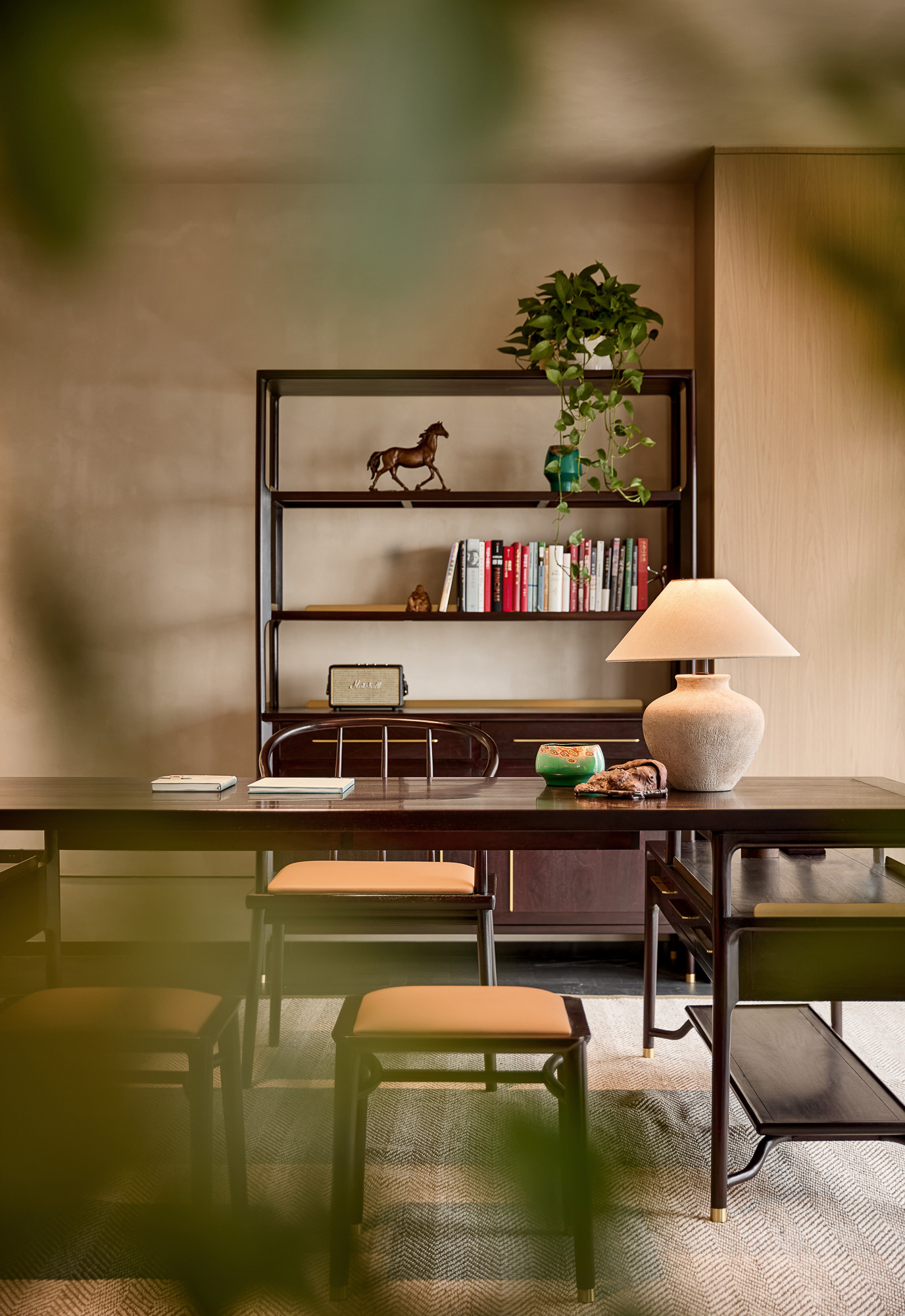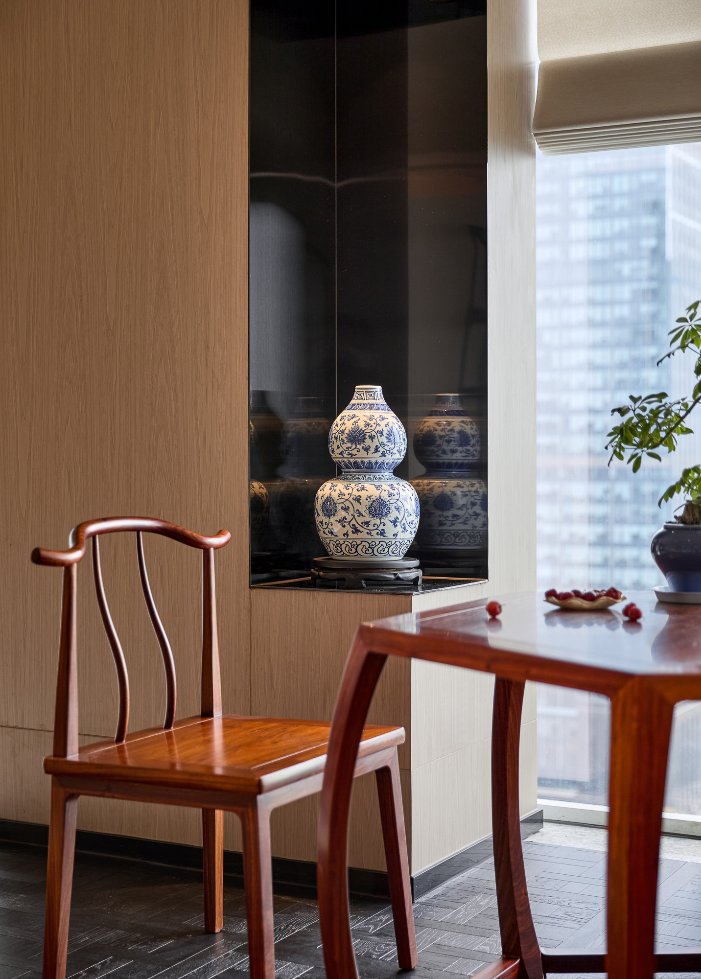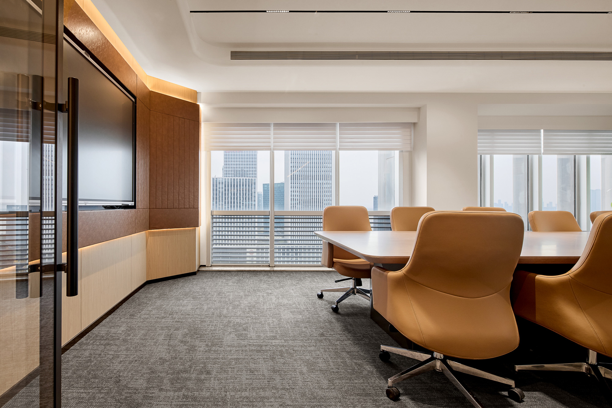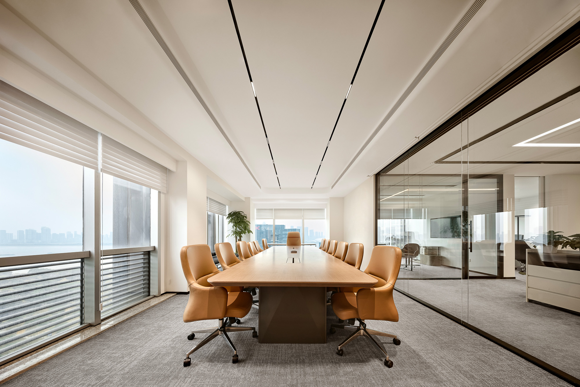 总裁室甄选实木家具,承载金融领域的深厚积淀;陈设瓷器藏品与编织地毯,勾勒隽永东方气韵。坚守“功能至上”设计内核,凭栏尽览杭州天际线,让都市繁华与室内古韵自然交融。于古今对话之间,尽显金融投资的沉稳远见与前瞻格局。