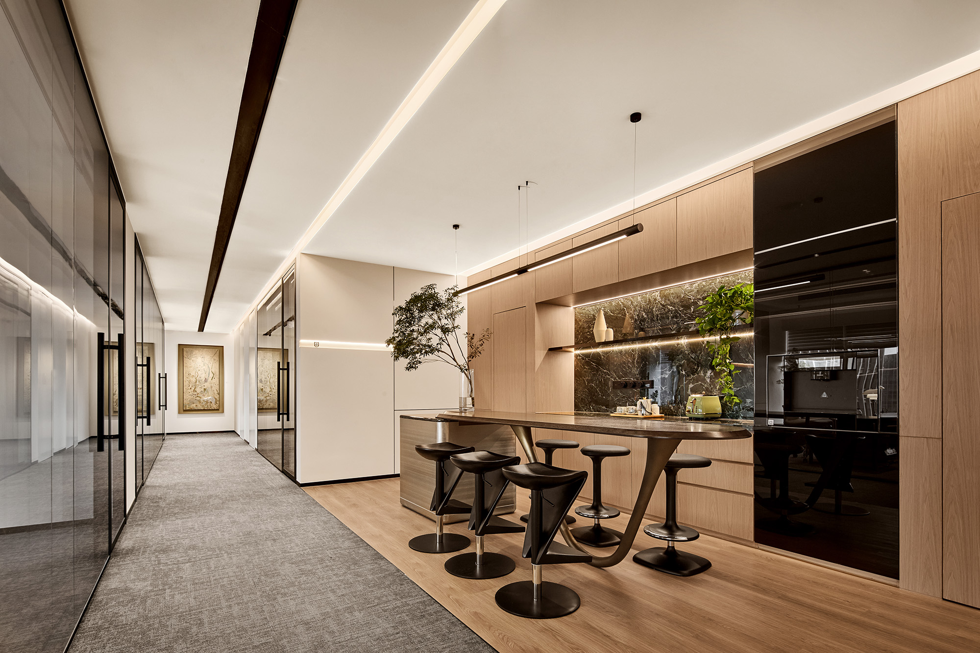 公共区的开放式茶水间,是整个办公场域的核心枢纽。空间形态可灵活切换,轻松满足多元功能需求。吧台吧椅的造型设计,与装饰吊灯、硬装结构线条形成巧妙呼应,让每一处细节都暗藏章法。既承载着日常社交的松弛氛围,又为高效协作提供了灵活场景,完美平衡了实用价值与美学质感。