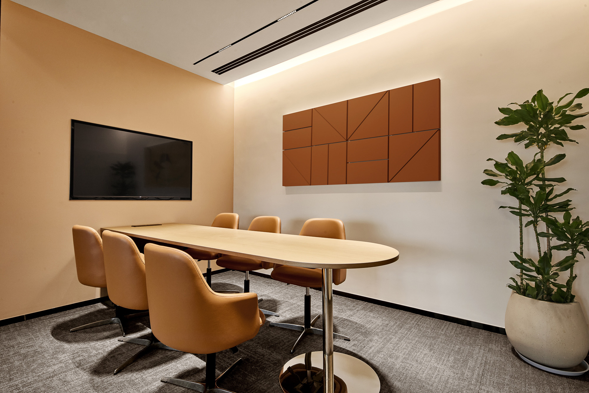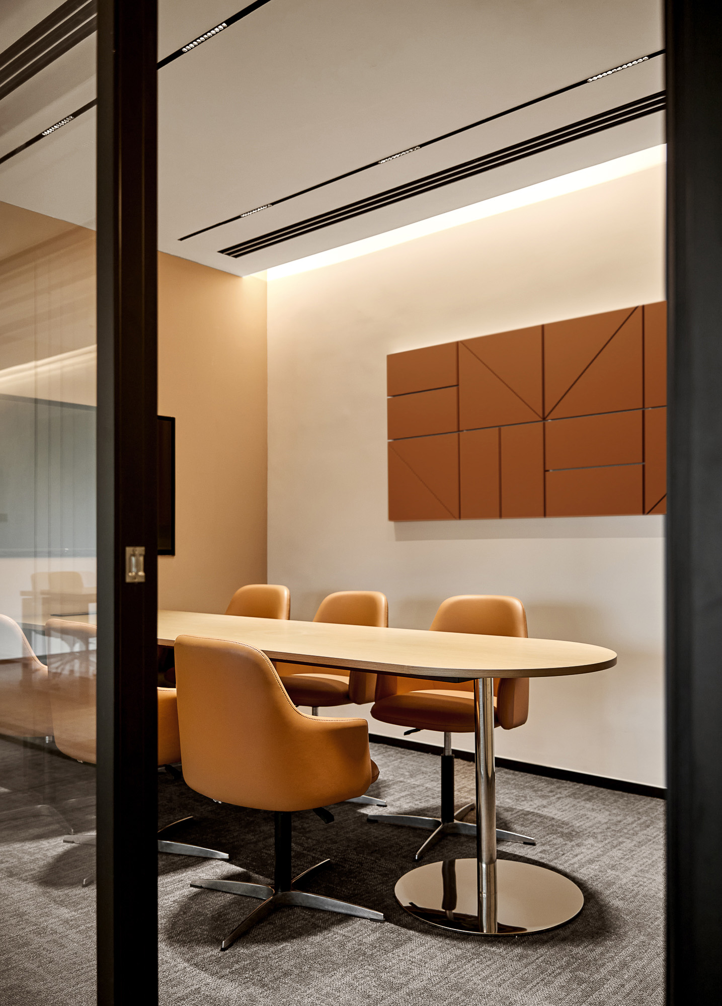 小会议室以紧凑布局营造深度交流氛围,面对面会议桌消解层级壁垒,呼应“利他为核心”的合作理念。光影透过百叶窗在桌面投下流动线条,自然光线伴同时刻思辨,让项目评审的激烈讨论、战略规划的沉静思考皆能催生洞见。暖色有机纹理装饰画,以大地色系强化沉稳严谨的空间气质,完美诠释“艺术与技术结合”的设计内核。