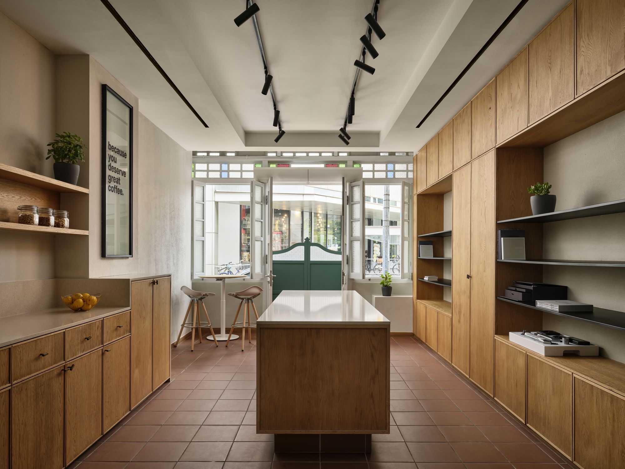 Humanscale的全新空间由两栋店屋贯通而成,构建出既保留历史韵味又满足现代功能的开阔首层格局。空间内嵌两处采光天井,倾泻而下的自然光影与镶嵌传统花窗的彩绘玻璃立面相映成趣,加之横向延展的矩形玻璃窗阵列,共同构筑出温馨通透的街景视觉体验。