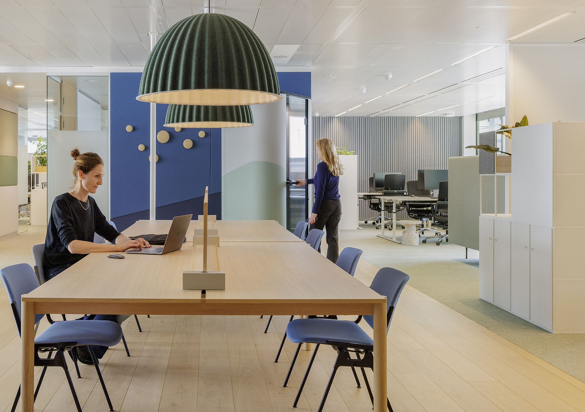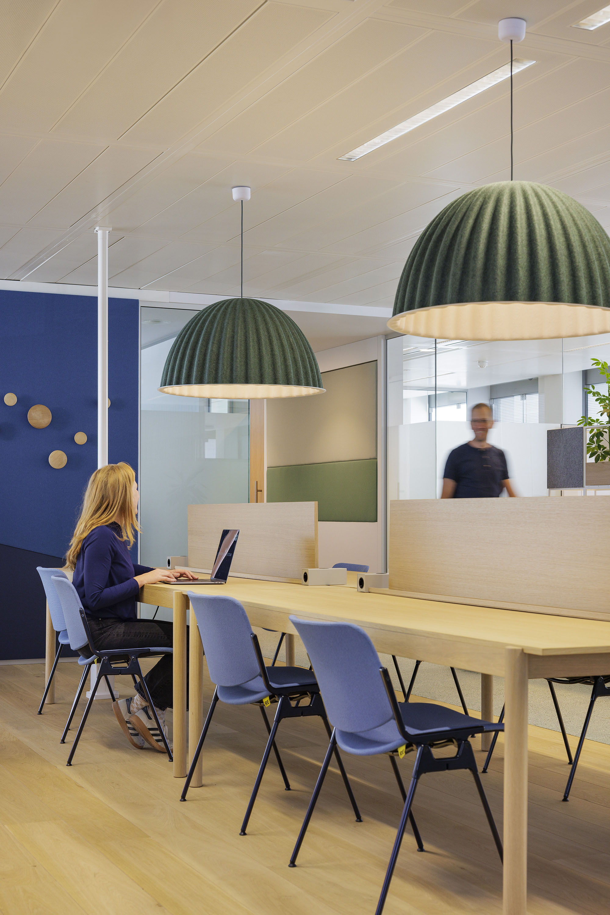 基于这一任务要求,设计团队开发了一套混合办公空间概念,并将其应用于分布两个楼层、总面积达1,700平方米的办公空间中。