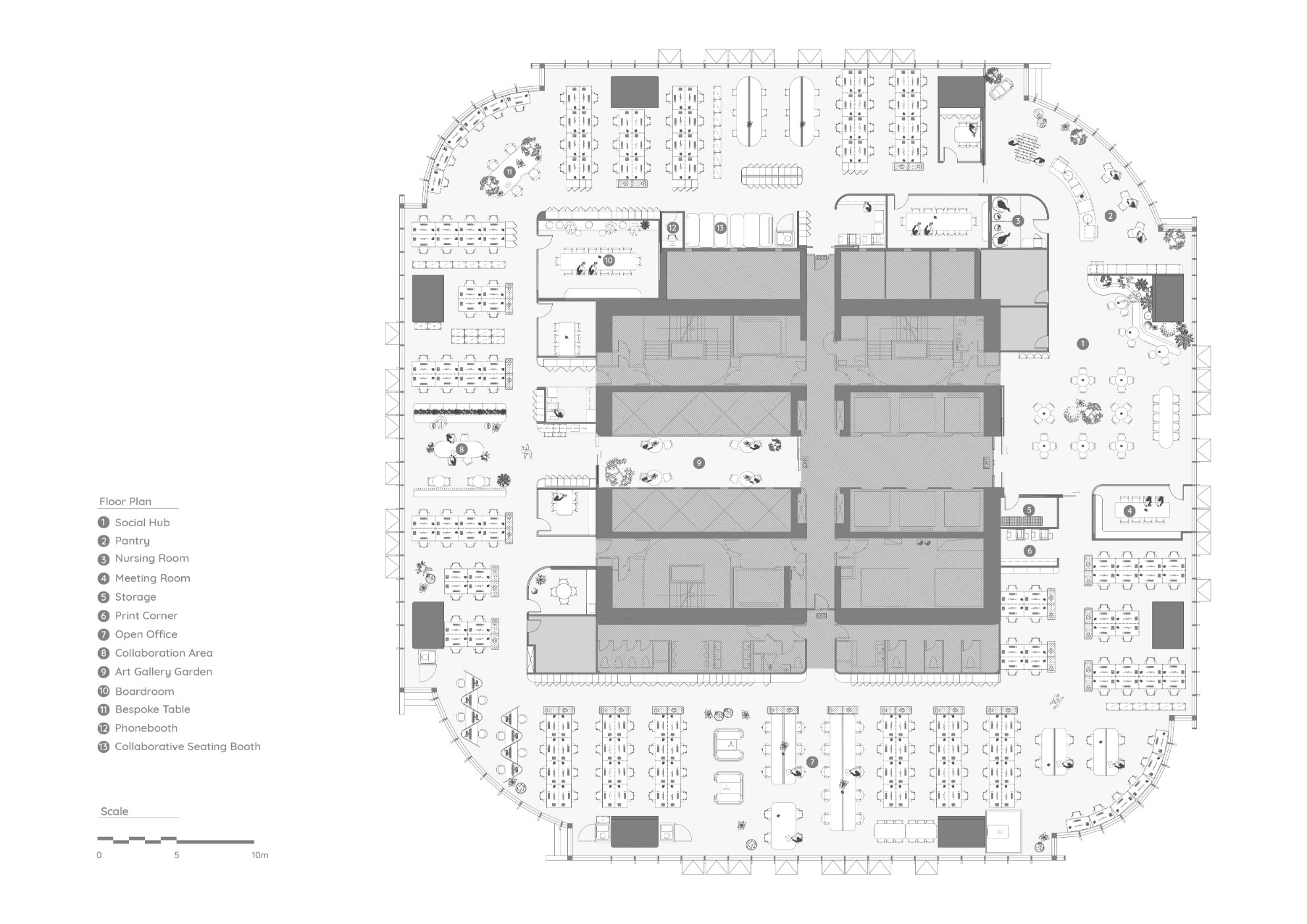 每一层的核心亮点,是一个旨在呼应“Mangrove Garden(红树林花园)”丰富生态的中心枢纽区。这一温馨区域以多样的热带植物和仿若红树林形态的结构元素加以点缀,赋予了空间独特的活力与标识性。这些结构也固定了形状独特的座椅布局,从而促进了社交互动与团队协作的文化。
