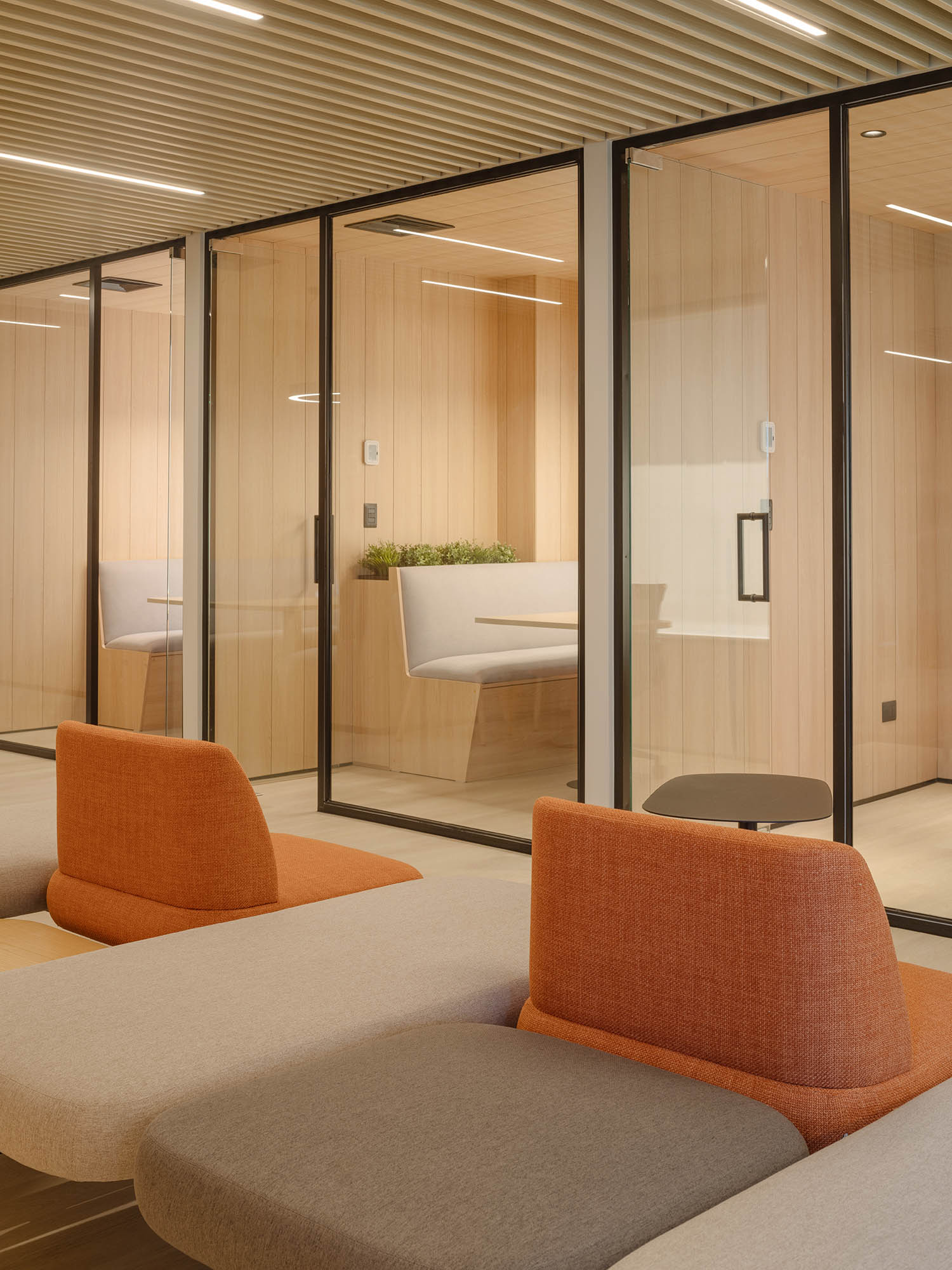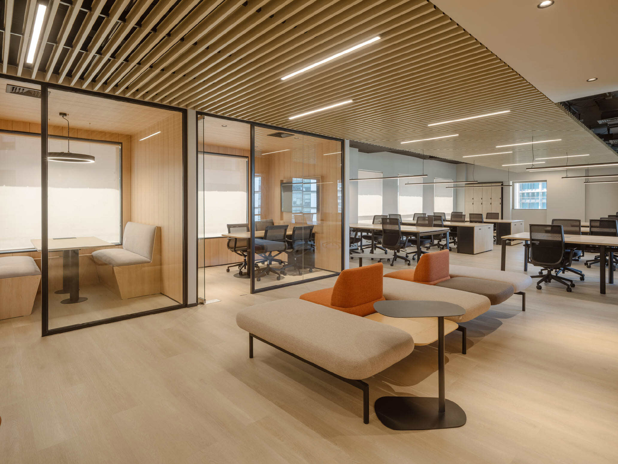 此次设计委托的另一核心述求是提升办公室的声学舒适度。为此,整个空间铺设了连续统一的乙烯基地板。同时,会议室采用绒面声学挡板吊顶,在降低层高的同时有效控制声场混响。