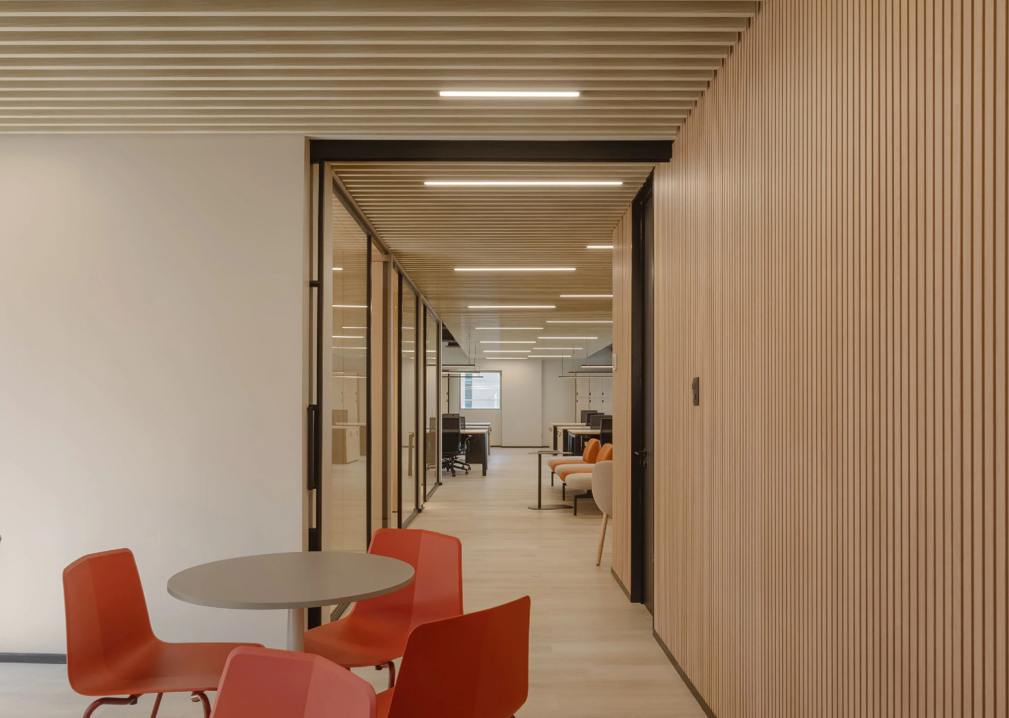 在材料选用上,设计团队致力于为空间注入温暖感与通透性。设计以智利松木原生色调为主基调,局部运用黑色元素提升现代感。家具搭配选用陶土橙、暖橘、水绿及高级灰作为点缀色,并融入陶艺花器装饰,以自然绿意凸显办公空间中植物景观的生态效益。