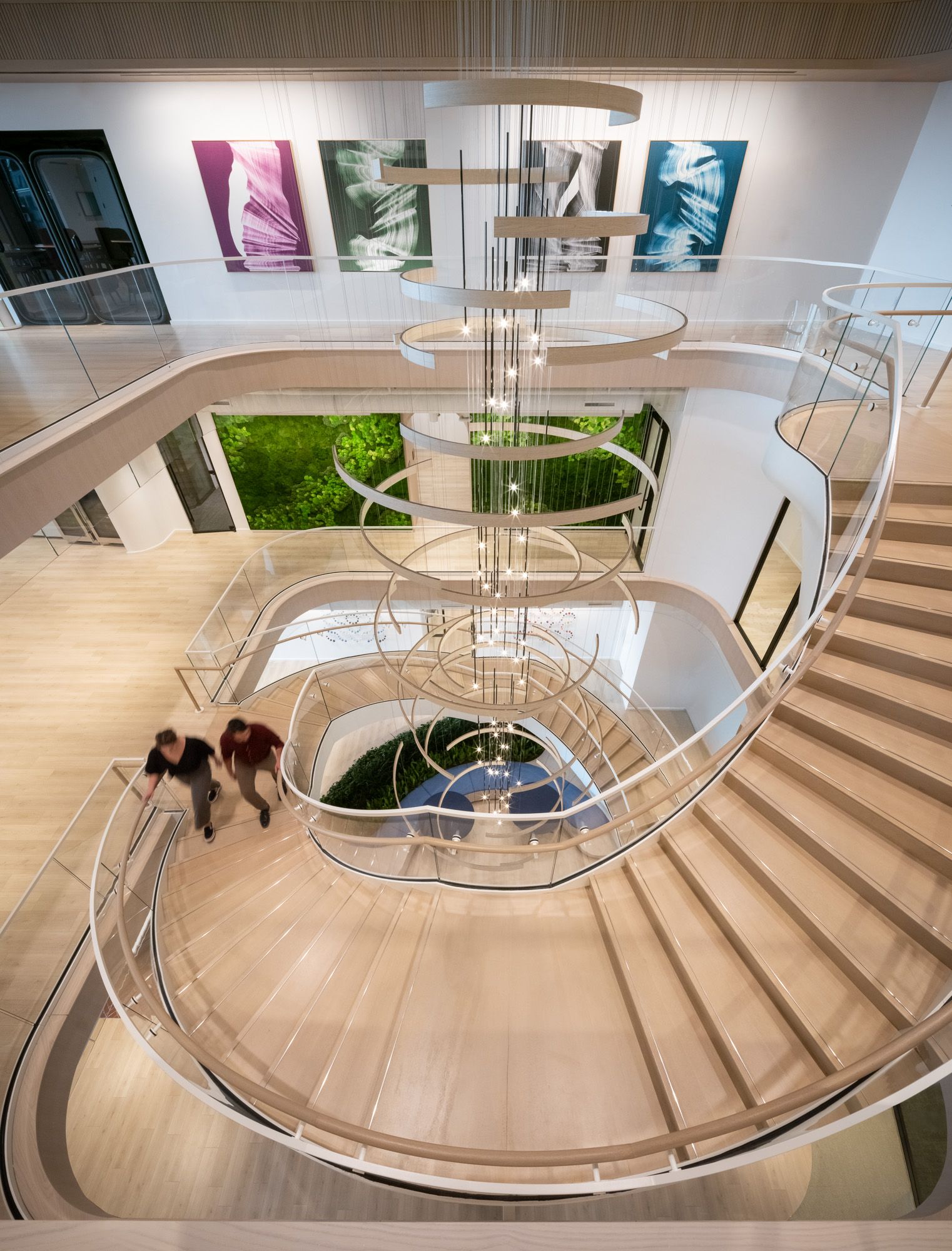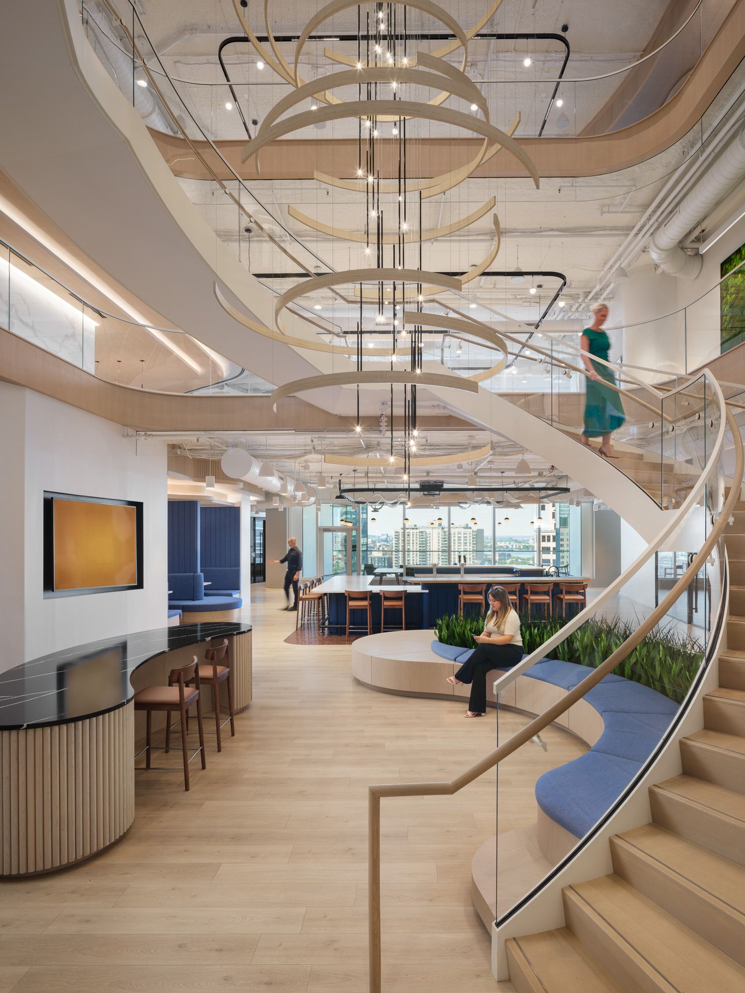 该项目的设计核心围绕一座贯穿三层办公与配套空间的弧形楼梯展开,在满足严格规范与结构要求的同时,成为连接各功能区的视觉焦点。其设计灵感源自波士顿标志性的灯塔意象,这座雕塑般的造型楼梯装设了跨越三层空间的定制吊灯,宛如指引方向的灯塔。