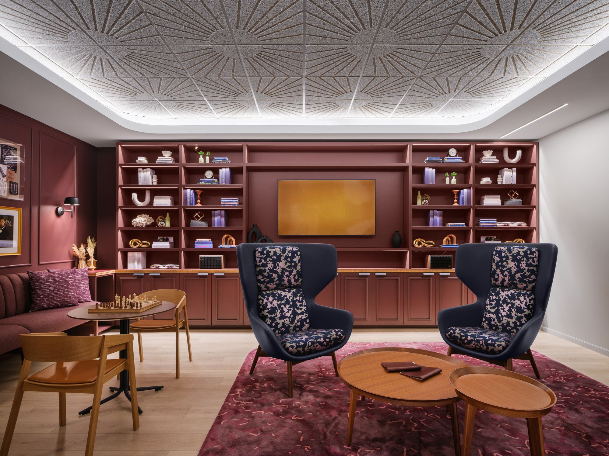 海洋蓝、大地棕与暖调夕霞绛红构成不同工作社区的标志性色彩体系;声学天花板构件在超大面积的楼层中亦可有效辅助空间导引。科技感十足的客户中心则运用深邃暗色调饰面,并结合混凝土与烟熏玻璃隔墙,营造出精致商务的质感。项目中广泛采用的无障碍设计解决方案,后续更成为客户制定其全球通用设计标准的范本。该项目荣膺LEED v4商业室内铂金级认证及二星级Fitwel健康建筑认证。