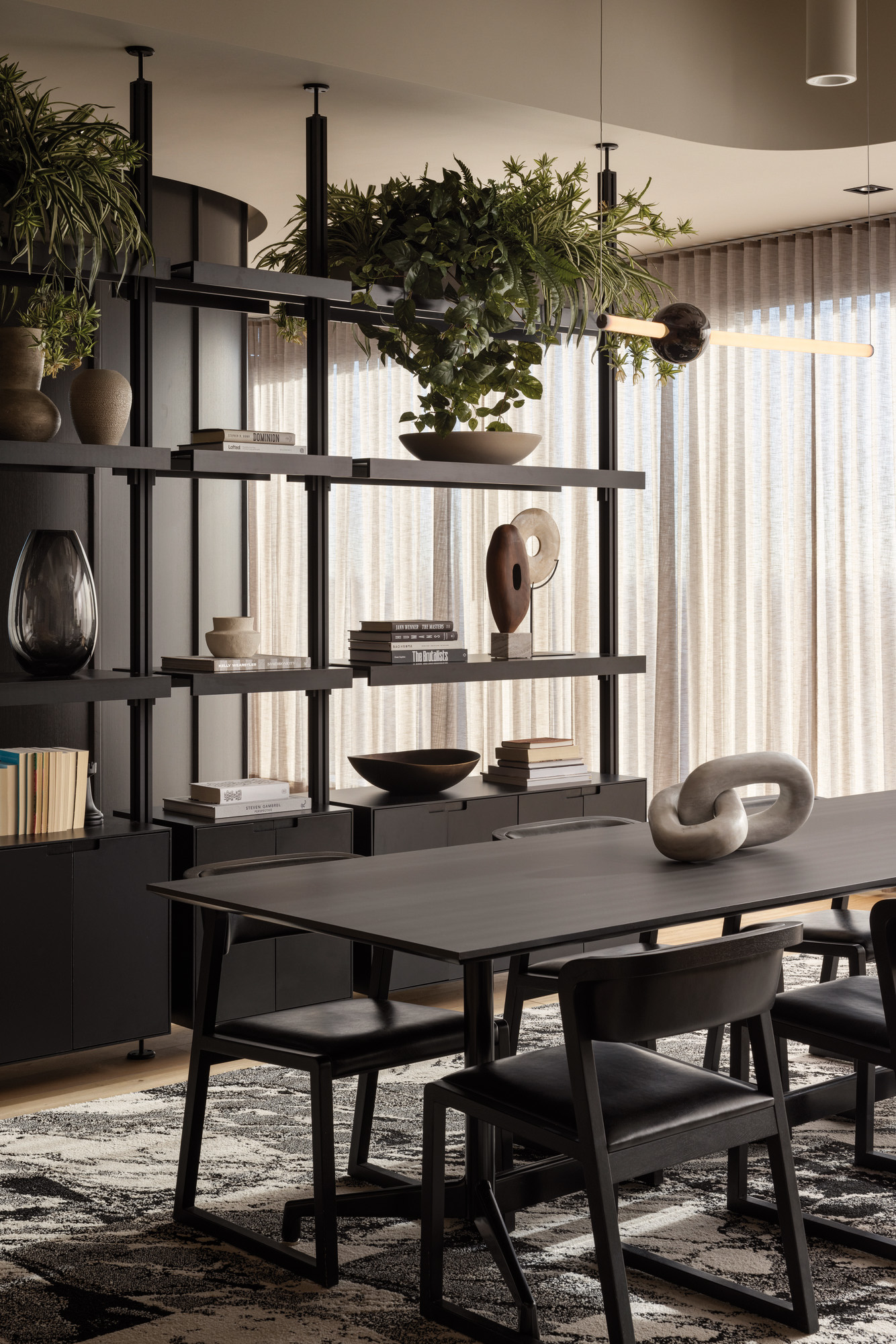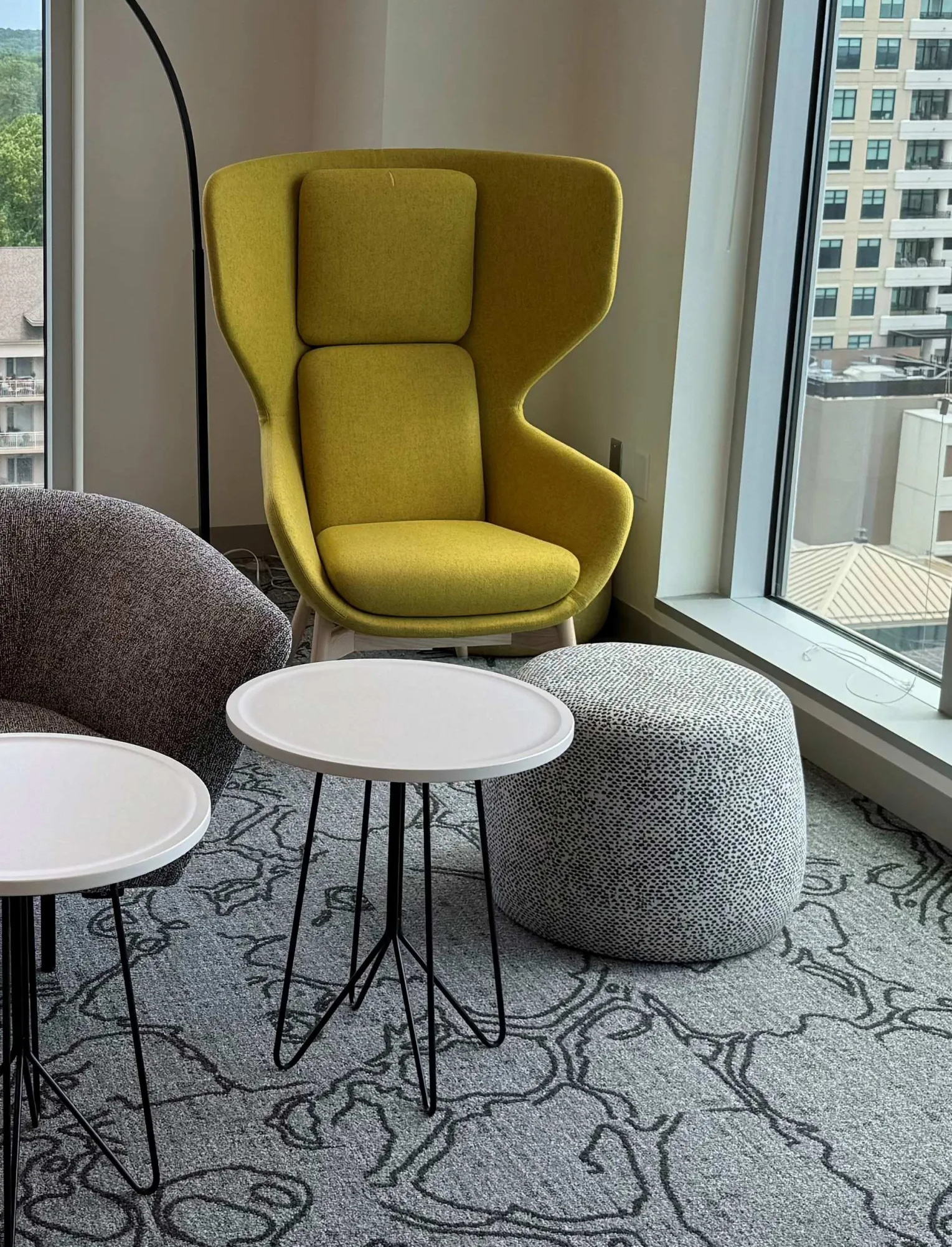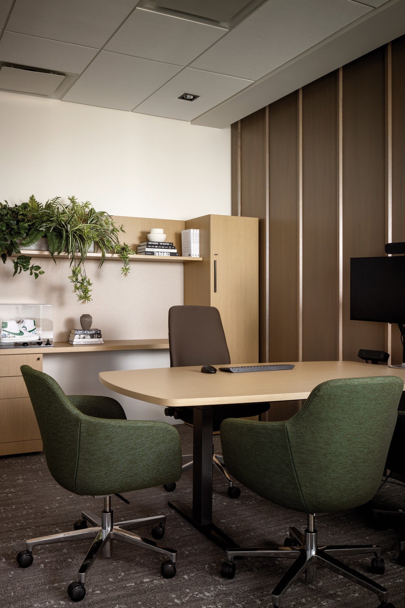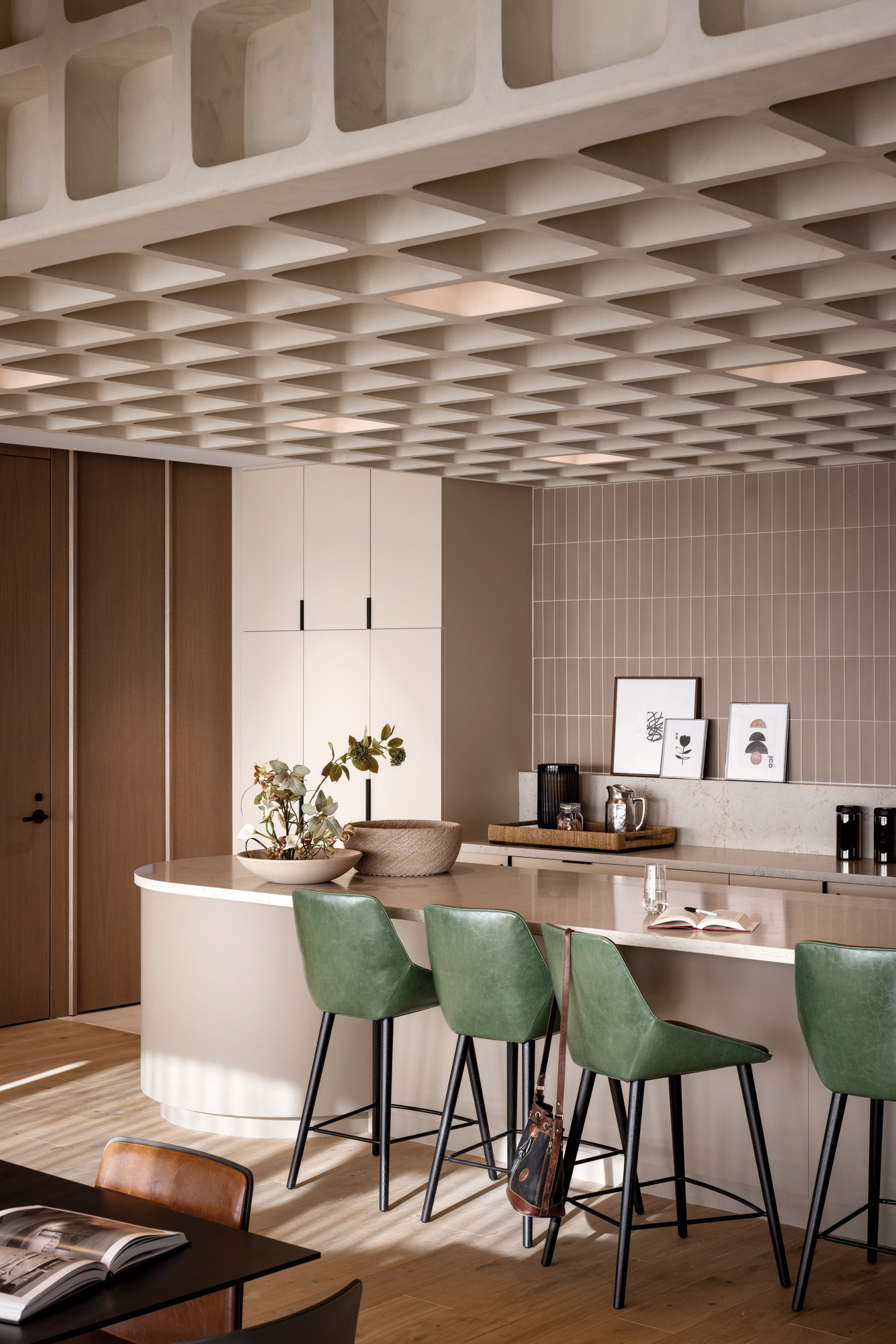 为延续原办公空间的视觉脉络,HOK在既有设计框架中叠合酒店风格的材质语言。深邃的黑木饰面、格纹地毯、精选墙布与生态元素点缀相互交融,为空间注入温润雅致的质感。咖啡区手工打造的华夫格造型天花板成为独具匠心的视觉锚点,进一步提升了空间的精致度。