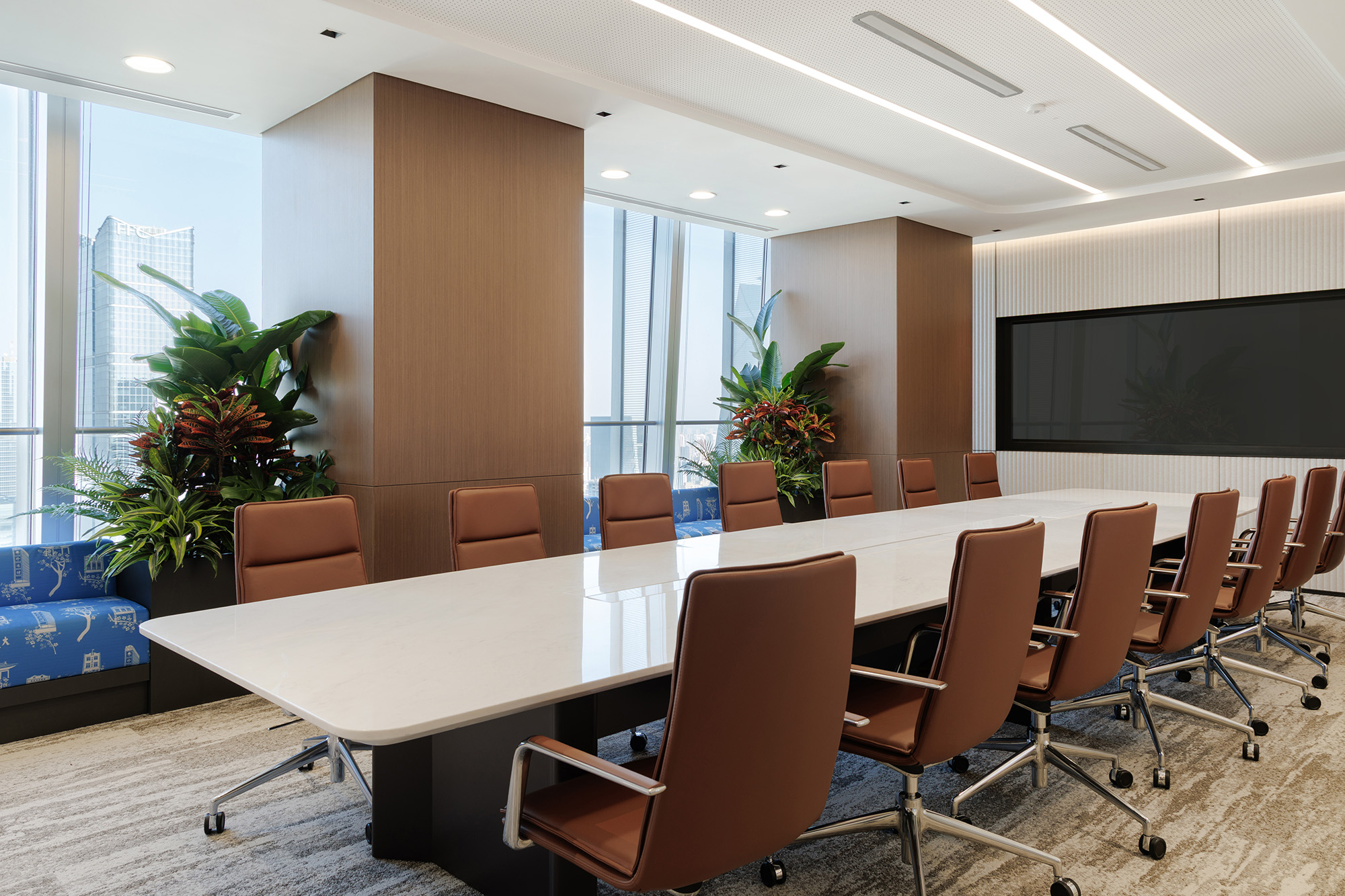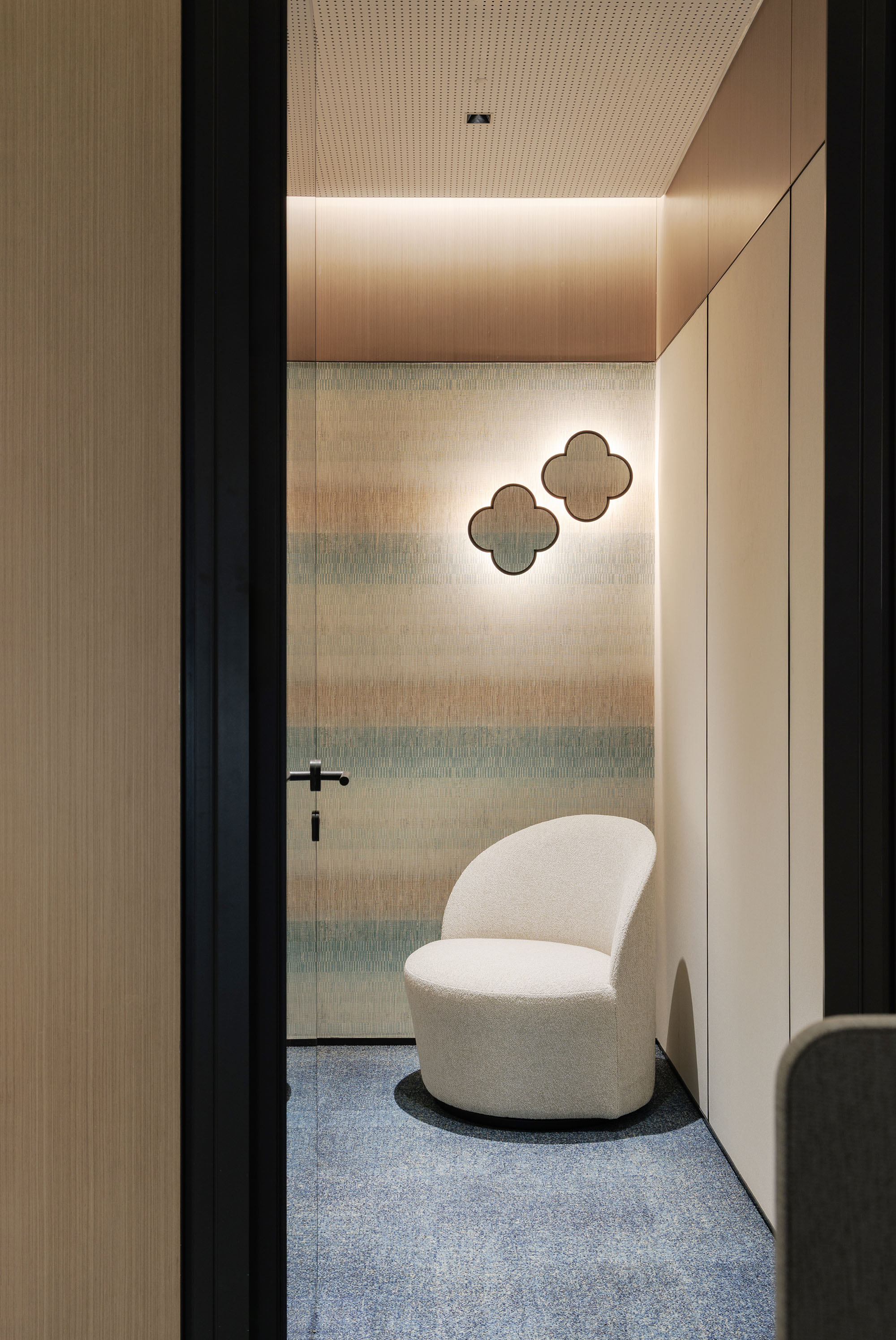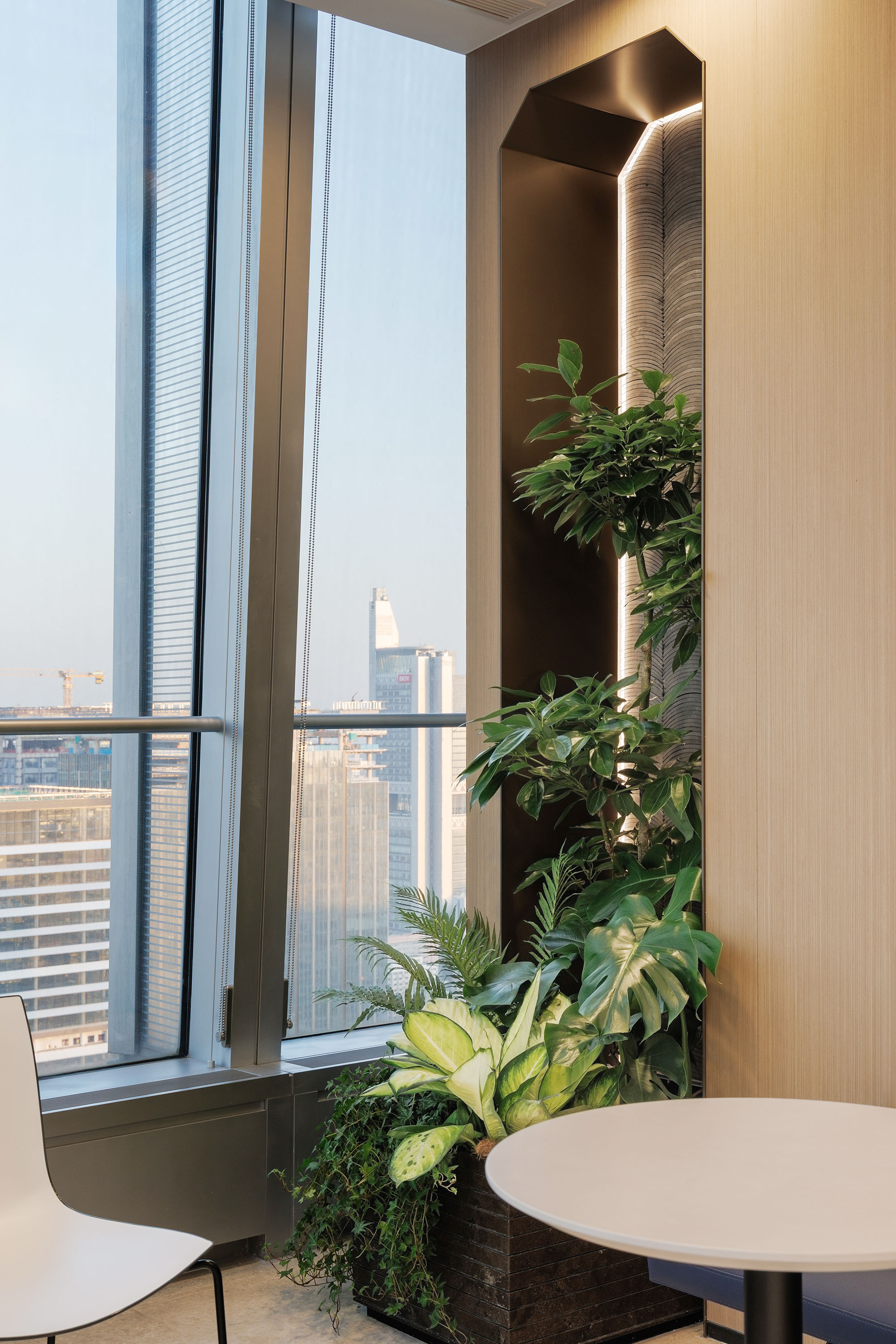 材料质感强调温暖与触感:米色石材、纹理橡木、胡桃木以及环保饰面构成了沉稳的基调,并辅以精心布置的绿植,含蓄地暗示了该客户的新加坡渊源。声学舒适性、人体工学系统与智能照明在整个空间中无缝集成,以含蓄而优雅的方式支持着工作环境的清晰度、专注度与能源绩效。