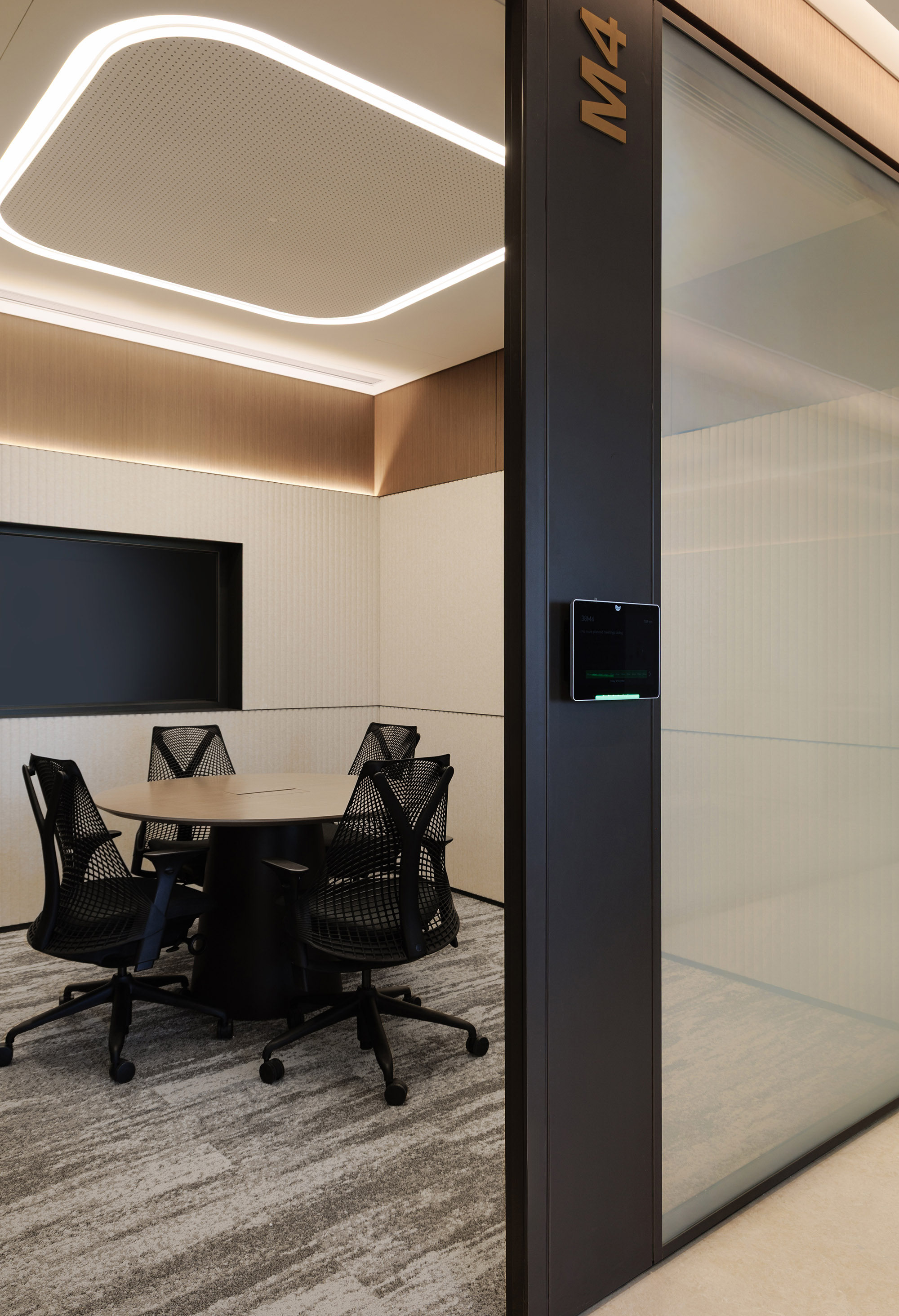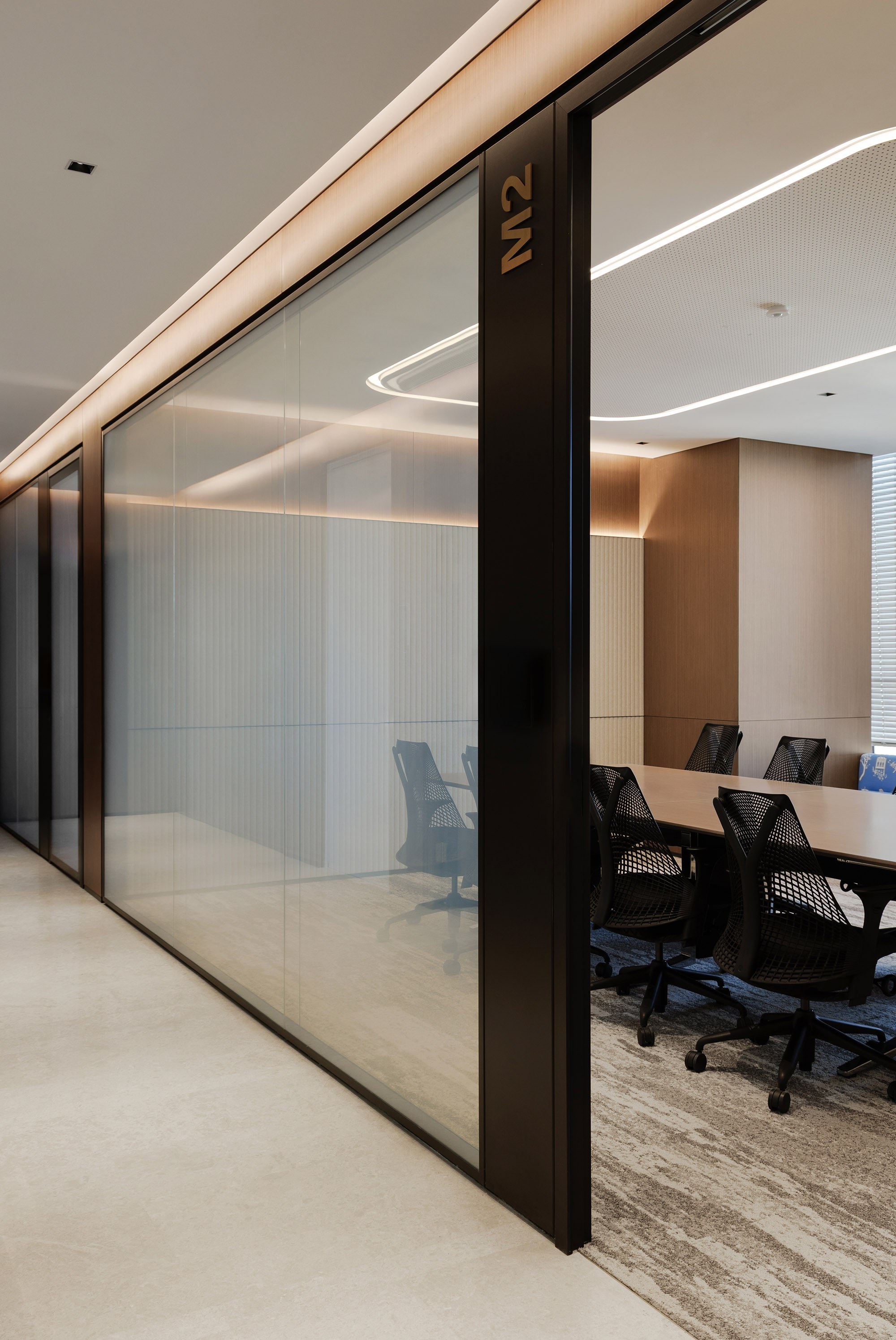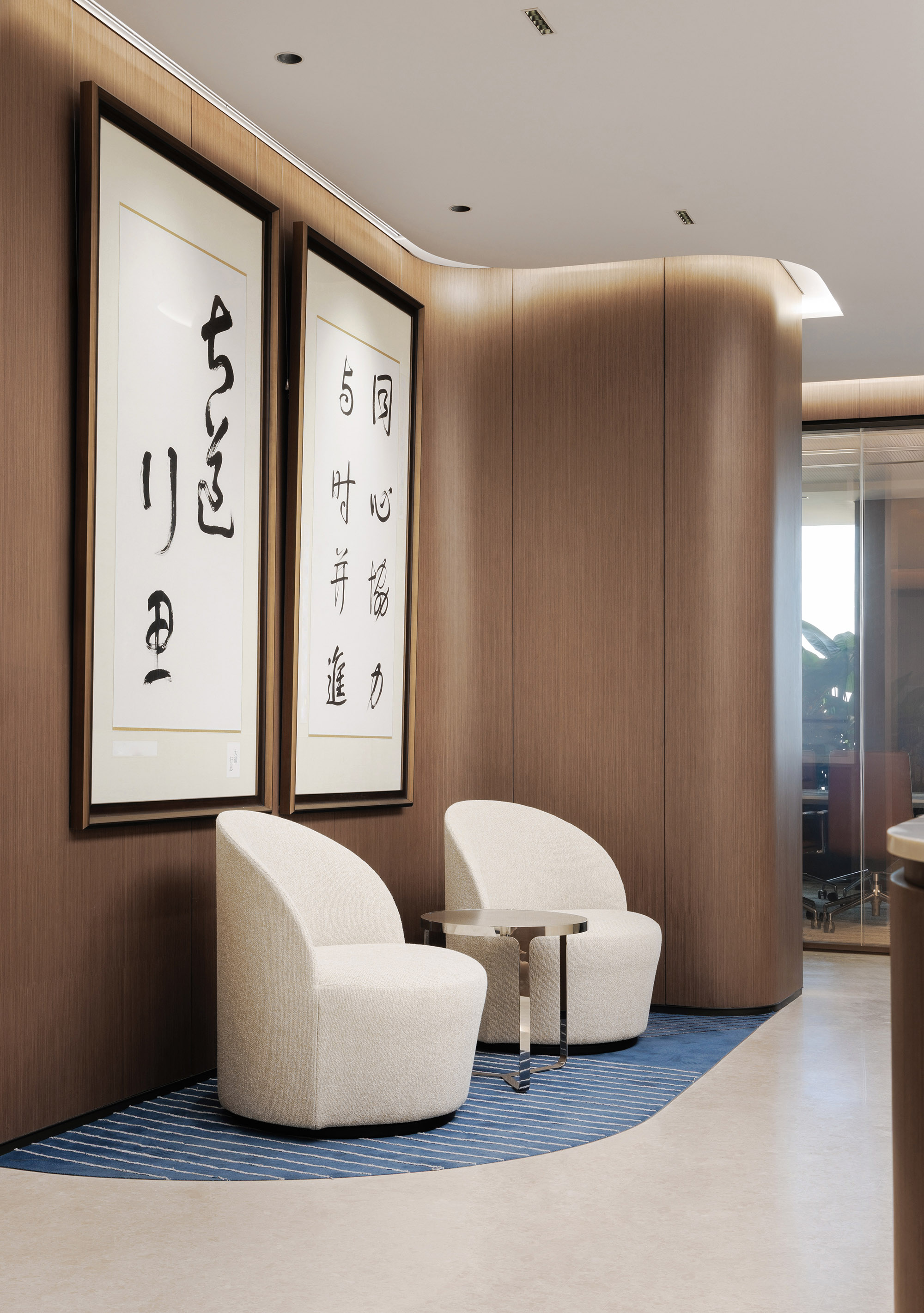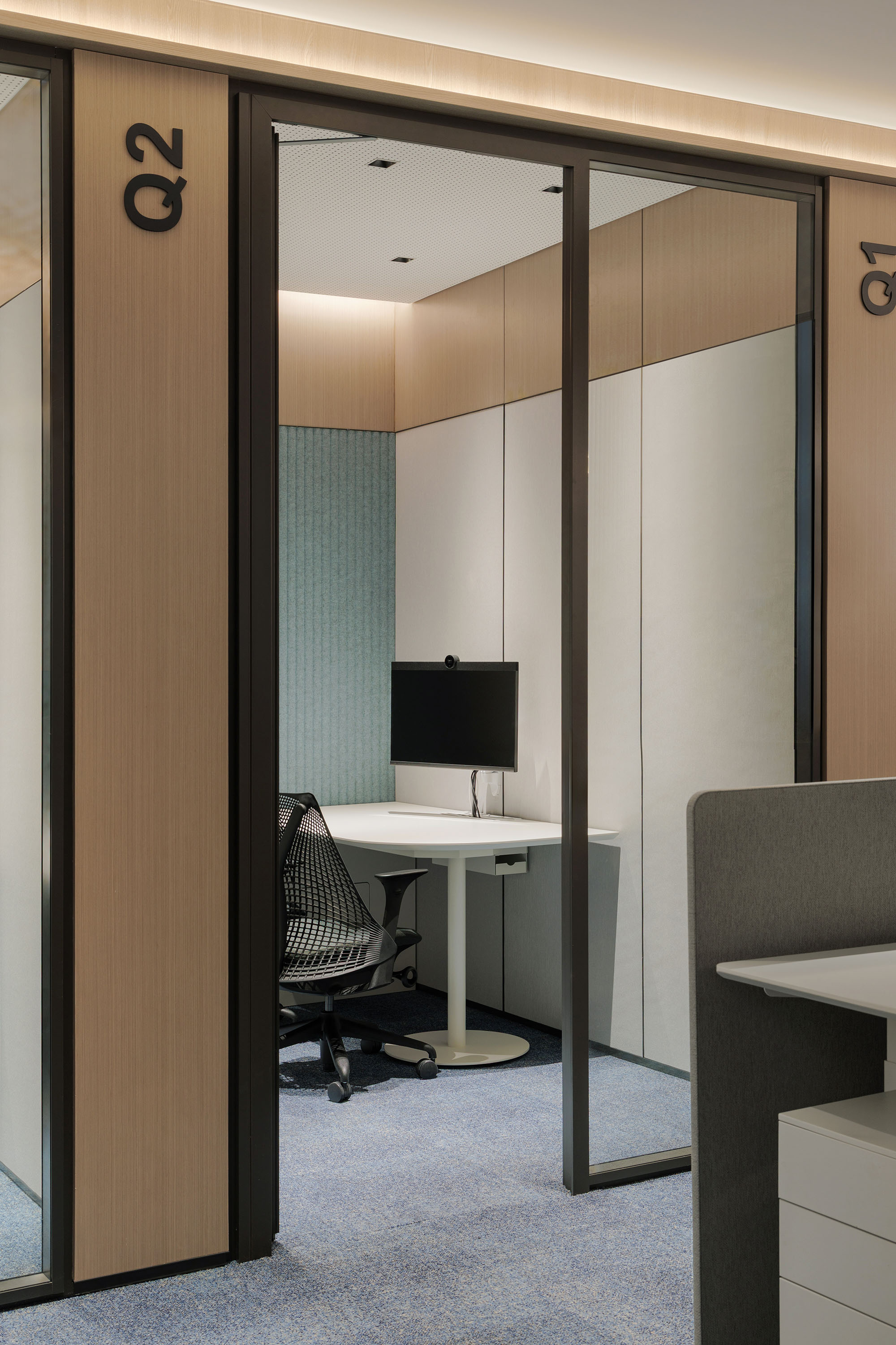材料质感强调温暖与触感:米色石材、纹理橡木、胡桃木以及环保饰面构成了沉稳的基调,并辅以精心布置的绿植,含蓄地暗示了该客户的新加坡渊源。声学舒适性、人体工学系统与智能照明在整个空间中无缝集成,以含蓄而优雅的方式支持着工作环境的清晰度、专注度与能源绩效。