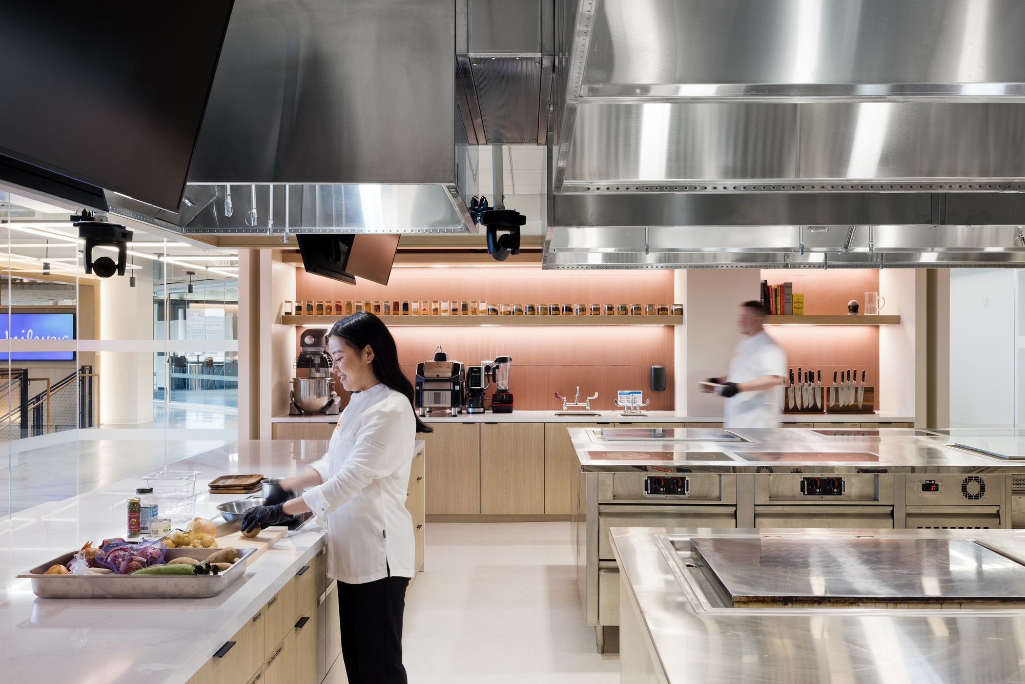 新总部的核心是一个支持联合利华餐饮解决方案的专业级厨房,厨师们在此使用Knorr、Hellmann等自有标志性品牌研发新食谱。旁边,一家提供全方位服务的美发沙龙展示着Dove、TRESemme 和 Nexxus 的美妆与健康产品,让团队能够亲身体验产品效果。一间公司超市则按照面向消费者的陈列方式排列货架,展示联合利华的全线产品,使员工能够从顾客的视角感受自家品牌。
