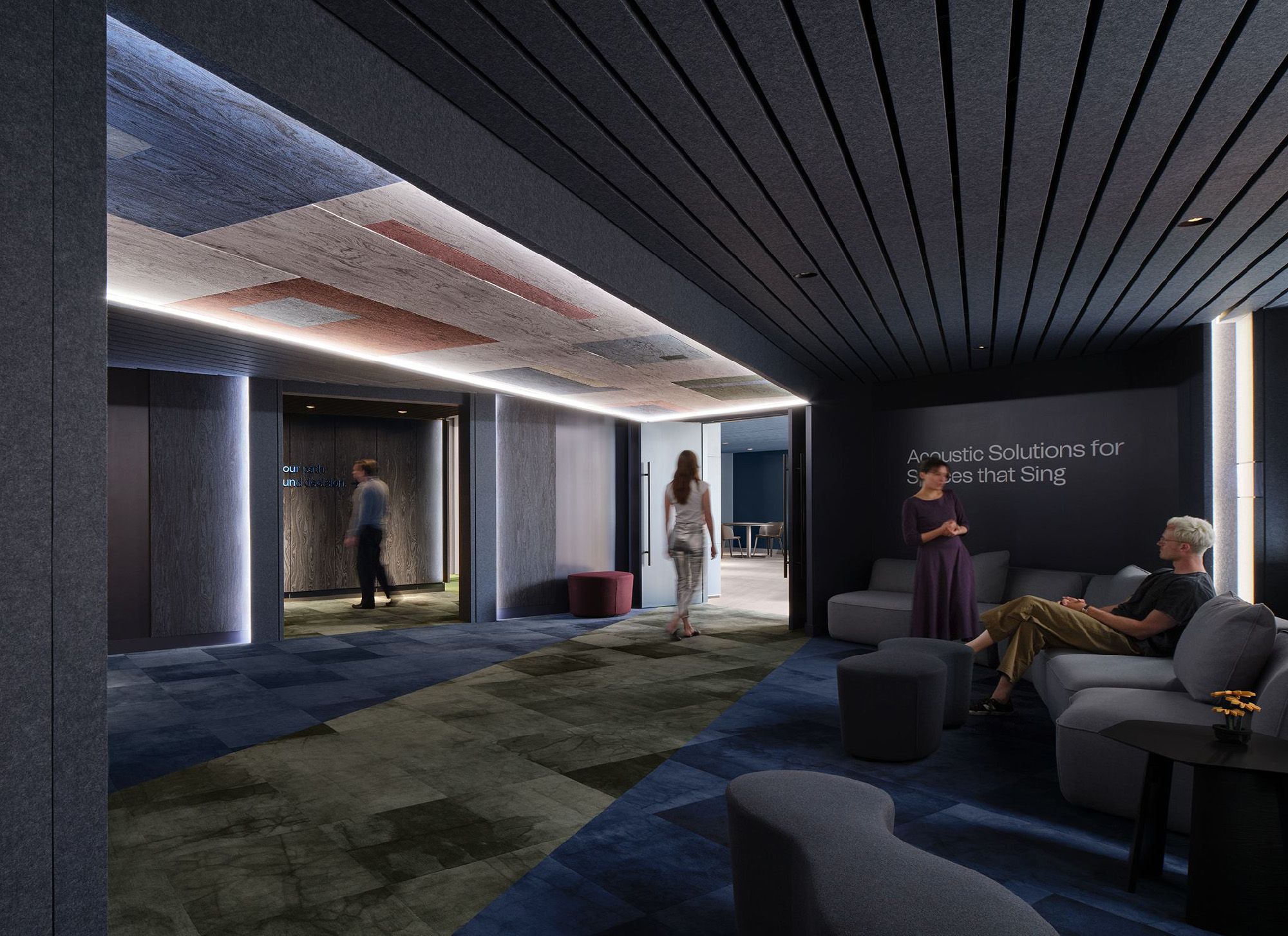 作为Turf位于伊利诺伊州吉尔伯茨工厂的微型缩影,原型实验室让客户与合作伙伴得以直击Turf产品线与研发流程,并与设计团队实时协同共创。现场配备Turf自有全尺寸CNC数控机床——这套集切割与标记功能于一体的系统,正是Turf将毛毡转化为声学解决方案的核心设备——客户与访客将深度见证Turf设计流程从构思到成品的完整闭环。