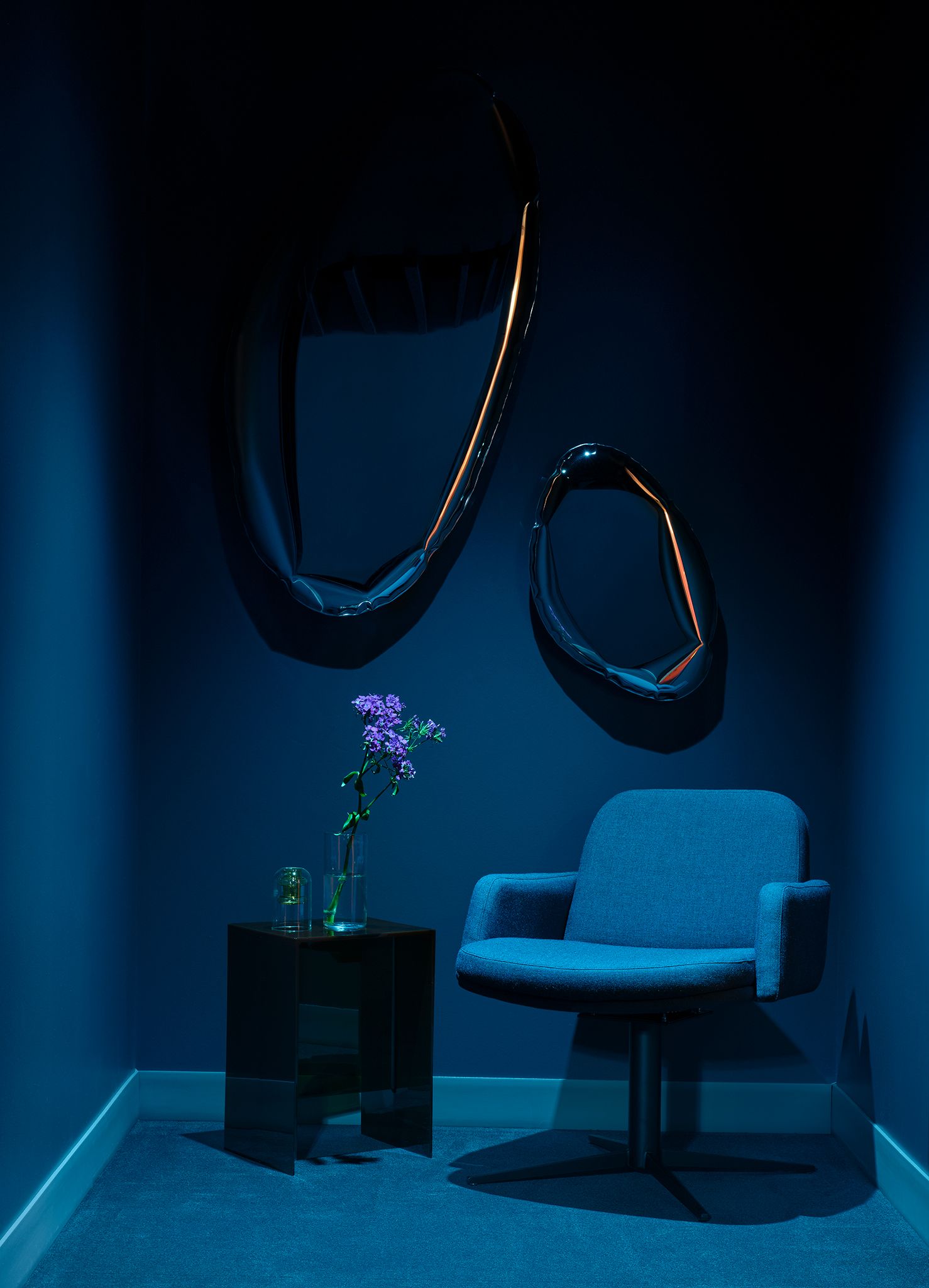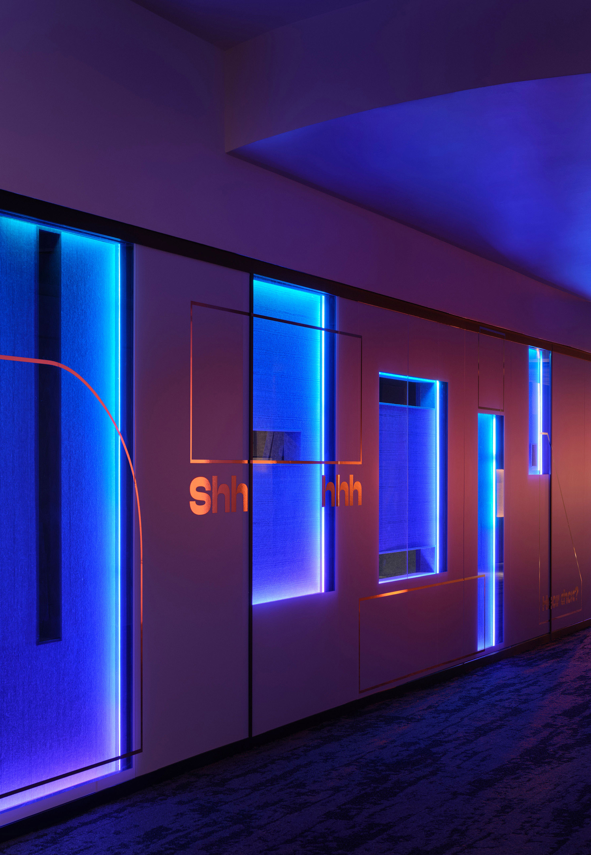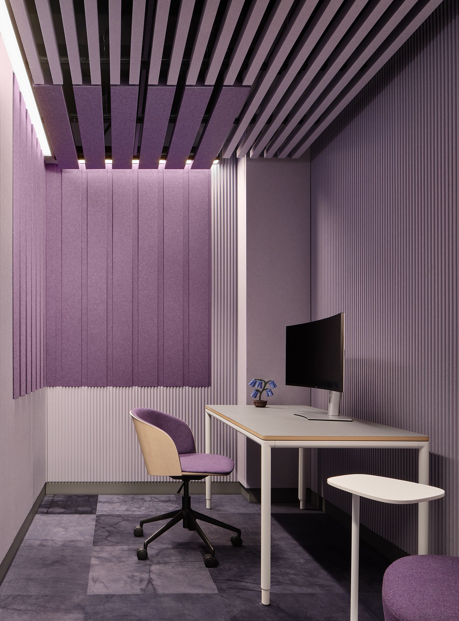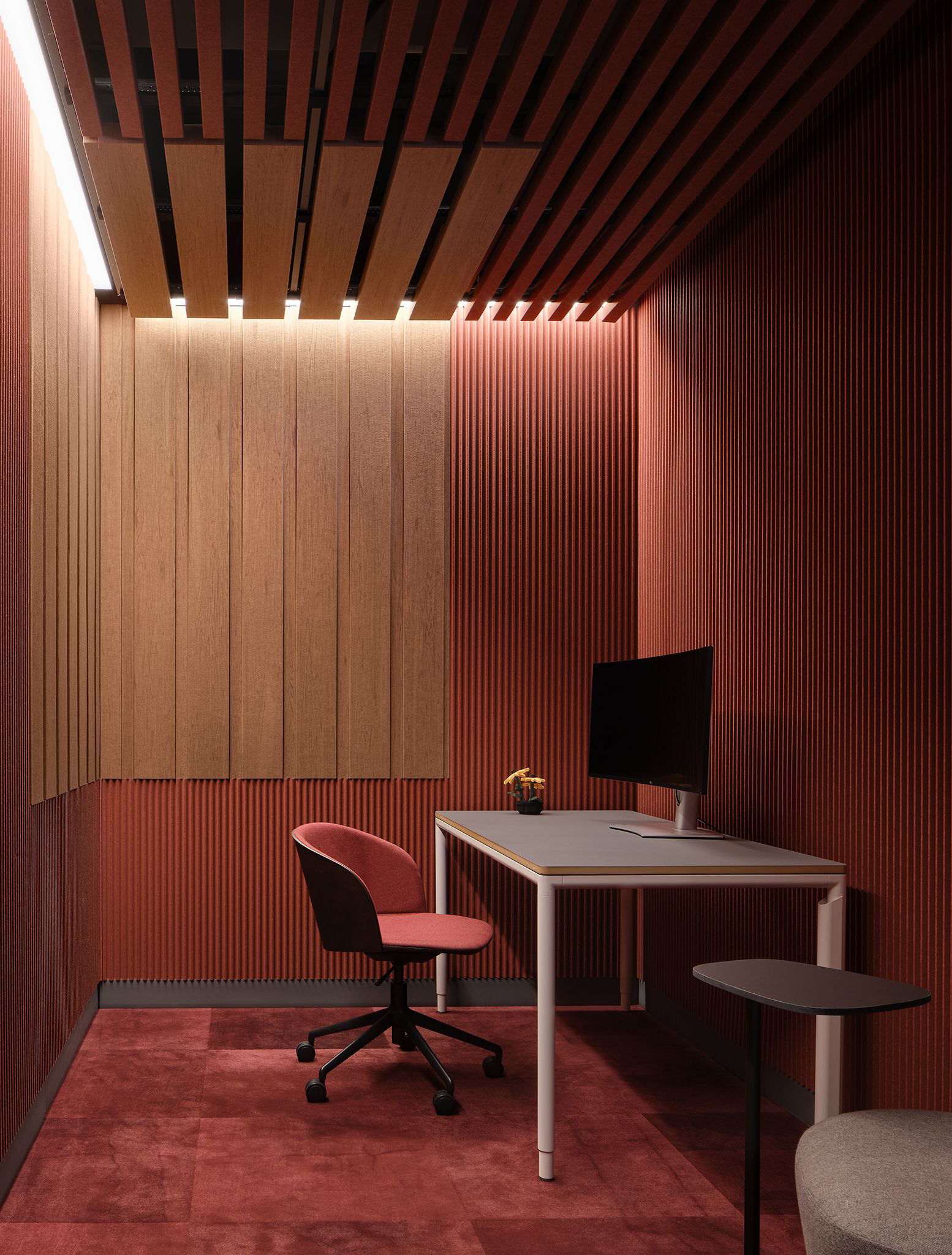 私人办公室同样考虑了视频会议场景的需求。墙面巧妙陈列Turf的声学解决方案,既是吸音功能体,又成为赏心悦目的视频会议背景。一处点睛之笔在于定制化的Turf装置,将管道系统匠心独运地转化为兼具建筑美感与导视功能的视觉元素。
