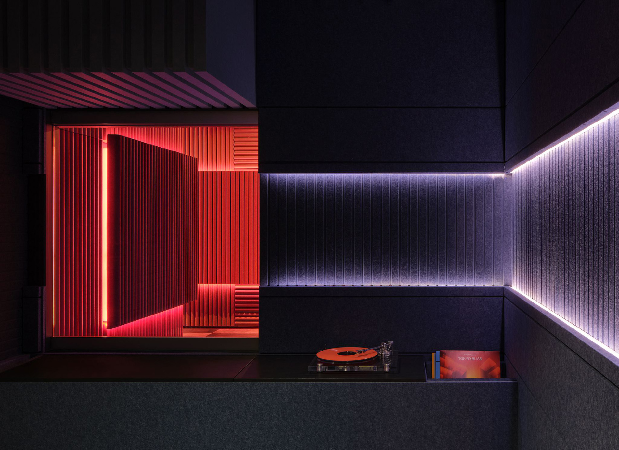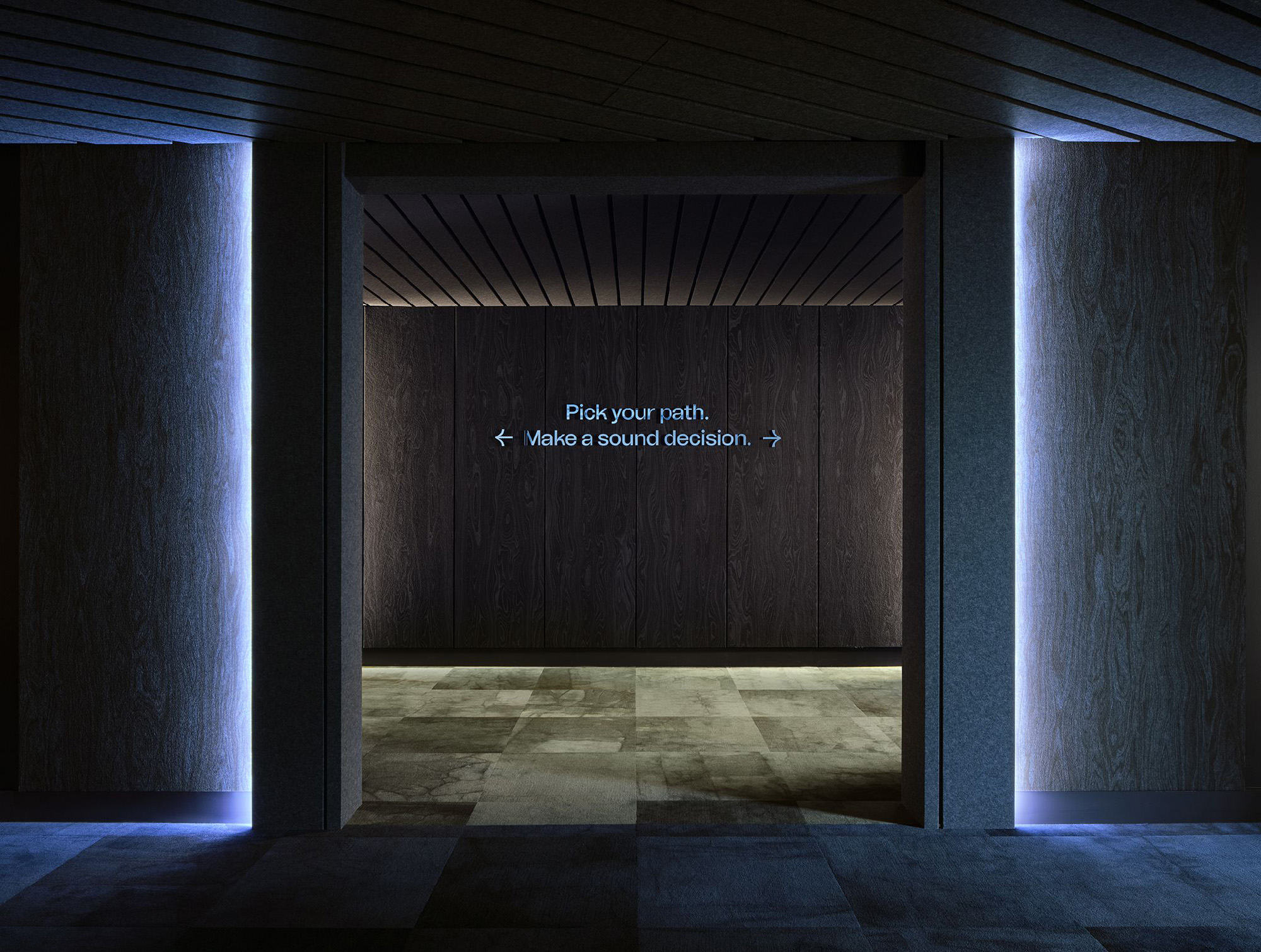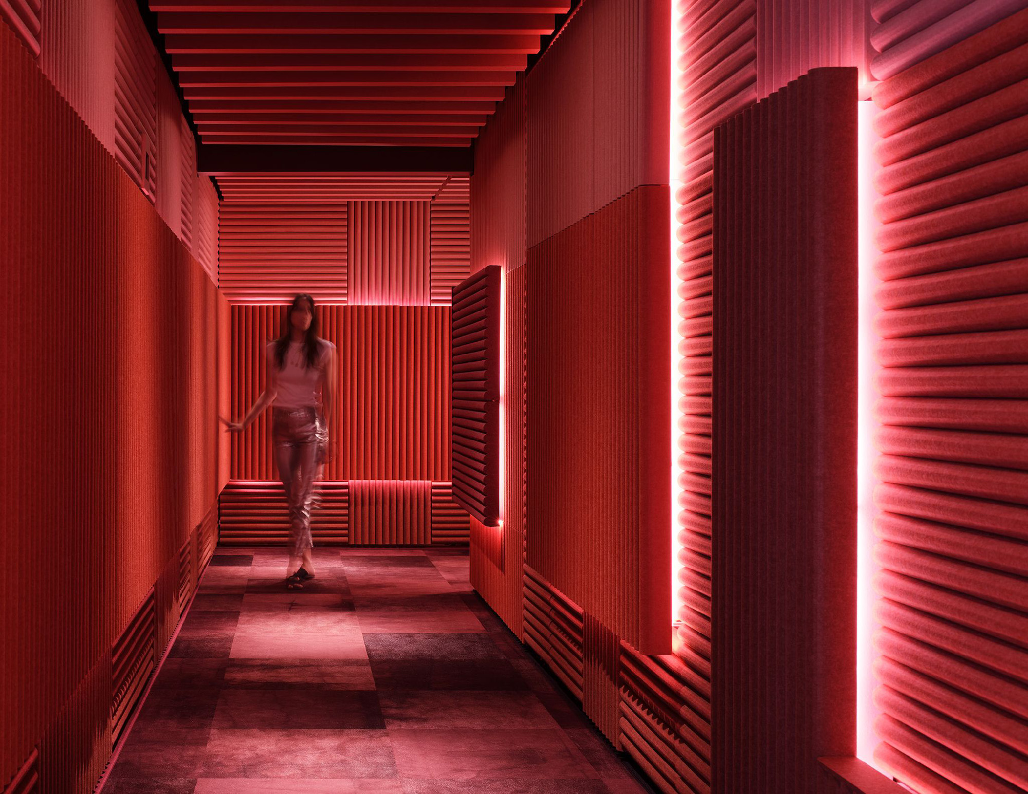 展厅为访客打造了一场沉浸式探索之旅,通过两条风格迥异的“路径”,全方位展现创新材料的无限可能,演绎Turf产品的多元魅力。步入其中,访客将面临一次自主选择——穿越入口门廊,开启个性化的体验之旅。一侧是活力洋溢的明快路径,洋溢着玩趣盎然的亮粉美学;另一侧则以深邃神秘的暗调氛围,构筑起私密亲和的沉浸场域。两条路径本身就是一场序章,引领人们感知Turf产品通过不同选择与应用所能营造的广阔情绪光谱。两条路径两侧均点缀着精致的场景化展示;沿途设置的“对望点”巧妙提供了窥见另一条路径的视角,以此彰显品牌的多面性。