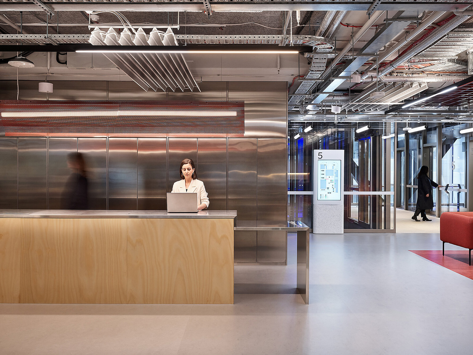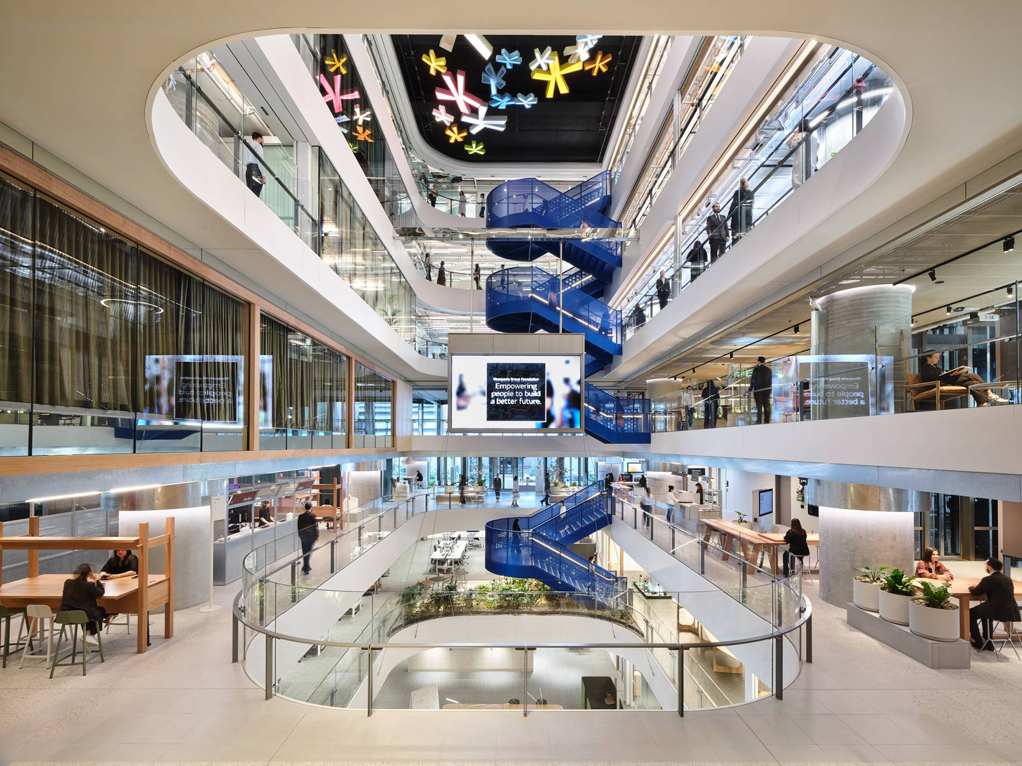 横跨中庭的是一座醒目的钢制楼梯,其采用了“悉尼蓝”色调,令人联想到这座城市的天际线与海港风光。这座楼梯贯通所有办公楼层,旨在鼓励非正式的互动交流,并形成贯穿整栋建筑的开放视野,从而增强空间的连通性。
